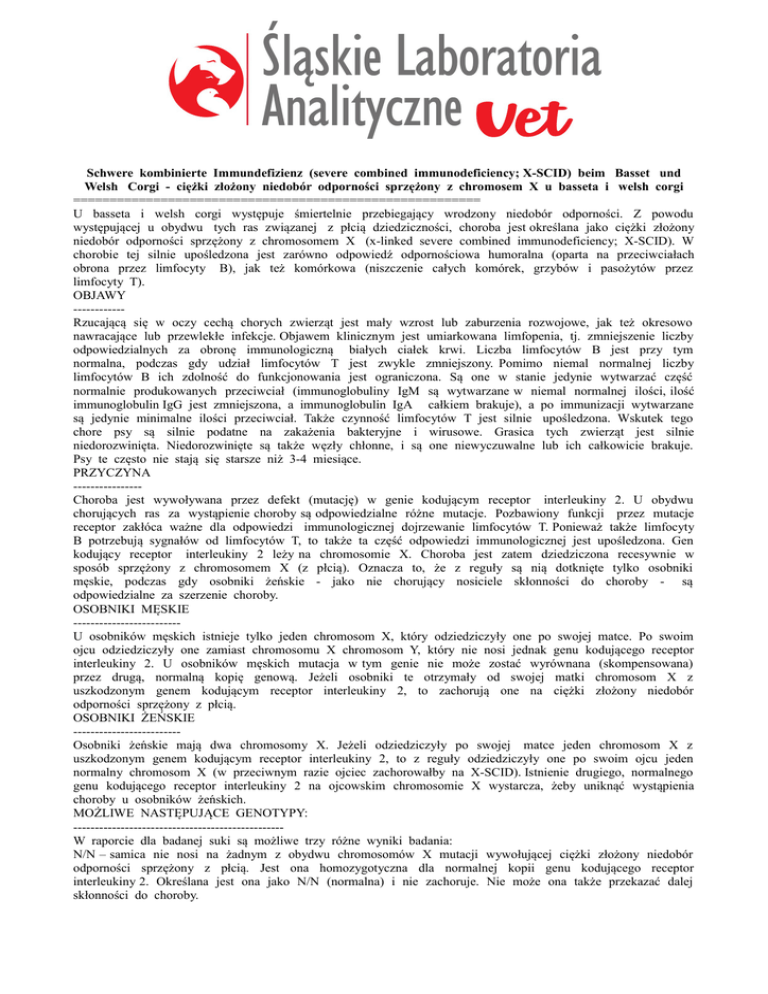 Schwere kombinierte Immundefizienz (severe combined immunodeficiency; X-SCID) beim Basset und Welsh Corgi - ciężki złożony niedobór odporności sprzężony z chromosem X u basseta i welsh corgi ======================================================== U basseta i welsh corgi występuje śmiertelnie przebiegający wrodzony niedobór odporności. Z powodu występującej u obydwu tych ras związanej z płcią dziedziczności, choroba jest określana jako ciężki złożony niedobór odporności sprzężony z chromosomem X (x-linked severe combined immunodeficiency; X-SCID). W chorobie tej silnie upośledzona jest zarówno odpowiedź odpornościowa humoralna (oparta na przeciwciałach obrona przez limfocyty B), jak też komórkowa (niszczenie całych komórek, grzybów i pasożytów przez limfocyty T). OBJAWY -----------Rzucającą się w oczy cechą chorych zwierząt jest mały wzrost lub zaburzenia rozwojowe, jak też okresowo nawracające lub przewlekłe infekcje. Objawem klinicznym jest umiarkowana limfopenia, tj. zmniejszenie liczby odpowiedzialnych za obronę immunologiczną białych ciałek krwi. Liczba limfocytów B jest przy tym normalna, podczas gdy udział limfocytów T jest zwykle zmniejszony. Pomimo niemal normalnej liczby limfocytów B ich zdolność do funkcjonowania jest ograniczona. Są one w stanie jedynie wytwarzać część normalnie produkowanych przeciwciał (immunoglobuliny IgM są wytwarzane w niemal normalnej ilości, ilość immunoglobulin IgG jest zmniejszona, a immunoglobulin IgA całkiem brakuje), a po immunizacji wytwarzane są jedynie minimalne ilości przeciwciał. Także czynność limfocytów T jest silnie upośledzona. Wskutek tego chore psy są silnie podatne na zakażenia bakteryjne i wirusowe. Grasica tych zwierząt jest silnie niedorozwinięta. Niedorozwinięte są także węzły chłonne, i są one niewyczuwalne lub ich całkowicie brakuje. Psy te często nie stają się starsze niż 3-4 miesiące. PRZYCZYNA ---------------Choroba jest wywoływana przez defekt (mutację) w genie kodującym receptor interleukiny 2. U obydwu chorujących ras za wystąpienie choroby są odpowiedzialne różne mutacje. Pozbawiony funkcji przez mutacje receptor zakłóca ważne dla odpowiedzi immunologicznej dojrzewanie limfocytów T. Ponieważ także limfocyty B potrzebują sygnałów od limfocytów T, to także ta część odpowiedzi immunologicznej jest upośledzona. Gen kodujący receptor interleukiny 2 leży na chromosomie X. Choroba jest zatem dziedziczona recesywnie w sposób sprzężony z chromosomem X (z płcią). Oznacza to, że z reguły są nią dotknięte tylko osobniki męskie, podczas gdy osobniki żeńskie - jako nie chorujący nosiciele skłonności do choroby - są odpowiedzialne za szerzenie choroby. OSOBNIKI MĘSKIE ------------------------U osobników męskich istnieje tylko jeden chromosom X, który odziedziczyły one po swojej matce. Po swoim ojcu odziedziczyły one zamiast chromosomu X chromosom Y, który nie nosi jednak genu kodującego receptor interleukiny 2. U osobników męskich mutacja w tym genie nie może zostać wyrównana (skompensowana) przez drugą, normalną kopię genową. Jeżeli osobniki te otrzymały od swojej matki chromosom X z uszkodzonym genem kodującym receptor interleukiny 2, to zachorują one na ciężki złożony niedobór odporności sprzężony z płcią. OSOBNIKI ŻEŃSKIE ------------------------Osobniki żeńskie mają dwa chromosomy X. Jeżeli odziedziczyły po swojej matce jeden chromosom X z uszkodzonym genem kodującym receptor interleukiny 2, to z reguły odziedziczyły one po swoim ojcu jeden normalny chromosom X (w przeciwnym razie ojciec zachorowałby na X-SCID). Istnienie drugiego, normalnego genu kodującego receptor interleukiny 2 na ojcowskim chromosomie X wystarcza, żeby uniknąć wystąpienia choroby u osobników żeńskich. MOŻLIWE NASTĘPUJĄCE GENOTYPY: ------------------------------------------------W raporcie dla badanej suki są możliwe trzy różne wyniki badania: N/N – samica nie nosi na żadnym z obydwu chromosomów X mutacji wywołującej ciężki złożony niedobór odporności sprzężony z płcią. Jest ona homozygotyczna dla normalnej kopii genu kodującego receptor interleukiny 2. Określana jest ona jako N/N (normalna) i nie zachoruje. Nie może ona także przekazać dalej skłonności do choroby. N/XSCID - samice, które noszą mutację tylko w jednej kopii genowej, są określane jako N/XSCID (nosiciele skłonności do choroby). Są one heterozygotycznymi nosicielami mutacji i nie zachorują. Przekazują one jednak z 50% prawdopodobieństwem skłonność do choroby na swoje potomstwo. 50% potomstwa żeńskiego jest określanych jako N/XSCID i są one znowu nosicielami skłonności do choroby, 50% potomstwa męskiego jest określanych jako XSCID/Y i zachoruje, a 50% potomstwa męskiego jest określanych jako N/Y (normalne). XSCID/XSCID - samice, u których obydwa geny kodujące dystrofinę noszą mutację wywołującą ciężki złożony niedobór odporności sprzężony z chromosomem X, są w raporcie określane jako XSCID/XSCID (chore). Są one homozygotycznymi nosicielami mutacji i zachorują na X-SCID. Takie zwierzęta mogą zaistnieć tylko wtedy, jeżeli do hodowli został użyty chory samiec (ponieważ oczekiwany czas życia chorych zwierząt zwykle wynosi 3-4 miesiące, takie krzyżowanie jest niemal niemożliwe). Chore suki przekazują ze 100% prawdopodobieństwem skłonność do choroby na swoje potomstwo. Całe potomstwo męskie zachoruje, a całe potomstwo żeńskie jest nosicielami skłonności do choroby. HODOWLA ---------------Dla hodowli decydujące jest to, iż samice będące nosicielami skłonności do choroby (noszą one jeden zmutowany gen i jeden normalny gen) wprawdzie same nie chorują, ale przekazują z 50% prawdopodobieństwem dziedziczną skłonność do ciężkiego złożonego niedoboru odporności sprzężonego z chromosomem X na swoje potomstwo. 50% p