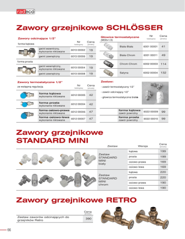 Zawory grzejnikowe SCHLÖSSER Zawory odcinające 1/2” forma kątowa Nr Cena katalogowy [zł/netto] gwint wewntrzny, wykonanie niklowane 6013 00002 19 gwint zewnętrzny 6013 00006 19 gwint wewnętrzny, wykonanie niklowane 6013 00004 19 gwint zewnętrzny 6013 00008 19 Nr Cena katalogowy [zł/netto] Głowice termostatyczne (M30x1,5) Nr Cena katalogowy [zł/netto] Biała-Biała 6001 00001 41 Biała-Chrom 6001 00011 49 Chrom-Chrom 6002 00003 114 Satyna 6002 00004 132 forma prosta Zestaw: Zawory termostatyczne 1/2” ze wstępną regulacją - zawór termostatyczny 1/2” - zawór odcinający 1/2” forma kątowa wykonanie niklowane 6012 00005 42 forma prosta wykonanie niklowane 6012 00004 42 forma osiowo-prawa 6012 00006 wykonanie niklowane 47 forma kątowa zawór powrotny 6022 00009 99 47 forma prosta zawór powrotny 6022 00010 99 forma osiowo-lewa 6012 00007 wykonanie niklowane - głowica termostatyczna biała Zawory grzejnikowe STANDARD MINI Zestaw Zestaw STANDARD MINI biały Zestaw STANDARD MINI chrom Wersja Cena [zł/netto] 66 390 [zł/netto] kątowa 199 prosta 199 osiowo-prawa 169 osiowo-lewa 169 kątowa 220 prosta 220 osiowo-prawa 190 osiowo-lewa 190 Zawory grzejnikowe RETRO Zestaw zaworów odcinających do grzejników Retro Cena www.radeco.com.pl Zawory grzejnikowe SCHLÖSSER Zestaw Zestaw Elegant Zestaw Elegant STYLE Zestaw Ekskluzywny Zintegrowane podejścia DUO-PLEX z głowicą Zestaw - przyłącze jednootworowe Zestaw Prestige Zestawy trójników przystosowanych do montażu grzałki Wersja kątowa prosta kątowa kątowa osiowo-prawa osiowo-lewa kątowa - prawa kątowa - lewa prosta kątowa - prawa kątowa - lewa prosta kątowa kątowa Kolor Cena [zł/netto] biały 292 chromowany 303 satynowy 387 stary mosiądz 457 kolor 580 biały 485 chromowany 535 satynowy 565 stary mosiądz 675 kolor 894 biały 415 chromowany 498 satynowy 583 stary mosiądz 831 kolor 899 biały 415 chromowany 498 satynowy 583 stary mosiądz 830 kolor 897 biały 485 chromowany 576 satynowy 634 stary mosiądz 982 kolor 989 biały 479 chromowany 557 satynowy 597 stary mosiądz 897 kolor 978 biały 453 chromowany 553 satynowy 616 stary mosiądz 858 kolor 960 67