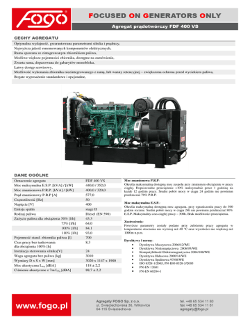 Agregat prądotwórczy FDF 400 VS CECHY AGREGATU Optymalna wydajność, gwarantowana parametrami silnika i prądnicy, Najwyższa jakość renomowanych komponentów elektrycznych, Rama spawana ze zintegrowanym zbiornikiem paliwa, Możliwe większe pojemności zbiornika, dostępne na zamówienie, Zwarta rama, dopasowana do gabarytów monobloku, Łatwy dostęp serwisowy, Możliwość wykonania zbiornika niezintegrowanego z ramą, lub wanny retencyjnej – zwiększona ochrona przed wyciekiem paliwa, Bogate wyposażenie standardowe i opcjonalne, DANE OGÓLNE Oznaczenie agregatu Moc maksymalna E.S.P. [kVA] / [kW] Moc znamionowa P.R.P. [kVA] / [kW] Prąd znamionowy P.R.P [A] Częstotliwość [Hz] Napięcie [V] Emisja spalin Rodzaj paliwa Zużycie paliwa dla obciążenia 50% [l/h] 75% [l/h] 100% [l/h] 110% [l/h] Pojemność stand. zbiornika paliwa [l] Czas pracy bez tankowania dla obciążenia 100% [h] Instalacja sterowania silnika[V] Waga agregatu bez paliwa [kg] Wymiary D x S x W [mm] Moc akustyczna Lwa [dBA] Ciśnienie akustyczne z 7m LPa [dBA] FDF 400 VS 440,0 / 352,0 400,0 / 320,0 577,0 50 400 stage II Diesel (EN 590) 43,3 64,0 84,1 93,0 700 8,3 24 3010 3020 x 1147 x 1980 118 ± 2,2 88,7 ± 2,2 Moc znamionowa P.R.P: Określa maksymalną dostępną moc zespołu przy zmiennym obciążeniu w pracy ciągłej. Dopuszczalne przeciążenie +10% maksymalnie przez 1 godzinę na każde 12 godzin pracy. Średni pobór mocy w ciągu 24 godzin nie powinien przekraczać 70% P.R.P. Moc maksymalna E.S.P.: Określa maksymalną dostępną moc agregatu, przy ograniczeniu pracy do 500 godzin rocznie. Średni pobór mocy w ciągu 24h nie powinien przekraczać 80% E.S.P. Maksymalny czas ciągłej pracy – 300h. Brak możliwości przeciążenia. Zastrzeżenia: Powyższe parametry zostały podane przy założeniu pracy agregatu w temperaturze otoczenia nie wyższej niż 40 °C oraz wysokości nie większej niż 1000m n.p.m. Dyrektywy i normy: • Dyrektywa Maszynowa 2006/42/WE • Dyrektywa Niskonapięciowa 2006/95/WE • Kompatybilność Elektromagnetyczna 2004/108/WE • Dyrektywa Hałasowa 2000/14/WE • Dyrektywa Spalinowa 97/68/WE • ISO 8528-1/2005, PN-ISO 8528-5/2005 • PN-EN 12601 • PN-EN 60204-1 Agregat prądotwórczy FDF 400 VS STEROWNIK STANDARD Typ sterownika: AMF 25 Intuicyjny interfejs graficzny Zegar czasu rzeczywistego z akumulatorem Kontrola zasilania sieciowego, automatyczny start generatora Dziennik zdarzeń: do 119 pozycji Pomiar wartości prądu w 3 fazach Pomiar wartości napięcia sieci i generatora Pomiar mocy czynnej, biernej i pozornej Licznik energii czynnej i biernej generatora Licznik czasu pracy Pomiar napięcia akumulatora Pomiar poziomu paliwa Ochrona generatora (częstotliwość, napięcie, asymetria, przeciążenie) Obsługa silników z protokołem CAN wg. standardu J1939 Komunikacja RS 485 Modbus oraz RS232 (wymagany moduł IL-NT RS232-485) Obsługa zdalna przez GPRS (wymagany moduł IL-NT GPRS) Obsługa zdalna przez Internet (wymagany moduł IB-Lite) Darmowy system InteliMonitor do podglądu parametrów agregatów Darmowa aplikacja WebSupervisor dla Android lub iOS do podglądu floty agregatów Wysyłanie powiadomień o błędach poprzez SMS lub e-mail (wymagany moduł IL-NT GPRS lub IB-Lite) SILNIK Producent silnika Typ silnika Kraj produkcji Moc silnika netto [kW] Emisja spalin* Obroty [obr/min] Regulacja obrotów Klasa wykonania** Pojemność silnika [l] Liczba cylindrów Instalacja [V] Płyn chłodzący Pojemność cieczy chłodzącej [l] Olej silnikowy Pojemność miski olejowej [l] Rodzaj paliwa Zużycie paliwa dla obciążenia 75% [l/h] Zużycie paliwa dla obciążenia 100% [l/h] * PRĄDNICA Volvo TAD1344GE Szwecja 354,0 stage II 1500 elektroniczna G3 12,8 6 24 Volvo Coolant VCS 44,0 Shell Rimula R4L 36,0 Diesel (EN 590) 64,0 84,1 Zgodnie z Dyrektywą 97/68/WE dotyczącą ograniczenia emisji zanieczyszczeń gazowych i pyłowych z silników spalinowych, montowanych w maszynach samojezdnych, nieporuszających się po drogach. ** Zgodnie z normą PN-ISO 8528-5/1997 Producent prądnicy Typ prądnicy Kraj produkcji Moc prądnicy (40 ºC, 1000m n.p.m.) [kVA] Moc prądnicy (27 ºC, 1000m n.p.m.) [kVA] Sprawność prądnicy [%] Stabilizacja napięcia Poziom stabilizacji napięcia [%] Ochrona Klasa izolacji Odkształcenia harmoniczne prądu THD [%] Reaktancja Xd’’ [%] * Sincro* SK315SM Chorwacja 400,0 436,0 93,4 AVR cyfrowy +/- 0,25 IP 23 H <2 15,2 Możliwość zabudowy prądnicy firmy STAMFORD lub innej, wskazanej przez klienta. Dane znamionowe agregatu mogą w takim przypadku ulec zmianie. Agregat prądotwórczy FDF 400 VS WYPOSAŻENIE STANDARDOWE Sterownik AMF25 Wyłącznik sterownika Wyłącznik agregatu Eaton LZMN3-AE630 Cewka wzrostowa wyłącznika generatora Analogowy AVR Sygnalizator dźwiękowy awarii Przycisk awaryjnego zatrzymania Akumulator rozruchowy 2x180 Ah Ładowarka akumulatora Grzałka silnika z termostatem Olej silnikowy Shell Rimula R4L Kontrola niskiego ciśnienia oleju Pomiar ciśnienia oleju Kontrola wysokiej temperatury silnika Pomiar temperatury silnika Elektroniczny regulator obrotów Pomiar poziomu paliwa Filtr paliwa z separatorem wody Tłumik spalin z kompensatorem drgań Płyn chłodzący Volvo Coolant VCS Wibroizolatory drgań silnika i prądnicy WYPOSAŻENIE I USŁUGI OPCJONALNE DVR z pomiarem w 3 fazach, dokładność ±0,25% Prądnica z systemem PMG Wyłącznik agregatu 4-torowy Schneider NSX Micrologic 2.3 Ręczna pompa spustu paliwa oraz retencji Czujnik wycieku w przestrzeni retencyjnej Niestandardowy zbiornik paliwa* Dodatkowy zbiornik paliwa 1000 – 10 000l Układ uzupełniania paliwa w zbiorniku agregatu Odłącznik akumulatora Układ SZR Układ SZR z dodatkowym kontrolerem Karta komunikacji GPRS Karta komunikacji Ethernet Karta komunikacji RS 485, RS 232 Zdalny wyświetlacz Podłączenie agregatu wraz z uruchomieniem *wg. ustaleń indywidualnych Agregat prądotwórczy FDF 400 VS WYTYCZNE INSTALACYJNE Zacisk siłowy odbioru mocy Su