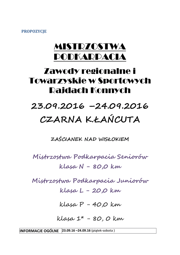 PROPOZYCJE MISTRZOSTWA PODKARPACIA Zawody regionalne i Towarzyskie w Sportowych Rajdach Konnych 23.09.2016 –24.09.2016 CZARNA K.ŁAŃCUTA ZAŚCIANEK NAD WISŁOKIEM Mistrzostwa Podkarpacia Seniorów klasa N - 80,0 km Mistrzostwa Podkarpacia Juniorów klasa L - 20,0 km klasa P - 40,0 km klasa 1* - 80, 0 km INFORMACJE OGÓLNE 23.09.16 –24.09.16 (piątek-sobota ) TERMIN ZAWODÓW: MIEJSCE ZAWODÓW: ZAŚCIANEK NAD WISŁOKIEM CZARNA 424, 37-100 ŁAŃCUT ORGANIZATOR: ZAŚCIANEK NAD WISŁOKIEM Tel: 692 470 611 e-mail org, [email protected] ODPOWIEDZIALNOŚĆ ORGANIZATORA: Organizatorzy nie ponoszą odpowiedzialności z tytułu wypadków i zachorowań trenerów, zawodników, luzaków i koni, jak również w przypadku kradzieży, zniszczeń, pożarów i innych wydarzeń wynikłych w czasie transportu i trwania zawodów. OSOBY OFICJALNE: Komisja sędziowska: Przewodnicząca – Eulalia Michalik Sędzia WZJ – Grażyna Kańka Członkowie - Anna Hadała Komisja Weterynaryjna : Przewodniczący – Jacek Kańka – Lekarz Zawodów Członkowie - Krzysztof Skwierczyński - Wojciech Błahuciak Lek.wet zawodów – Krzysztof Skwierczyński Gospodarz Toru – Monika Tama Delegat Techniczny – Anna Hadała Zespół Ratownictwa Medycznego z Łańcuta UCZESTNICTWO: Zawodnicy - zarejestrowani w PZJ/WZJ i posiadający aktualną licencję PZJ/WZJ, ważne badania od lekarza sportowego i ubezpieczenie NNW. Zawody towarzyskie – ważne badania od lekarza medycyny, ubezpieczenie NNW, zgoda opiekuna prawnego dla niepełnoletnich Konie – aktualna licencja PZJ/WZJ, paszport PZJ lub Urzędowy oraz aktualne szczepienia Zawody Towarzyskie - paszport PZJ lub Urzędowy oraz aktualne szczepienia ZGŁOSZENIA: Termin przyjmowania zgłoszeń: do dnia 14 września 2016 r. Zgłoszenia prosimy nadsyłać na e-mail: [email protected] Tel. komórkowy: 692 470 611 OPŁATY: Patrz punkt I DOKUMENTACJA: Sprawdzanie dokumentów koni i zawodników odbędzie się w biurze zawodów w dniu 23 września 2016r. (piątek) od godz. 20:00, LISTY STARTOWE: Dokonanie zmian na listach startowych (po ich wywieszeniu) jest możliwe za zgodą Sędziego Głównego - nie dotyczy skreśleń NAGRODY : Organizator zapewnia puchary, flot’s dla koni i drobne nagrody rzeczowe KLASYFIKACJA OGÓLNA: PROTESTY : Dekoracja zwycięzców odbędzie się 24.09.2016 około godziny 17.30. Wyłącznie na piśmie - 200zł PROGRAM ZAWODÓW UWAGA: w nadzwyczajnych okolicznościach nieprzewidzianych przepisami, organizator zastrzega sobie prawo do zmian w programie zawodów. DZIEŃ 1, 23 WRZEŚNIA (PIATEK) UWAGA! Zasady punktacji we wszystkich konkursach wg Regulaminu Sportowych Rajdów Konnych z dnia 01.01.2016. godz. 19.00 PRZEGLĄD WETERYNARYJNY godz. 20.00 ODPRAWA TECHNICZNA - podane zostaną godziny startów do poszczególnych konkursów oraz DODATKOWEGO przeglądu wet. dla koni, które dojadą w sobotę rano DZIEŃ 2, 24 WRZEŚNIA (SOBOTA) KONKURS nr 1 kl. L - 20 km - MISTRZOSTWA JUNIORÓW KONKURS NR 1A kl.L –(towarzyski) - 20 km Zasady rozgrywania zgodnie z obowiązującym Regulaminem Sportowych Rajdów Konnych 2016 r Dla koni, które ukończyły 5 lat KONKURS nr 2 kl. P - 40 km i zawodników od 13 roku Dystans podzielony jest na 2 odcinki (20+20 km) życia. Bramka weterynaryjna po 20 km z obowiązkowym odpoczynkiem 40 min. Zasady rozgrywania zgodnie z obowiązującym Regulaminem Sportowych Rajdów Konnych 2016 r. Dla koni, które ukończyły 6 lat KONKURS nr 3 kl. N - 80 km - MISTRZOSTWA SENIORÓW i zawodników od 14 roku życia. Dystans podzielony jest na 3 pętle (30+30+20 km) Pierwsza bramka po 30 km z obowiązkowym odpoczynkiem 40 min Druga bramka po 60 km z rekontrolą i odpoczynkiem 40 min Zasady rozgrywania zgodnie z obowiązującym Regulaminem Sportowych Rajdów Konnych 2016 r. Dla koni, które ukończyły 6 lat i zawodników od 14 roku KONKURS nr 4 kl. 1* - 80 km życia. Dystans podzielony jest na 3 pętle (30+30+20 km) Pierwsza bramka po 30 km z obowiązkowym odpoczynkiem 40 min Druga bramka po 60 km z rekontrolą i odpoczynkiem 40 min Organizator rezygnuje z limitu wagi minimalnej. Zasady rozgrywania zgodnie z obowiązującym Regulaminem Sportowych Rajdów Konnych 2016r. Zakończenie konkursów Około godz. 17.30 SPRAWY ORGANIZACYJNO-TECHNICZNE INFORMACJE O TRASIE: Pętle o długości 20 km i 30 km. Trasa bardzo przyjemna, przebiega przez obszary leśne, tereny łąk, drogi polne i gminne, podłoże piaszczyste, trawiaste z korzeniami, możliwość tworzenia kałuż przy opadach deszczu. Teren płaski, różnica wzniesień na pętli do ok. 50 m. Trasy na niewielkich odcinkach zawierają drogi asfaltowe. Przygotowane z myślą o możliwości łatwiejszego zagrywania koni. UBIÓR: W czasie rajdu i treningów przed zawodami, zawodnika obowiązuje twarde nakrycie głowy (kask z atestem lub toczek z trzypunktowym mocowaniem) zapięte pod brodą oraz obuwie jeździeckie z obcasami lub strzemiona zamknięte (z koszyczkiem). Zabronione palcaty i ostrogi. Zawodnicy – licencja WZJ/PZJ i aktualne badania od lekarza sportowego i ubezpieczenie NNW WYMAGANA DOKUMENTACJA DLA ZAWODNIKÓW I KONI SCHEMAT SZCZEPIEŃ PRZECIWKO GRYPIE: PRZEGLĄD WETERYNARYJNY: ZEBRANIE TECHNICZNE: Konie – licencja WZJ/PZJ i ważny paszport PZJ lub Urzędowy z aktualnymi szczepieniami przeciwko grypie koni. Schemat szczepień – niżej. W konkursie Towarzyskim mogą startować zawodnicy bez licencji lub z licencją wstępną Szczepienia ochronne przeciwko grypie koni. Obowiązuje następujący schemat szczepień: 1. Szczepienie podstawowe: pierwsze szczepienie – w dniu rozpoczęcia szczepień, drugie szczepienie –pomiędzy 21 i 92 dniem od pierwszego szczepienia, 2. Szczepienie przypominające: pierwsze szczepienie przypominające w terminie przed upływem 6-ciu miesięcy 21 dni od drugiego szczepienia podstawowego kolejne szczepienie przypominające dla koni zgłoszonych do zawodów, musi się odbyć przed upływem terminu 6 miesięcy przed dniem przyjazdu na zawody, dopuszc