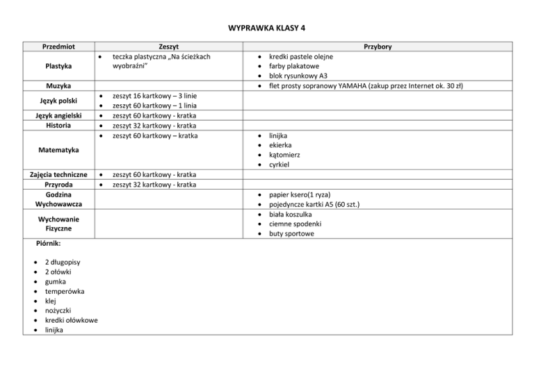 WYPRAWKA KLASY 4 Przedmiot Zeszyt teczka plastyczna „Na ścieżkach wyobraźni” zeszyt 16 kartkowy – 3 linie zeszyt 60 kartkowy – 1 linia zeszyt 60 kartkowy - kratka zeszyt 32 kartkowy - kratka zeszyt 60 kartkowy – kratka zeszyt 60 kartkowy - kratka zeszyt 32 kartkowy - kratka Plastyka Muzyka Język polski Język angielski Historia Matematyka Zajęcia techniczne Przyroda Godzina Wychowawcza Wychowanie Fizyczne Piórnik: 2 długopisy 2 ołówki gumka temperówka klej nożyczki kredki ołówkowe linijka Przybory kredki pastele olejne farby plakatowe blok rysunkowy A3 flet prosty sopranowy YAMAHA (zakup przez Internet ok. 30 zł) linijka ekierka kątomierz cyrkiel papier ksero(1 ryza) pojedyncze kartki A5 (60 szt.) biała koszulka ciemne spodenki buty sportowe