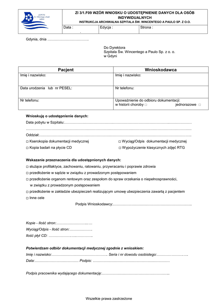 ZI 3/1.F09 WZÓR WNIOSKU O UDOSTĘPNIENIE DANYCH DLA OSÓB INDYWIDUALNYCH INSTRUKCJA ARCHIWALNA SZPITALA ŚW. WINCENTEGO A PAULO SP. Z O.O. Data : Edycja : Strona : . Gdynia, dnia ……………………………. Do Dyrektora Szpitala Św. Wincentego a Paulo Sp. z o. o. w Gdyni Pacjent Wnioskodawca Imię i nazwisko: Imię i nazwisko: Data urodzenia lub nr PESEL: Nr telefonu: Nr telefonu: Upoważnienie do odbioru dokumentacji: w historii choroby jednorazowe Wnioskuję o udostępnienie danych: Data pobytu w Szpitalu:………………………………….………………………………………..……………… …………………………………………………………………………………………………………………….… Oddział:…………………………………………………………………………………………………………….. Kserokopia dokumentacji medycznej Wyciąg/Odpis dokumentacji medycznej Kopia badań na płycie CD Wypożyczenie klasycznych zdjęć RTG Wskazanie przeznaczenia dla udostępnionych danych: służące profilaktyce, zachowaniu, ratowaniu, przywracaniu i poprawie zdrowia przedłożenie w sądzie w związku z prowadzonym postępowaniem przedłożenie organom rentowym oraz zespołom do spraw orzekania o niepełnosprawności, w związku z prowadzonym postępowaniem przedłożenie w zakładzie ubezpieczeń realizującym umowę ubezpieczenia zawartą z pacjentem Inne cele Podpis Wnioskodawcy:……………………………………………………….. Kopie - Ilość stron:……………………...… Wyciąg/Odpis - Ilość stron:………………. Ilość płyt CD: ……………….…..…………. Potwierdzam odbiór dokumentacji medycznej zgodnie z wnioskiem: Imię i nazwisko:………………………………………. Seria i nr dowodu osobistego:………………….…. Data:……………………………… Podpis: ……………………………………………………… Podpis pracownika wydającego dokumentację:……………………………………………….. Wszelkie prawa zastrzeżone