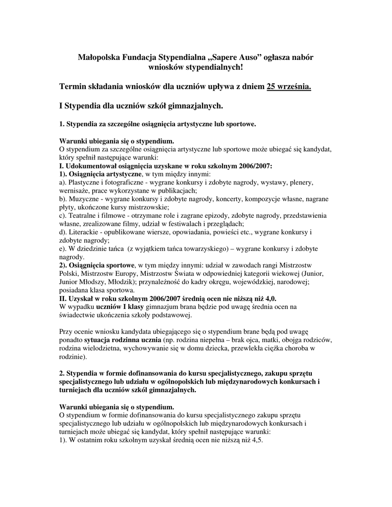 Małopolska Fundacja Stypendialna „Sapere Auso” ogłasza nabór wniosków stypendialnych! Termin składania wniosków dla uczniów upływa z dniem 25 września. I Stypendia dla uczniów szkół gimnazjalnych. 1. Stypendia za szczególne osiągnięcia artystyczne lub sportowe. Warunki ubiegania się o stypendium. O stypendium za szczególne osiągnięcia artystyczne lub sportowe może ubiegać się kandydat, który spełnił następujące warunki: I. Udokumentował osiągnięcia uzyskane w roku szkolnym 2006/2007: 1). Osiągnięcia artystyczne, w tym między innymi: a). Plastyczne i fotograficzne - wygrane konkursy i zdobyte nagrody, wystawy, plenery, wernisaże, prace wykorzystane w publikacjach; b). Muzyczne - wygrane konkursy i zdobyte nagrody, koncerty, kompozycje własne, nagrane płyty, ukończone kursy mistrzowskie; c). Teatralne i filmowe - otrzymane role i zagrane epizody, zdobyte nagrody, przedstawienia własne, zrealizowane filmy, udział w festiwalach i przeglądach; d). Literackie - opublikowane wiersze, opowiadania, powieści etc., wygrane konkursy i zdobyte nagrody; e). W dziedzinie tańca (z wyjątkiem tańca towarzyskiego) – wygrane konkursy i zdobyte nagrody. 2). Osiągnięcia sportowe, w tym między innymi: udział w zawodach rangi Mistrzostw Polski, Mistrzostw Europy, Mistrzostw Świata w odpowiedniej kategorii wiekowej (Junior, Junior Młodszy, Młodzik); przynależność do kadry okręgu, wojewódzkiej, narodowej; posiadana klasa sportowa. II. Uzyskał w roku szkolnym 2006/2007 średnią ocen nie niższą niż 4,0. W wypadku uczniów I klasy gimnazjum brana będzie pod uwagę średnia ocen na świadectwie ukończenia szkoły podstawowej. Przy ocenie wniosku kandydata ubiegającego się o stypendium brane będą pod uwagę ponadto sytuacja rodzinna ucznia (np. rodzina niepełna – brak ojca, matki, obojga rodziców, rodzina wielodzietna, wychowywanie się w domu dziecka, przewlekła ciężka choroba w rodzinie). 2. Stypendia w formie dofinansowania do kursu specjalistycznego, zakupu sprzętu specjalistycznego lub udziału w ogólnopolskich lub międzynarodowych konkursach i turniejach dla uczniów szkól gimnazjalnych. Warunki ubiegania się o stypendium. O stypendium w formie dofinansowania do kursu specjalistycznego zakupu sprzętu specjalistycznego lub udziału w ogólnopolskich lub międzynarodowych konkursach i turniejach może ubiegać się kandydat, który spełnił następujące warunki: 1). W ostatnim roku szkolnym uzyskał średnią ocen nie niższą niż 4,5. III Stypendium „Prymus Sapere Auso” Warunki ubiegania się o stypendium. Stypendium „Prymus Sapere Auso” dla najwybitniejszych stypendystów Fundacji może zostać przyznane uczniowi lub studentowi, który spełnia następujące warunki: 1. Jest aktualnym laureatem stypendium „Sapere Auso” Małopolskiej Fundacji Stypendialnej za szczególne osiągnięcia naukowe, artystyczne lub sportowe; 2. W ostatnim roku szkolnym lub akademickim uzyskała średnią ocen nie niższą niż 4,5 w przypadku uczniów oraz 4,0 w przypadku studentów; 3. W ostatnim roku szkolnym lub akademickim wykazał się szczególnymi osiągnięciami naukowymi, artystycznymi lub sportowymi. 4. Przedłoży w terminie sprawozdanie roczne zgodnie z zasadami określonymi w umowie stypendialnej. Wymagane dokumenty Podanie/List motywacyjny o przyznanie stypendium "Prymus Sapere Auso" Szczegółowe informację – www.sapereauso.org Małopolska Fundacja Stypendialna „Sapere Auso” ul. Lubelska 23 30-003 Kraków tel. (12) 630 09 86 [email protected]