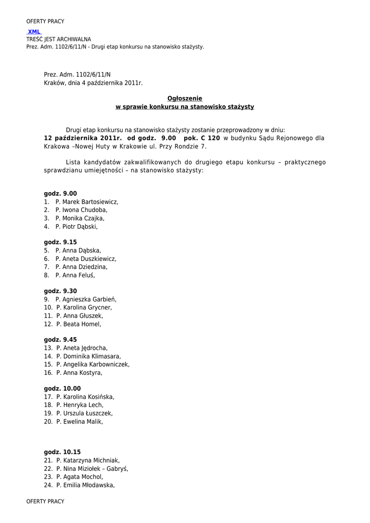 OFERTY PRACY XML TREŚĆ JEST ARCHIWALNA Prez. Adm. 1102/6/11/N - Drugi etap konkursu na stanowisko stażysty. Prez. Adm. 1102/6/11/N Kraków, dnia 4 października 2011r. Ogłoszenie w sprawie konkursu na stanowisko stażysty Drugi etap konkursu na stanowisko stażysty zostanie przeprowadzony w dniu: 12 października 2011r. od godz. 9.00 pok. C 120 w budynku Sądu Rejonowego dla Krakowa –Nowej Huty w Krakowie ul. Przy Rondzie 7. Lista kandydatów zakwalifikowanych do drugiego etapu konkursu – praktycznego sprawdzianu umiejętności – na stanowisko stażysty: godz. 9.00 1. P. Marek Bartosiewicz, 2. P. Iwona Chudoba, 3. P. Monika Czajka, 4. P. Piotr Dąbski, godz. 9.15 5. P. Anna Dąbska, 6. P. Aneta Duszkiewicz, 7. P. Anna Dziedzina, 8. P. Anna Feluś, godz. 9.30 9. P. Agnieszka Garbień, 10. P. Karolina Grycner, 11. P. Anna Głuszek, 12. P. Beata Homel, godz. 9.45 13. P. Aneta Jędrocha, 14. P. Dominika Klimasara, 15. P. Angelika Karbowniczek, 16. P. Anna Kostyra, godz. 10.00 17. P. Karolina Kosińska, 18. P. Henryka Lech, 19. P. Urszula Łuszczek, 20. P. Ewelina Malik, godz. 10.15 21. P. Katarzyna Michniak, 22. P. Nina Miziołek – Gabryś, 23. P. Agata Mochol, 24. P. Emilia Młodawska, OFERTY PRACY OFERTY PRACY godz. 10.30 25. P. Regina Musiał, 26. P. Martyna Myszkowska, 27. P. Katarzyna Nowak, 28. P. Magdalena Pawlik, godz. 10.45 29. P. Jolanta Przysiężniak, 30. P. Aleksandra Przeniosło, 31. P. Katarzyna Rusin, 32. P. Patrycja Rumian, godz. 11.00 33. P. Witold Salwa, 34. P. Mariusz Sanokowski, 35. P. Agnieszka Suska, 36. P. Agnieszka Starzyk – Piziak, godz. 11.15 37. P. Arleta Sobas, 38. P. Agnieszka Stryczek, 39. P. Renata Szewczyk, 40. P. Jolanta Szydlik – Brudny, godz. 11.30 41. P. Agnieszka Szempruch, 42. P. Anna Światłoń, 43. P. Monika Twardowska, 44. P. Katarzyna Węgrzyn, godz. 11.45 45. P. Magdalena Wolska, 46. P. Karolina Wisniewska, 47. P. Aneta Wiśniewska Przewodniczący Komisji Konkursowej Sądu Rejonowego dla Krakowa - Nowej Huty w Krakowie SSR Dorota Sośnicka - Gurbiel Podmiot publikujący Sąd Rejonowy dla KRAKOWA NOWEJ HUTY W KRAKOWIE Wytworzył SSR Dorota Sośnicka-Gurbiel Publikujący - OFERTY PRACY 2011-10-05