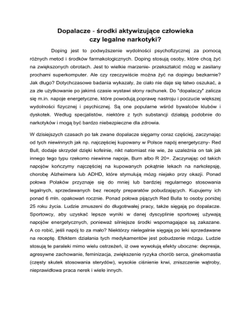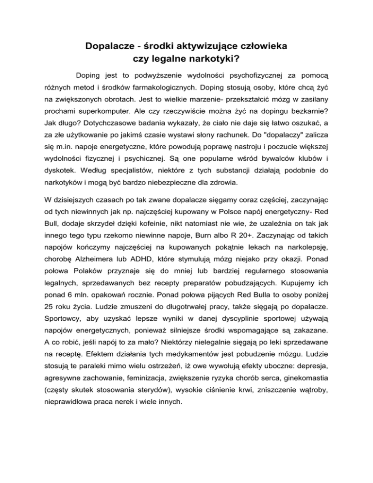 Dopalacze - środki aktywizujące człowieka czy legalne narkotyki? Doping jest to podwyższenie wydolności psychofizycznej za pomocą różnych metod i środków farmakologicznych. Doping stosują osoby, które chcą żyć na zwiększonych obrotach. Jest to wielkie marzenie- przekształcić mózg w zasilany prochami superkomputer. Ale czy rzeczywiście można żyć na dopingu bezkarnie? Jak długo? Dotychczasowe badania wykazały, że ciało nie daje się łatwo oszukać, a za złe użytkowanie po jakimś czasie wystawi słony rachunek. Do "dopalaczy" zalicza się m.in. napoje energetyczne, które powodują poprawę nastroju i poczucie większej wydolności fizycznej i psychicznej. Są one popularne wśród bywalców klubów i dyskotek. Według specjalistów, niektóre z tych substancji działają podobnie do narkotyków i mogą być bardzo niebezpieczne dla zdrowia. W dzisiejszych czasach po tak zwane dopalacze sięgamy coraz częściej, zaczynając od tych niewinnych jak np. najczęściej kupowany w Polsce napój energetyczny- Red Bull, dodaje skrzydeł dzięki kofeinie, nikt natomiast nie wie, że uzależnia on tak jak innego tego typu rzekomo niewinne napoje, Burn albo R 20+. Zaczynając od takich napojów kończymy najczęściej na kupowanych pokątnie lekach na narkolepsję, chorobę Alzheimera lub ADHD, które stymulują mózg niejako przy okazji. Ponad połowa Polaków przyznaje się do mniej lub bardziej regularnego stosowania legalnych, sprzedawanych bez recepty preparatów pobudzających. Kupujemy ich ponad 6 mln. opakowań rocznie. Ponad połowa pijących Red Bulla to osoby poniżej 25 roku życia. Ludzie zmuszeni do długotrwałej pracy, także sięgają po dopalacze. Sportowcy, aby uzyskać lepsze wyniki w danej dyscyplinie sportowej używają napojów energetycznych, ponieważ silniejsze środki wspomagające są zakazane. A co robić, jeśli napój to za mało? Niektórzy nielegalnie sięgają po leki sprzedawane na receptę. Efektem działania tych medykamentów jest pobudzenie mózgu. Ludzie stosują te paraleki mimo wielu ostrzeżeń, iż owe wywołują efekty uboczne: depresja, agresywne zachowanie, feminizacja, zwiększenie ryzyka chorób serca, ginekomastia (częsty skutek stosowania sterydów), wysokie ciśnienie krwi, zniszczenie wątroby, nieprawidłowa praca nerek i wiele innych. Badania nad preparatami pobudzającymi sięgają połowy lat 80, w tym właśnie czasie naukowcy opracowali mechanizm stymulowania receptorów Ampa. Glutaminian jest neuroprzekaźnikiem mózgowym odgrywającym szczególnie ważną rolę w procesach uczenia się i podczas wytężonej pracy intelektualnej. Dopalacze były stosowane już wieki temu. Historia literatury to dzieje dopingu. Ze środków wspomagających pracę mózgu korzystali wielcy twórcy, niestety często wysoką cenę płacili za ich stosowanie. Pewne jest to, że liczba ludzi zażywających dopalacze z roku na rok rośnie, tym samym rośnie liczba uzależnionych. Naukowcy i badacze przekonują nas, że układ nerwowy jest organem zbyt skomplikowanym byśmy mogli traktować go wyłącznie jako system przetwarzania informacji i sterować nim podobnie jak komputerem. Nikt do końca nie wie jak naprawdę działają dopalacze i do jakich skutków może doprowadzić ich zażywanie. Miejmy nadzieje, że te wszystkie wątpliwości powstrzymają chętnych do przekształcania swojego mózgu w superkomputer. Powinniśmy być bardzo ostrożni w stosowaniu wszelkich środków pobudzających. Bardzo często szczególnie młodzież wyraźnie nadużywa wszelkiego rodzaju napojów energetycznych. Pamiętajmy, że my jako rodzice musimy kontrolować, a w szczególności rozmawiać z naszymi dziećmi o ich szkodliwości, nie pozwólmy aby wszelkie środki pobudzające miały wpływ na zachowanie naszego dziecka. Kiedy zauważymy, że kupowanie tych substancji jest nadmierne i częste postarajmy się o zapewnienie pomocy, i dostarczenie rzeczowej wiedzy na temat ich szkodliwości, tak aby dziecko miało szansę konfrontacji swoich przekonań o dobroczynnym działaniu tych substancji. Edyta Poznaniak – Helak Pedagog PPP w Krzyżu Wlkp.