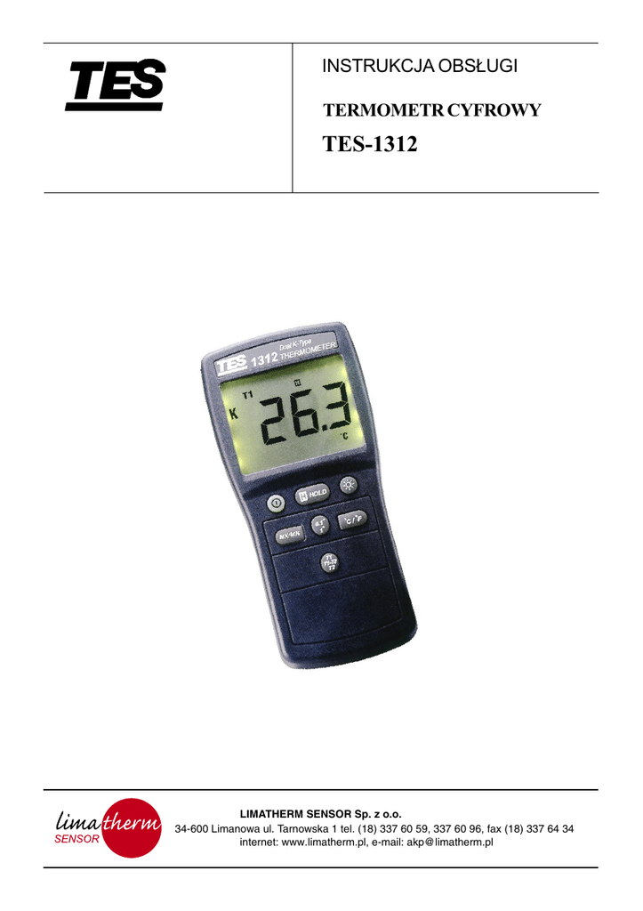 LIMATHERM SENSOR Sp. z o.o. 34-600 Limanowa ul. Tarnowska 1, tel. (18) 337 60 59 , 337 60 96, fax (18) 337 64 34 INSTRUKCJA OBS£UGI TERMOMETR CYFROWY TES-1312 LIMATHERM SENSOR Sp. z o.o. 34-600 Limanowa ul. Tarnowska 1 tel. (18) 337 60 59, 337 60 96, fax (18) 337 64 34 internet: www.limatherm.pl, e-mail: [email protected] 1 LIMATHERM SENSOR Sp. z o.o. 34-600 Limanowa ul. Tarnowska 1, tel. (18) 337 60 59 , 337 60 96, fax (18) 337 64 34 1. Wstêp Niniejszy przyrz¹d jest termometrem cyfrowym do u¿ytku z dowolnym termoelementem typu K, jako czujnikiem temperatury. Wskazania temperatury s¹ zgodne z miêdzynarodow¹ skal¹ temperatury z 1990 (ITS-90). 2. Dane techniczne 2.1 Dane elektroniczne Zakres pomiarów: Rozdzielczoæ: Zabezpieczenie wejcia: Dopuszczalne pola RF: (czêstotliwoci radiowych) -50 0C do 1300 0C 0,1 0C , 1 0C. 60 V DC lub 24 V AC. silne pola RF mog¹ wp³ywaæ na dok³adnoæ pomiaru. Warunki otoczenia Zakres temperatury pracy: Temperatura przechowywania: Wilgotnoæ: Dok³adnoæ podstawowa: 0 0C do 40 0C -10 0C do 60 0C 0 % do 80 % (0 0C do 35 0C) 0 % do 70 % (35 0C do 50 0C) (kalibracja dla 23 ± 50C) Dla pomiarów jednym termoelementem. Funkcja Zakres C -50,0 0C ~ 1000 0C 1000 0C ~ 1300 0C 0 Dok³adnoæ ±(% wartoci odczytu + stopnie) 0,3 % ± 1 0C 0,5 % ± 1 0C Uwaga Dane dotycz¹ce dok³adnoci podstawowej nie zawieraj¹ b³êdu sondy. Wspó³czynnik temperaturowy: w zakresie od 0 0C do 18 0C i 28 0C do 40 0C nale¿y podan¹ dok³adnoæ podstawow¹ pomno¿yæ przez 0,1 dla ka¿dego stopnia powy¿ej 28 0C lub poni¿ej 18 0C. 2 LIMATHERM SENSOR Sp. z o.o. 34-600 Limanowa ul. Tarnowska 1, tel. (18) 337 60 59 , 337 60 96, fax (18) 337 64 34 2.2 Dane ogólne Ciê¿ar: Wymiary: Bateria: ¯ywotnoæ baterii: Sygnalizacja s³abej baterii: 235 g 150mm (d³ugoæ) ´ 72mm (szerokoæ) ´ 35mm (wysokoæ) 6 sztuk, 1,5 V typu AAA oko³o 200 godzin (bateria wêglowo - cynkowa). (BT) jest wywietlane, gdy napiêcie baterii spada poni¿ej napiêcia pracy. Sygnalizacja przekroczenia zakresu: na najwy¿szej pozycji wywietlane jest (OL) lub (-OL). Czêstoæ pomiaru: 2,5 razy na sekundê. Wywietlacz: wywietlacz ciek³okrystaliczny (LCD), 3½ cyfrowy, o maksymalnym odczycie 1999. Akcesoria: 6 sztuk baterii, Instrukcja obs³ugi. 3. Nazwy czêci i ich po³o¿enie - T1 + - T2 + 1312 Dual K-Type THERMOMETER MAX T1 - T2 HOLD (1) Wywietlacz LCD: (2) HOLD (zatrzymanie): 3½ cyfrowy, o maksymalnym odczycie 1999, pokazuj¹cy znak minus " - ", zawieszenie odczytu " H ", "T1", "T2", "T1-T2", " 0C ", " 0F ", sygnalizacjê s³abej baterii (BT) itd. Naciniêcie przycisku HOLD powoduje wybranie trybu DATA HOLD (zatrzymanie odczytu) i pojawienie siê na wywietlaczu symbolu " H ". Ponowne naciniêcie przycisku HOLD kasuje tryb HOLD. Termometr ponownie podejmuje pomiary. 3 LIMATHERM SENSOR Sp. z o.o. 34-600 Limanowa ul. Tarnowska 1, tel. (18) 337 60 59 , 337 60 96, fax (18) 337 64 34 (3) Przycisk Rys.[]: przycisk Rys.[] w³¹cza i wy³¹cza termometr. (4) Przycisk MAX: dzia³a jako: przyciniêcie - w³¹czenie / przyciniêcie - wy³¹czenie, w³¹czenie sygnalizuje symbol MAX pojawiaj¹cy siê na LCD. (5) 0.10 / 10: Naciniêcie klawisza powoduje wybór rozdzielczoci 0,1 stopnia lub rozdzielczoci 1 stopieñ. (6) Rys.[ Naciniêcie tego klawisza w³¹cza lub wy³¹cza podwietlenie wywietlacza LCD. (7) ] C/0F: 0 Naciniêcie tego klawisza zmienia skalê temperatury pomiêdzy stopniami Celsjusza (0C) i stopniami Fahrenheita (0F). (8) T1, T1-T2, T2: Za pomoc¹ tego przycisku wybiera siê T1- T2 lub T1 i T2 jako wejcie pomiarowe. Aby mierzyæ ró¿nicê T1 - T2, musz¹ byæ przy³¹czone dwa termoelementy. (9) T1: Gniazdo wejcia termoelementu. (10) T2: Gniazdo wejcia termoelementu. 4. Instrukcja eksploatacji W³¹czenie zasilania Naciniêcie klawisza Rys.[] w³¹cza lub wy³¹cza termometr. Przy³¹czenie termoelementów Termometr mo¿e byæ u¿ywany z jednym lub dwoma termoelementami. Termoelementy nale¿y przy³¹czyæ do gniazd wejciowych T1 i T2. Tryb HOLD (zatrzymanie) Naciniêcie klawisza HOLD powoduje wybranie trybu HOLD. Gdy wybrany zostaje tryb HOLD, termometr wstrzymuje wykonywanie dalszych pomiarów. Ponowne naciniêcie klawisza HOLD kasuje tryb HOLD. Termometr na powrót podejmuje pomiary. Pomiar temperatury jednym termoelementem Termometr wywietla temperaturê termoelementu przy³¹czonego do wybranego gniazda. Aby zobaczyæ wskazanie temperatury termoelementu przy³¹czonego do wejcia T2, nale¿y nacisn¹æ przycisk [T1, T1-T2, T2]. Aby ponownie zobaczyæ wskazanie temperatury termoelementu przy³¹czonego do wejcia T1, nale¿y znów nacisn¹æ przycisk [T1, T1-T2, T2]. Wskanik wybranego wejcia na wywietlaczu pokazuje, które wejcie zosta³o wybrane. Je¿eli wybrany termoelement nie jest przy³¹czony lub przerwany jest jego obwód, termometr wywietla wskazanie OL. 4 LIMATHERM SENSOR Sp. z o.o. 34-600 Limanowa ul. Tarnowska 1, tel. (18) 337 60 59 , 337 60 96, fax (18) 337 64 34 Ró¿nicowy pomiar temperatury Ró¿nicowy pomiar temperatury wybiera siê naciskaj¹c przycisk [T1, T1-T2, T2]. Powoduje to, ¿e termometr wywietla ró¿nicê temperatur miêdzy dwoma termoelementami (temperatura termoelementu T1 minus temperatura termoelementu T2). Wybór wejcia jest pokazywany przez wskanik wejcia na wywietlaczu. Je¿eli nie jest przy³¹czony termoelement lub otwarty jest jego obwód, termometr wywietla wskazanie b³êdu. Aby wróciæ do pomiaru temperatury za pomoc¹ jednego termoelementu, nale¿y nacisn¹æ przycisk [T1, T1-T2, T2]. UWAGA W trybie pracy T1-T2 mo¿e byæ wskazywana nieprawid³owa wartoæ (migocz¹cy odczyt), je¿eli wejcie T1 lub wejcie T2 nie ma sondy temperatury / ma otwarty obwód. (Przed uruchomieniem trybu pomiaru T1-T2 nale¿y sprawdziæ prawid³owoæ pracy - osobno T1 i osobno T2). OSTRZE¯ENIE Aby unikn¹æ pora¿enia elektrycznego, nie nale¿y u¿ywaæ przyrz¹du w miejscach, gdzie wystêpuj¹ napiêcia przekraczaj¹ce 24 V AC lub 60 V DC. Wierzcho³ek sondy jest po³¹czony elektryczn
