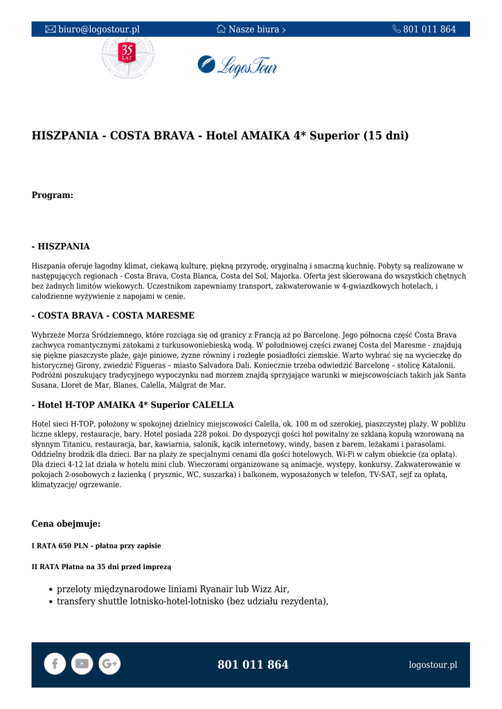 [email protected] Nasze biura 801 011 864 HISZPANIA - COSTA BRAVA - Hotel AMAIKA 4* Superior (15 dni) Program: - HISZPANIA Hiszpania oferuje łagodny klimat, ciekawą kulturę, piękną przyrodę, oryginalną i smaczną kuchnię. Pobyty są realizowane w następujących regionach - Costa Brava, Costa Blanca, Costa del Sol, Majorka. Oferta jest skierowana do wszystkich chętnych bez żadnych limitów wiekowych. Uczestnikom zapewniamy transport, zakwaterowanie w 4-gwiazdkowych hotelach, i całodzienne wyżywienie z napojami w cenie. - COSTA BRAVA - COSTA MARESME Wybrzeże Morza Śródziemnego, które rozciąga się od granicy z Francją aż po Barcelonę. Jego północna część Costa Brava zachwyca romantycznymi zatokami z turkusowoniebieską wodą. W południowej części zwanej Costa del Maresme - znajdują się piękne piaszczyste plaże, gaje piniowe, żyzne równiny i rozległe posiadłości ziemskie. Warto wybrać się na wycieczkę do historycznej Girony, zwiedzić Figueras – miasto Salvadora Dali. Koniecznie trzeba odwiedzić Barcelonę – stolicę Katalonii. Podróżni poszukujący tradycyjnego wypoczynku nad morzem znajdą sprzyjające warunki w miejscowościach takich jak Santa Susana, Lloret de Mar, Blanes, Calella, Malgrat de Mar. - Hotel H-TOP AMAIKA 4* Superior CALELLA Hotel sieci H-TOP, położony w spokojnej dzielnicy miejscowości Calella, ok. 100 m od szerokiej, piaszczystej plaży. W pobliżu liczne sklepy, restauracje, bary. Hotel posiada 228 pokoi. Do dyspozycji gości hol powitalny ze szklaną kopułą wzorowaną na słynnym Titanicu, restauracja, bar, kawiarnia, salonik, kącik internetowy, windy, basen z barem, leżakami i parasolami. Oddzielny brodzik dla dzieci. Bar na plaży ze specjalnymi cenami dla gości hotelowych. Wi-Fi w całym obiekcie (za opłatą). Dla dzieci 4-12 lat działa w hotelu mini club. Wieczorami organizowane są animacje, występy, konkursy. Zakwaterowanie w pokojach 2-osobowych z łazienką ( prysznic, WC, suszarka) i balkonem, wyposażonych w telefon, TV-SAT, sejf za opłatą, klimatyzację/ ogrzewanie. Cena obejmuje: I RATA 650 PLN - płatna przy zapisie II RATA Płatna na 35 dni przed imprezą przeloty międzynarodowe liniami Ryanair lub Wizz Air, transfery shuttle lotnisko-hotel-lotnisko (bez udziału rezydenta), 801 011 864 logostour.pl [email protected] Nasze biura 801 011 864 zakwaterowanie - 14 noclegów w hotelu 4*, w pok. 2-osob., wyżywienie 3 posiłki dziennie (bufet) + napoje (wino i woda) lub za dopłatą all-inclusive opieka polskojęzycznego rezydenta, wycieczka do Barcelony z polskojęzycznym przewodnikiem (dotyczy pobytów w okresie 29/04-21/06 + 15/9-20/10.2017) ubezpieczenie Signal Iduna NW, KL, bagaż. Dodatkowe informacje: TAKSA TURYSTYCZNA Obowiązkowa taksa turystyczna płatna na miejscu – 7 EUR/pobyt. DZIECI Opłata całkowita za dziecko (0-2 lat) – 150 PLN. BAGAŻ Cena biletu lotniczego obejmuje przewóz bagażu w następujących limitach: - w przypadku linii Ryanair 1 sztuka bagażu rejestrowanego o wadze 15 kg i 1 sztuka bagażu podręcznego o wadze 10 kg, - w przypadku linii Wizz Air 1 sztuka bagażu rejestrowanego o wadze 23 kg i 1 sztuka bagażu podręcznego o wymiarach 42 cm x 32 cm x 25 cm. W przypadku linii Ryanair, za dodatkową opłatą, w momencie rezerwacji istnieje możliwość zwiększenia wagi bagażu rejestrowanego do 20 kg DODATKOWE OPŁATY Dopłata do pok 1-os 3.os.dor.w pok.2-os. 1.dziecko 2-14 z 2 os. dor. 2.dziecko 2-14 z 2 os. dor. Dopłata do all-inclusive 1000 pln -300 pln -1100 pln -600 pln 700 pln POBYT W OKRESIE WIELKANOCNYM Przy pobycie w okresie wielkanocnym (13-16.04) – obowiązkowa dopłata 65 PLN/1noc/os. Terminy: 20.05 - 03.06.2017, 3580 PLN 03.06 - 17.06.2017, 4260 PLN 01.07 - 15.07.2017, 5190 PLN 15.07 - 29.07.2017, 5640 PLN 26.08 - 09.09.2017, 4480 PLN 801 011 864 logostour.pl [email protected] Nasze biura 801 011 864 09.09 - 23.09.2017, 3580 PLN 16.09 - 30.09.2017, 3580 PLN 23.09 - 07.10.2017, 3580 PLN 30.09 - 14.10.2017, 3580 PLN 07.10 - 21.10.2017, 3580 PLN 801 011 864 logostour.pl