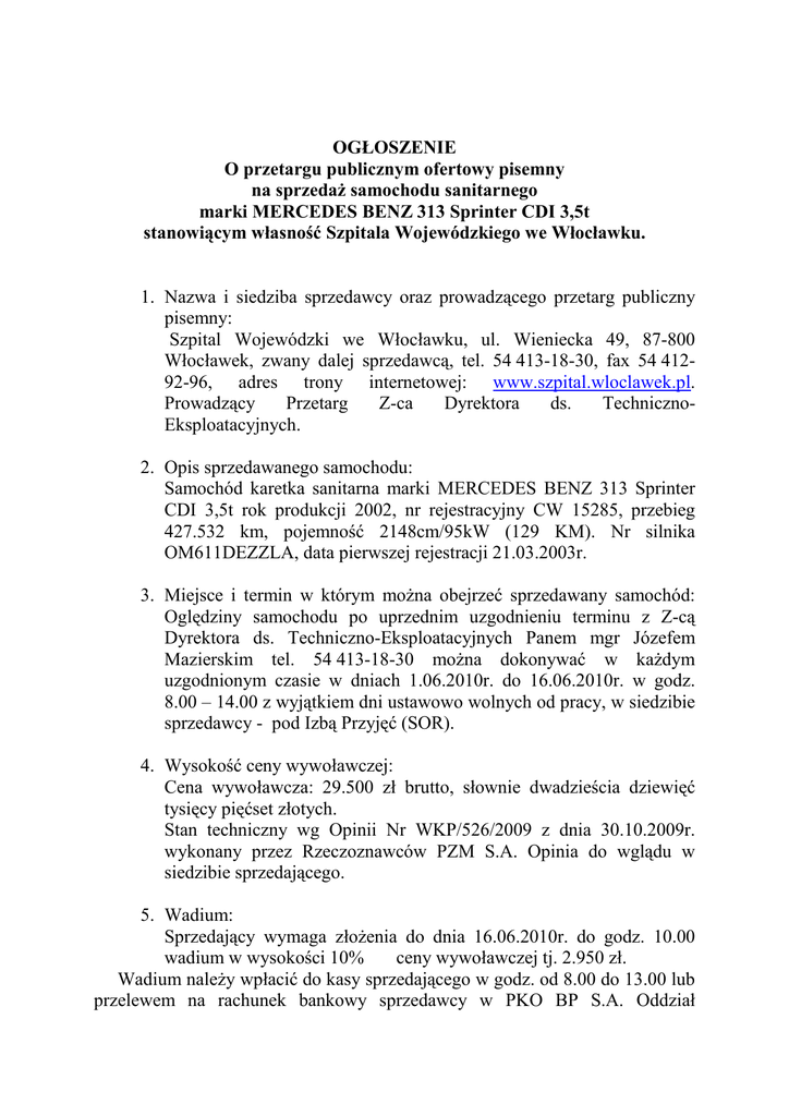 OGŁOSZENIE O przetargu publicznym ofertowy pisemny na sprzedaŜ samochodu sanitarnego marki MERCEDES BENZ 313 Sprinter CDI 3,5t stanowiącym własność Szpitala Wojewódzkiego we Włocławku. 1. Nazwa i siedziba sprzedawcy oraz prowadzącego przetarg publiczny pisemny: Szpital Wojewódzki we Włocławku, ul. Wieniecka 49, 87-800 Włocławek, zwany dalej sprzedawcą, tel. 54 413-18-30, fax 54 41292-96, adres trony internetowej: www.szpital.wloclawek.pl. Prowadzący Przetarg Z-ca Dyrektora ds. TechnicznoEksploatacyjnych. 2. Opis sprzedawanego samochodu: Samochód karetka sanitarna marki MERCEDES BENZ 313 Sprinter CDI 3,5t rok produkcji 2002, nr rejestracyjny CW 15285, przebieg 427.532 km, pojemność 2148cm/95kW (129 KM). Nr silnika OM611DEZZLA, data pierwszej rejestracji 21.03.2003r. 3. Miejsce i termin w którym moŜna obejrzeć sprzedawany samochód: Oględziny samochodu po uprzednim uzgodnieniu terminu z Z-cą Dyrektora ds. Techniczno-Eksploatacyjnych Panem mgr Józefem Mazierskim tel. 54 413-18-30 moŜna dokonywać w kaŜdym uzgodnionym czasie w dniach 1.06.2010r. do 16.06.2010r. w godz. 8.00 – 14.00 z wyjątkiem dni ustawowo wolnych od pracy, w siedzibie sprzedawcy - pod Izbą Przyjęć (SOR). 4. Wysokość ceny wywoławczej: Cena wywoławcza: 29.500 zł brutto, słownie dwadzieścia dziewięć tysięcy pięćset złotych. Stan techniczny wg Opinii Nr WKP/526/2009 z dnia 30.10.2009r. wykonany przez Rzeczoznawców PZM S.A. Opinia do wglądu w siedzibie sprzedającego. 5. Wadium: Sprzedający wymaga złoŜenia do dnia 16.06.2010r. do godz. 10.00 wadium w wysokości 10% ceny wywoławczej tj. 2.950 zł. Wadium naleŜy wpłacić do kasy sprzedającego w godz. od 8.00 do 13.00 lub przelewem na rachunek bankowy sprzedawcy w PKO BP S.A. Oddział Włocławek Nr 79 1020 5170 0000 1402 0006 1127, z dopiskiem „wadium – sprzedaŜ samochodu”. Wadium wnosi się wyłącznie w pieniądzu. Wadium przepada na rzecz sprzedawcy, jeśli Ŝaden z uczestników przetargu nie zaoferuje ceny nabycia równej co najmniej cenie wywoławczej. Wadium złoŜone przez oferentów, których oferty nie zostaną przyjęte, zostanie zwrócone bezpośrednio po dokonaniu wyboru oferty, a oferentowi, którego oferta została przyjęta, zostanie zaliczone na poczet ceny sprzedaŜy. Wadium przepada na rzecz sprzedawcy, jeśli oferent, którego oferta zostania przyjęta, uchyli się od zawarcia umowy. 6. Miejsce przetargu publicznego pisemnego, termin składania: Oferta powinna zawierać: - imię, nazwisko i adres lub nazwę (firmę) oferenta i siedzibę oferenta, - datę sporządzenia oferty, - oferowana cenę, - oświadczenie oferenta, Ŝe zapoznał się ze stanem technicznym samochodu i z tytułu ukrytych wad nie będzie wnosił roszczeń w stosunku do sprzedającego, - oświadczenie oferenta, ze znane są mu niniejsze warunki przetargu i przyjmuje je bez zastrzeŜeń, - kopię dowodu wniesienia wadium, - podpis oferenta lub osoby upełnomocnionej do reprezentowania oferenta. Oferty w zabezpieczonych kopertach zaadresowanych do sprzedawcy, oznaczonych „OFERTA na sprzedaŜ samochodu” naleŜy składać w Sekretariacie Dyrektora pokój 202 Szpital Wojewódzki we Włocławku ul. Wieniecka 49 w terminie do dnia 17.06.2010r. do godz 10.30. Okres związania z ofertą wynosi 14 dni od daty składania ofert. W razie ustalenia, Ŝe kilku oferentów zaoferowało tę samą cenę, Przewodniczący Komisji Przetargowej poinformuje oferentów o terminie i miejscu kontynuacji przetargu w formie ustnej licytacji. 7. Nabywca jest zobowiązany zapłacić cenę nabycia niezwłocznie po zakończeniu przetargu, bądź w terminie wyznaczonym przez sprzedającego, nie dłuŜszym niŜ 7 dni od daty wyboru oferty. 8. Szpital Wojewódzki we Włocławku nie bierze odpowiedzialności za stan techniczny sprzedawanego w przetargu samochodu. 9. Umowę sprzedaŜy w trybie przetargu publicznego pisemnego uwaŜa się za zawartą z chwilą otrzymania przez oferenta zawiadomienia o przyjęciu jego oferty. 10.Wydanie przedmiotu sprzedaŜy nastąpi niezwłocznie po zapłaceniu ceny nabycia. 11. Nabywca pokrywa wszystkie ewentualne koszty związane z nabyciem samochodu. 12. Sprzedawca zastrzega sobie prawo zamknięcia przetargu bez wybrania którejkolwiek z ofert, lub teŜ uniewaŜnienia przetargu bez podania przyczyn. 13.Regulamin przetargu jest dostępny w Wojewódzkiego lub na stronie internetowej. siedzibie Szpitala