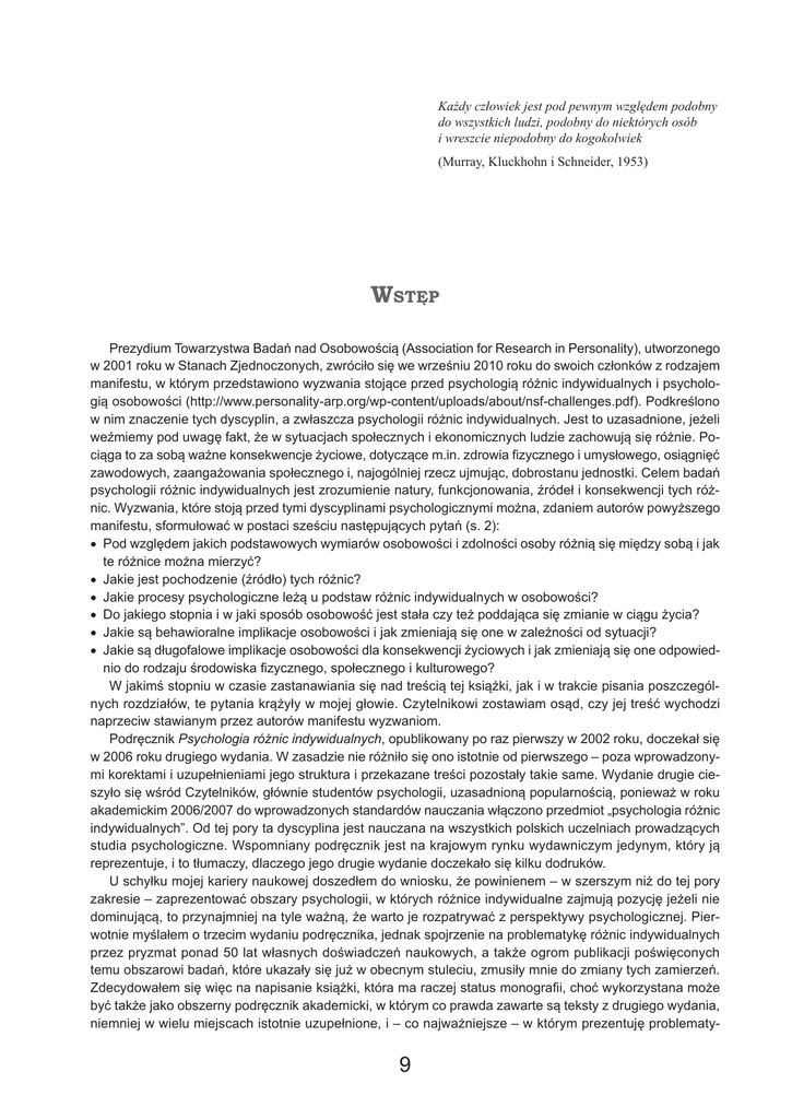 Każdy człowiek jest pod pewnym względem podobny do wszystkich ludzi, podobny do niektórych osób i wreszcie niepodobny do kogokolwiek (Murray, Kluckhohn i Schneider, 1953) Wstęp Wstęp Prezydium Towarzystwa Badań nad Osobowością (Association for Research in Personality), utworzonego w 2001 roku w Stanach Zjednoczonych, zwróciło się we wrześniu 2010 roku do swoich członków z rodzajem manifestu, w którym przedstawiono wyzwania stojące przed psychologią różnic indywidualnych i psychologią osobowości (http://www.personality-arp.org/wp-content/uploads/about/nsf-challenges.pdf). Podkreślono w nim znaczenie tych dyscyplin, a zwłaszcza psychologii różnic indywidualnych. Jest to uzasadnione, jeżeli weźmiemy pod uwagę fakt, że w sytuacjach społecznych i ekonomicznych ludzie zachowują się różnie. Pociąga to za sobą ważne konsekwencje życiowe, dotyczące m.in. zdrowia fizycznego i umysłowego, osiągnięć zawodowych, zaangażowania społecznego i, najogólniej rzecz ujmując, dobrostanu jednostki. Celem badań psychologii różnic indywidualnych jest zrozumienie natury, funkcjonowania, źródeł i konsekwencji tych różnic. Wyzwania, które stoją przed tymi dyscyplinami psychologicznymi można, zdaniem autorów powyższego manifestu, sformułować w postaci sześciu następujących pytań (s. 2): • Pod względem jakich podstawowych wymiarów osobowości i zdolności osoby różnią się między sobą i jak te różnice można mierzyć? • Jakie jest pochodzenie (źródło) tych różnic? • Jakie procesy psychologiczne leżą u podstaw różnic indywidualnych w osobowości? • Do jakiego stopnia i w jaki sposób osobowość jest stała czy też poddająca się zmianie w ciągu życia? • Jakie są behawioralne implikacje osobowości i jak zmieniają się one w zależności od sytuacji? • Jakie są długofalowe implikacje osobowości dla konsekwencji życiowych i jak zmieniają się one odpowiednio do rodzaju środowiska fizycznego, społecznego i kulturowego? W jakimś stopniu w czasie zastanawiania się nad treścią tej książki, jak i w trakcie pisania poszczególnych rozdziałów, te pytania krążyły w mojej głowie. Czytelnikowi zostawiam osąd, czy jej treść wychodzi naprzeciw stawianym przez autorów manifestu wyzwaniom. Podręcznik Psychologia różnic indywidualnych, opublikowany po raz pierwszy w 2002 roku, doczekał się w 2006 roku drugiego wydania. W zasadzie nie różniło się ono istotnie od pierwszego – poza wprowadzonymi korektami i uzupełnieniami jego struktura i przekazane treści pozostały takie same. Wydanie drugie cieszyło się wśród Czytelników, głównie studentów psychologii, uzasadnioną popularnością, ponieważ w roku akademickim 2006/2007 do wprowadzonych standardów nauczania włączono przedmiot „psychologia różnic indywidualnych”. Od tej pory ta dyscyplina jest nauczana na wszystkich polskich uczelniach prowadzących studia psychologiczne. Wspomniany podręcznik jest na krajowym rynku wydawniczym jedynym, który ją reprezentuje, i to tłumaczy, dlaczego jego drugie wydanie doczekało się kilku dodruków. U schyłku mojej kariery naukowej doszedłem do wniosku, że powinienem – w szerszym niż do tej pory zakresie – zaprezentować obszary psychologii, w których różnice indywidualne zajmują pozycję jeżeli nie dominującą, to przynajmniej na tyle ważną, że warto je rozpatrywać z perspektywy psychologicznej. Pierwotnie myślałem o trzecim wydaniu podręcznika, jednak spojrzenie na problematykę różnic indywidualnych przez pryzmat ponad 50 lat własnych doświadczeń naukowych, a także ogrom publikacji poświęconych temu obszarowi badań, które ukazały się już w obecnym stuleciu, zmusiły mnie do zmiany tych zamierzeń. Zdecydowałem się więc na napisanie książki, która ma raczej status monografii, choć wykorzystana może być także jako obszerny podręcznik akademicki, w którym co prawda zawarte są teksty z drugiego wydania, niemniej w wielu miejscach istotnie uzupełnione, i – co najważniejsze – w którym prezentuję problematy- 9 10 Wstęp kę różnic indywidualnych wykraczającą poza inteligencję, osobowość, temperament i style. Poświęciłem mianowicie oddzielne rozdziały różnicom indywidualnym w takich obszarach, jak inteligencja emocjonalna, kreatywność i zachowanie zwierząt. W ten oto sposób objętość tej publikacji zwiększyła się w stosunku do Psychologii różnic indywidualnych niemal trzykrotnie. Tam, gdzie było to uzasadnione, wykorzystałem teksty już wcześniej przeze mnie opublikowane, co dotyczy przede wszystkim takich moich książek, jak: Psychologia inteligencji (1997), Psychologia temperamentu (2001), a także rozdziałów mojego autorstwa w II tomie redagowanego przeze mnie trzytomowego podręcznika Psychologia: podręcznik akademicki (2000), jak również rozdziału „Psychologia różnic indywidualnych” w dwutomowym podręczniku Psychologia akademicka: podręcznik (2010; red. Strelau i Doliński) napisanego wspólnie z Bogdanem Zawadzkim, którego, odwołując się do tego rozdziału, cytuję. Poza faktem, że wprowadziłem do niniejszej publikacji nową problematykę różnic indywidualnych, pragnę podkreślić również inne jej osobliwości. Wyróżnikiem tej książki – jest to, że prezentowane w niej zagadnienia zostały ujęte z punktu widzenia typowego dla koncepcji cech. Cecha, czy to rozumiana jako względnie stała tendencja do określonych zachowań wyrażająca się w spójnych z nią sytuacjach, czy też jako typowa dla jednostki możliwość efektywnego funkcjonowania (zdolność) w różnych sferach działalności, jest dla psychologii różnic indywidualnych pojęciem kluczowym. Książka zawiera dużą liczbę ramek – w wielu z nich przedstawiam warsztat badawczy leżący u podstaw omawianej problematyki. To uzasadnia dlaczego tę książkę traktować można jako monografię. Umieściłem je z m