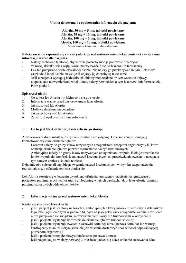 Ulotka dołączona do opakowania: informacja dla pacjenta Alortia, 50 mg + 5 mg, tabletki powlekane Alortia, 50 mg + 10 mg, tabletki powlekane Alortia, 100 mg + 5 mg, tabletki powlekane Alortia, 100 mg + 10 mg, tabletki powlekane Losartanum kalicum + Amlodipinum Należy uważnie zapoznać się z treścią ulotki przed zastosowaniem leku, ponieważ zawiera ona informacje ważne dla pacjenta. Należy zachować tę ulotkę, aby w razie potrzeby móc ją ponownie przeczytać. W razie jakichkolwiek wątpliwości należy zwrócić się do lekarza lub farmaceuty. Lek ten przepisano ściśle określonej osobie. Nie należy go przekazywać innym. Lek może zaszkodzić innej osobie, nawet jeśli objawy jej choroby są takie same. Jeśli u pacjenta wystąpią jakiekolwiek objawy niepożądane, w tym wszelkie objawy niepożądane niewymienione w tej ulotce, należy powiedzieć o tym lekarzowi lub farmaceucie. Patrz punkt 4. Spis treści ulotki 1. Co to jest lek Alortia i w jakim celu się go stosuje 2. Informacje ważne przed zastosowaniem leku Alortia 3. Jak stosować lek Alortia 4. Możliwe działania niepożądane 5. Jak przechowywać lek Alortia 6. Zawartość opakowania i inne informacje 1. Co to jest lek Alortia i w jakim celu się go stosuje Alortia zawiera dwie substancje czynne - losartan i amlodypinę. Obie substancje pomagają kontrolować wysokie ciśnienie tętnicze. Losartan należy do grupy leków nazywanych antagonistami receptora angiotensyny II, które obniżają ciśnienie tętnicze poprzez rozluźnianie naczyń krwionośnych. Amlodypina należy do grupy leków nazywanych antagonistami wapnia. Blokuje przenikanie jonów wapnia do komórek ścian naczyń krwionośnych, co przeciwdziała zwężaniu naczyń, a tym samym obniża ciśnienie tętnicze. Działanie obu substancji zapobiega zwężaniu naczyń krwionośnych, w wyniku czego naczynia rozluźniają się, a ciśnienie tętnicze obniża się. Lek Alortia stosuje się w leczeniu wysokiego ciśnienia tętniczego (nadciśnienia tętniczego) u pacjentów przyjmujących już losartan i amlodypinę w takich dawkach, jak w leku Alortia, zamiast przyjmowania dwóch oddzielnych leków. 2. Informacje ważne przed zastosowaniem leku Alortia Kiedy nie stosować leku Alortia jeżeli pacjent jest uczulony na losartan, amlodypinę lub którykolwiek z pozostałych składników tego leku (wymienionych w punkcie 6), bądź na jakiegokolwiek antagonistę wapnia. Uczulenie może przejawiać się świądem, zaczerwienieniem skóry lub trudnościami w oddychaniu. jeśli u pacjenta występuje bardzo niskie ciśnienie tętnicze (niedociśnienie); jeśli u pacjenta występuje zwężenie zastawki aortalnej serca (stenoza aortalna) lub wstrząs kardiogenny (stan, w którym serce nie jest w stanie dostarczyć krwi w ilości odpowiadającej potrzebom organizmu); jeśli u pacjenta wstępuje niewydolność serca po zawale serca; jeśli pacjentka jest w ciąży powyżej 3 miesiąca (zaleca się także unikanie stosowania leku 1 - Alortia we wczesnym okresie ciąży - patrz punkt „Ciąża i karmienie piersią”); jeśli u pacjenta występuje ciężkie zaburzenie czynności wątroby; jeśli pacjent ma cukrzycę lub zaburzenia czynności nerek i jest leczony lekiem obniżającym ciśnienie krwi zawierającym aliskiren. Ostrzeżenia i środki ostrożności Przed rozpoczęciem stosowania leku Alortia należy omówić to z lekarzem lub farmaceutą. Należy poinformować lekarza o ciąży, podejrzeniu lub planowaniu ciąży. Nie zaleca się stosowania leku Alortia we wczesnym okresie ciąży i nie wolno go przyjmować po 3 miesiącu ciąży, gdyż może poważnie zaszkodzić dziecku, jeśli zostanie podany w tym okresie (patrz punkt ,,Ciąża i karmienie piersią’’). Przed zastosowaniem leku Alortia należy koniecznie poinformować lekarza: jeżeli u pacjenta występował w przeszłości obrzęk naczynioruchowy (obrzęk twarzy, warg, gardła i (lub) języka, patrz punkt 4); jeżeli u pacjenta występują silne wymioty lub biegunka, prowadzące do znacznej utraty płynów i (lub) soli z organizmu; jeśli pacjent stosuje leki moczopędne (leki zwiększające ilość wody wydalanej przez nerki) lub dietę z małą ilością soli, co powoduje nadmierną utratę płynów i soli; jeśli u pacjenta występuje zwężenie lub zablokowanie naczyń krwionośnych prowadzących do nerek lub jeśli pacjentowi niedawno przeszczepiono nerkę; jeśli u pacjenta występuje zaburzenie czynności wątroby (patrz punkt 2 „Kiedy nie stosować leku Alortia”); jeśli u pacjenta występuje niewydolność serca z lub bez zaburzenia czynności nerek lub ciężkie, zagrażające życiu zaburzenia rytmu serca - niezbędne jest zachowanie szczególnej ostrożności w przypadku jednoczesnego leczenia ß-adrenolitykami; jeżeli u pacjenta występują choroby zastawek lub mięśnia sercowego; jeżeli u pacjenta występuje choroba wieńcowa (spowodowana zmniejszeniem przepływu krwi w naczyniach krwionośnych serca) lub choroba naczyniowo-mózgowa (spowodowana zmniejszeniem przepływu krwi w mózgu); jeżeli u pacjenta występuje hiperaldosteronizm pierwotny (choroba spowodowana zwiększonym wydzielaniem aldosteronu przez nadnercza, na skutek zaburzeń tych gruczołów); jeżeli pacjent niedawno przebył zawał serca; jeśli u pacjenta występuje lub występowało znaczne zwiększenie ciśnienia tętniczego (przełom nadciśnieniowy); jeśli istnieje konieczność zwiększenia dawki u pacjenta w podeszłym wieku; jeśli pacjent przyjmuje którykolwiek z poniższych leków stosowanych w leczeniu wysokiego ciśnienia krwi: inhibitor konwertazy angiotensyny (ACE) (ang. Angiotensin Converting Enzyme Inhibitors, ACEI) (na przykład enalapryl, lizynopryl, ramipryl), w szczególności jeśli pacjent ma zaburzenia czynności nerek związane z cukrzycą, aliskiren. Lekarz prowadzący może monitorować czynność nerek, ciśnienie krwi oraz stężenie elektrolitów (np. potasu) we krwi w regularnyc