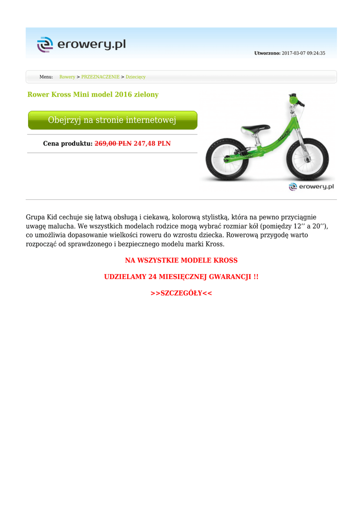 Utworzono: 2017-03-07 09:24:35 Menu: Rowery > PRZEZNACZENIE > Dziecięcy Rower Kross Mini model 2016 zielony Obejrzyj na stronie internetowej Cena produktu: 269,00 PLN 247,48 PLN Grupa Kid cechuje się łatwą obsługą i ciekawą, kolorową stylistką, która na pewno przyciągnie uwagę malucha. We wszystkich modelach rodzice mogą wybrać rozmiar kół (pomiędzy 12’’ a 20’’), co umożliwia dopasowanie wielkości roweru do wzrostu dziecka. Rowerową przygodę warto rozpocząć od sprawdzonego i bezpiecznego modelu marki Kross. NA WSZYSTKIE MODELE KROSS UDZIELAMY 24 MIESIĘCZNEJ GWARANCJI !! >>SZCZEGÓŁY<< Klamki hamulców Plastik Hamulce V-brake Kierownica Stal Mostek/ Wspornik kierownicy Stal Sztyca Stal Przeznaczenie Dziecięcy Piasta przód Stal 28H Piasta tył Stal 28H Obręcze Stal 28H Opony 12x2,125 Waga 12.0 Rozmiar kół 12" Sezon 2016 Rama Stal 12" Widelec/amortyzator Stal 12" Rozmiary ram - Mechanizm korbowy - Oś korbowodu - Prowadzenie łańcucha - Pedały - Siodło - Łańcuch - Kaseta/ wolnobieg - Szprychy - Wyposażenie dodatkowe - Typ roweru - Tylny amortyzator /Damper - Rodzina - Stery - Przerzutka przód - Przerzutka tył - Manetki - Kolor Producent Zielony_#008000 Kross Mimo dołożenia wszelkich starań nie gwarantujemy, że publikowane opisy i specyfikacje techniczne niezawierają uchybień lub błędów, które nie mogą jednak być podstawą do roszczeń. W przypadku jakichkolwiek wątpliwości, przed podjęciem decyzji prosimy o kontakt. Adres: www.erowery.pl Telefon: 605 515 185, 34 361 16 71 Email: [email protected]