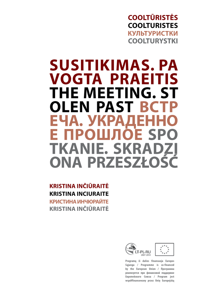 COOLTŪRISTĖS COOLTURISTES КУЛЬТУРИСТКИ COOLTURYSTKI SUSITIKIMAS. PA VOGTA PRAEITIS THE MEETING. ST OLEN PAST ВСТР EЧА. УКРАДЕННO E ПРОШЛОЕ SPO TKANIE. SKRADZI ONA PRZESZŁOŚĆ KRISTINA INČIŪRAITĖ KRISTINA INCIURAITE КРИСТИНА ИНЧЮРАЙТЕ KRISTINA INČIŪRAITĖ Programą iš dalies finansuoja Europos Sąjunga / Programme is co-financed by the European Union / Программа реализуется при финансовой поддержке Европейского Союза / Program jest współfinansowany przez Unię Europejską 91 Cooltūristės Kristina InČIŪRAITĖ Susitikimas. Pavogta praeitis The Meeting. Stolen Past Встрeча. Украденнoe прошлое Spotkanie. Skradziona Przeszłość 2013–2014 1 UDK 7.038(474.5)(064) Su87 PROJEKTAS „Pažink svetimšalį: savitarpio pažinimo skatinimas Gdansko, Kaliningrado ir Klaipėdos gyventojų tarpe per šiuolaikinės kultūros ir meno mainus“ PROJECT “Close Stranger: promoting mutual understanding between population of Gdansk, Kaliningrad and Klaipeda through facilitation of exchange in the field of contemporary arts and culture” Organizatorius / Organizer / Oрганизатор / Organizator Klaipėdos kultūrų komunikacijų centras / Klaipėda Culture Communication Centre, Lithuania / Центр коммуникаций культур Клайпеды, Литва / Centrum Komunikacji Kulturowej w Kłajpedzie, Litwa ПРОЕКТ «Близкий незнакомец: углубление взаимопонимания между населением Гданьска, Калининграда и Клайпеды посредством развития культурного сотрудничества и профессионального обмена в области современного искусства» PROJEKT “Bliski nieznajomy: promocja wzajemnego zrozumienia pomiędzy mieszkańcami Gdańska, Kaliningradu i Kłajpedy poprzez umożliwienie wymiany w dziedzinie współczesnej sztuki i kultury” Rėmėjas / Sponsor / Cпонсор / Sponsor Lietuvos respublikos kultūros ministerija / Ministry of Culture of the Republic of Lithuania / Министерство культуры Литовской Республики / Ministerstwo Kultury Republiki Litewskiej Parodos katalogas / Exhibition catalogue / Kaтaлог выставки / Katalog wstawy Nacionalinio šiuolaikinio meno centro Kaliningrado filialas, Rusija The Baltic Branch of the National Centre for Contemporary Arts, Kaliningrad, Russia Балтийский филиал Государственного центра современного искусства, Калининград, Россия Narodowym Centrum Sztuki Współczesnej Filia w Kaliningradzie, Rosja 22-11-2013–22-12-2013 Tekstų autoriai / Contributors / Авторы текстов / Autorzy tekstów: Kristina Inčiūraitė, Laima Kreivytė, Žygimantas Kudirka, Eglė Mikalajūnė Tekstų vertėjai / Translators / Переводчики текстов / Tłumaczenie: Jurij Dobriakov, Aleksandra Fomina, Božena Miežonis, Еlеnа Мinchеnia, Beata Piasecka Tekstų redaktoriai / Editors / Редакторы текстов / Redakcja: Joseph Everatt, Aleksandra Fomina, Neringa Mikalauskienė, Beata Piasecka Katalogo dizainerės / Designers / Дизайнеры каталога / Opracowanie graficzne: Violeta Boskaitė, Dainė Galinienė Katalogo leidėjas / Publisher / Издатель каталога / Wydawca katalogu: Klaipėdos kultūrų komunikacijų centras / www.kkkc.lt 2 Šiuolaikinio meno centras Laznia, Gdanskas, Lenkija The Łaźnia Centre for Contemporary Art, Gdansk, Poland Центр современного искусства Laznia, Гданьск, Польша Centrum Sztuki Współczesnej Łaźnia, Gdańsk, Polska 28-03-2014–27-04-2014 Dėkojame / Thanks to / Благодарим / Dziękujemy: Danil Akimov, Alexandra Artamonova, Eglė Ganda Bogdanienė, Jadwiga Charzyńska, Andrey Efits, Fernando Henrique, Marta Ivanova, Darius Jurevičius, Ignas Kazakevičius, Mindaugas Klusas, Monika Krikštopaitytė, Aleksandra Księżopolska, Žygimantas Kudirka, Agnieszka Kulazińska, Gabrielė Labanauskaitė, Santa Lingevičiūtė, Petras Mazūras, Božena Miežonis, Dalia Mikonytė, Vytautas Mikšionis, Aleksandra Musielak, Bronė Neverdauskienė, Darius Norkus, Paulina Eglė Pukytė, Trofim Popov, Zinaida Shershun, Mare Tralla, Elena Tsvetaeva, Evgeny Umansky, Marta Vosyliūtė, Agnieszka Wołodźko, Jolanta Woszczenko, Lina Zaveckytė © Cooltūristės, Kristina Inčiūraitė, 2013 © Laima Kreivytė, Eglė Mikalajūnė, Žygimantas Kudirka, 2013 © Klaipėdos kultūrų komunikacijų centras / Klaipėda Culture Communication Centre, Lithuania / Центр коммуникаций культур Клайпеды, Литва / Centrum Komunikacji Kulturowej w Kłajpedzie, Litwa, 2013 ISBN 978-9986-588-43-6 T u r i n y s / C o n t e n t / с од ер ж а н и е / s p i s t r e ś c i Co o lt ū r i s t ė s 4 D a r b a i / W o r k s / р а бот ы / p r a c e lAIMA K REIVYTĖ SUSITI K IMAS . P AVOGTA P RAEITIS 26 28 The meeting. stolen past В с тре ч а . У кр а д е н н ое про ш лое 30 32 Sp o t k a n i e . Sk r a d z i o n a p r z e s zł o ś ć Ž ygimantas Kudirka Gy vūnėlių logografas 34 L o g o g r a p h o f A n i m a l s i n Sp a c e Л огот и п и я ж и вот н ы х в ко с мо с е l o g o g r a f zw i e r z ą t e k w ко с мо s i е 34 35 35 EG L Ė MI K A L AJŪNĖ P a s i v a i kš č i o j i m a s p o p a r o d ą : a p i e e r d v e s t a r p k ū r i n i ų 42 A W a lk t h r o u g h t h e E x h i b i t i o n : O n t h e Sp a c e s b e t w e e n t h e W o r k s 48 П рогулк а по в ы с т а вке : о про с тр а н с тв а х ме ж д у про и з ве д е н и я м и 54 Sp a c e r p o w y s t a w i 
