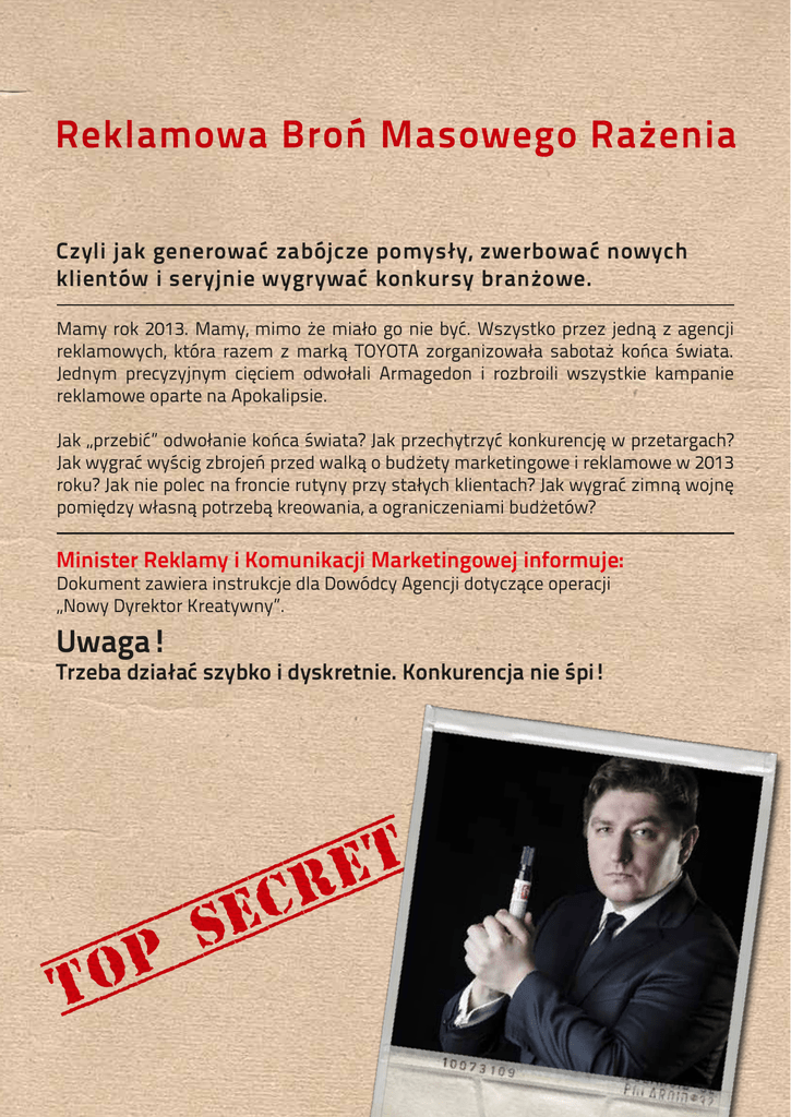 Czyli jak generować zabójcze pomysły, zwerbować nowych klientów i seryjnie wygrywać konkursy branżowe. Mamy rok 2013. Mamy, mimo że miało go nie być. Wszystko przez jedną z agencji reklamowych, która razem z marką TOYOTA zorganizowała sabotaż końca świata. Jednym precyzyjnym cięciem odwołali Armagedon i rozbroili wszystkie kampanie reklamowe oparte na Apokalipsie. Jak „przebić” odwołanie końca świata? Jak przechytrzyć konkurencję w przetargach? Jak wygrać wyścig zbrojeń przed walką o budżety marketingowe i reklamowe w 2013 roku? Jak nie polec na froncie rutyny przy stałych klientach? Jak wygrać zimną wojnę pomiędzy własną potrzebą kreowania, a ograniczeniami budżetów? Minister Reklamy i Komunikacji Marketingowej informuje: Dokument zawiera instrukcje dla Dowódcy Agencji dotyczące operacji „Nowy Dyrektor Kreatywny”. Uwaga! Trzeba działać szybko i dyskretnie. Konkurencja nie śpi! p o t c e s t e r INSTRUKCJE DLA DOwoDCY AGENCJI Misja: Rozwijać agencję na wielu frontach i kształtować jej charakter Cele: Utrzymać obecne budżety klientów i zdobyć nowe Wprowadzić innowacje do bieżących projektów Działać lepiej i szybciej niż konkurencja Wywalczyć odznaczenia branżowe i zaszczytne tytuły Wytyczne: Pozyskać Roberta Wójcika – jedyny taki egzemplarz Dyrektora Kreatywnego specyfikacja techniczna: Personalnie: Robert Marcin Wójcik; 30 lat; jedna bojowa żona, zero dzieci, jeden kot obronny; obecnie stacjonuje na warszawskim Bemowie Edukacyjnie: AWF Warszawa, Fizjoterapia (2000-2004) Akademia Leona Koźmińskiego, Socjologia (2007-2009) Szkoleniowo: Rynek, lektury, konferencje i wykłady organizowane przez instytucje branżowe (2006-obecnie) Zawodowo: Agencje promocyjne (2000–2005) Promotor marek efekty: tysiące sprzedanych BOMBonierek, jogurtów, serków, butelek piwa, przysmaków dla psów i kotów GFK Polonia i TNS OBOP (2005–2006) Ankieter efekty: tysiące zwerbowanych i przesłuchanych respondentów Agencja Link PR (2006-obecnie) Specjalista ds. eventów i sponsoringu (1 rok), Specjalista PR (1 rok), PR & Marketing Manager (5 lat, w praktyce: strateg/analityk/kreatywny/copywriter/dyrektor kreatywny) efekty: 32 strategie oraz koncepcje kreatywne i PR wprowadzone w życie, 65 skutecznych prezentacji, 95 komunikatów prasowych i zaproszeń, 154 scenariusze eventów, spotów oraz materiałów promocyjnych do mediów, ponad 20 000 znaków wydrukowanych w ulotkach i folderach… oraz drugie tyle koncepcj i projektów, które przeszły koło nosa; obsługiwani Klienci agencji i Partnerzy projektów: PL. 2012, Grupa LOTOS SA, PZU Pomoc SA, PGNiG SA, OTOMOTO, ATRIUM Europe Real Estate, ASUS, GARMIN, Zachodniopomorskie, Mazowieckie, MZD Toruń, Narodowy Instytut Fryderyka Chopina, Krajowe Centrum ds. AIDS, Ministerstwo Rozwoju Regionalnego Link OnCreative (marka kreatywna Link PR, listopad 2012-obecnie) Dyrektor Kreatywny efekty: stworzenie marki, opracowanie oferty… przechytrzenie Chytrej baby z Radomia i odbicie jej zakładnika ZBYSZKO COMPANY Sp. z o.o. Pan Kreatywny (2011–obecnie) freelance efekty: doradztwo marketingowe i PR oraz copywriting dla www.mpac.pl oraz www.forex-coaching.com; koncepcja wydarzenia z okazji „końca świata” z udziałem 2KC, CEDC, SAR i KTR, British American Tobacco jezykowo: język reklamy i język perswazji – intuicyjnie, język angielski - biegle, ale dawno nie biegał; niemiecki i rosyjski –dawno temu w legii cudzoziemskiej, do odszyfrowania Hobbistycznie: dobra reklama, kreatywny marketing, hipnotyzujące historie, przyczepne koncepcje, poruszające filmy, sporty zespołowe, energetyczna muzyka Wsparcie jednostki SWOT: Mocne strony: postrzega rzeczywistość wokół siebie w 4 wymiarze: reklamowym ze wszystkiego jest w stanie zrobić kampanię, reklamę lub slogan rzeczy zwykłe przemienia w oryginalne, a skomplikowane wproste tortury nie odciągną go od pomysłu, w który głęboko wierzy z łatwością wciela się w rolę klienta agencji i klientów klienta robi bardzo dokładne rozpoznanie zanim przystąpi do akcji czyta w myślach klienta działa w pojedynkę lub w grupie, w zależności od sytuacji na froncie inspiruje do twórczego i samodzielnego myślenia – przejmuje dowodzenie gdy trzeba używa intuicji zamiast GPS Słabe strony: generuje zbyt wiele pomysłów i zbyt wiele uwagi poświęca analizie i rozpoznaniu poznaje ludzi z irytującą łatwością i potrafi być bardzo bezpośredni jest niepoprawnym optymistą, nie dopuszcza myśli o porażce zdarza się, że jego wizja i rozmach mocno wykraczają poza dostępny budżet czasem nie znosi sprzeciwu, zwłaszcza gdy chodzi o koncepcje generuje pomysły przed doczytaniem instrukcji do końca szybko zakochuje się w produkcie klienta i równie szybko odkochuje (np. gdy agencja zaczyna pracować dla konkurencji) Perspektywy: zaskoczy bardzo pozytywnie i wniesie nową jakość koncepcyjną i kreacyjną uratuje projekty, które agencja już dawno porzuciła na polu bitwy dostarczy wiele autorskich pomysłów na kampanie i projekty zwerbuje nowych klientów komercyjnych i instytucjonalnych sprzątnie nagrody konkurencji sprzed nosa Zagrożenia: zarzuci agencję liczbą pomysłów wymagającą dodatkowego zatrudnienia zacznie wygrywać zamówienia publiczne, nawet te zaminowane przejdzie na „Ty” z najważniejszym klientem agencji już w czasie pierwszej rozmowy zacznie strzelać pomysłami już podczas rozmowy kwalifikacyjnej i rozmówca będzie musiał poddać się „Jak się pracuje z Robertem? Szybko uświadamiasz sobie, że nie jesteś w stanie zaabsorbować jego kolejnych pomysłów. Następuje rwanie włosów z głowy, dwie serie pompek, rehabilitacja w kriokomorze i… nagle stwierdzasz, że masz świetny koncept przemyślany w każdym szczególe. W przypadku Roberta trzy kluczowe kwestie to: odwaga, wszechstronność i naprawdę rozbrajająca oraz przede wszystkim efektywna kreatywność!” Karolina Tomczyk –
