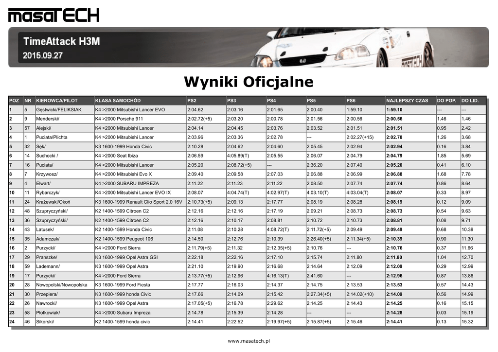 Wyniki Oficjalne POZ NR KIEROWCA/PILOT KLASA SAMOCHÓD PS2 PS3 PS4 PS5 PS6 NAJLEPSZY CZAS DO POP. DO LID. 1 5 Gęstwicki/FELIKSIAK K4 >2000 Mitsubishi Lancer EVO 2:04.62 2:03.16 2:01.65 2:00.40 1:59.10 1:59.10 --- --- 2 9 Menderski/ K4 >2000 Porsche 911 2:02.72(+5) 2:03.20 2:00.78 2:01.56 2:00.56 2:00.56 1.46 1.46 3 57 Alejski/ K4 >2000 Mitsubishi Lancer 2:04.14 2:04.45 2:03.76 2:03.52 2:01.51 2:01.51 0.95 2.42 4 1 Puciata/Plichta K4 >2000 Mitsubishi Lancer 2:03.96 2:03.36 2:02.78 --- 2:02.27(+15) 2:02.78 1.26 3.68 5 32 Sęk/ K3 1600-1999 Honda Civic 2:10.28 2:04.62 2:04.60 2:05.45 2:02.94 2:02.94 0.16 3.84 6 14 Suchocki / K4 >2000 Seat Ibiza 2:06.59 4:05.89(T) 2:05.55 2:06.07 2:04.79 2:04.79 1.85 5.69 7 16 Puciata/ K4 >2000 Mitsubishi Lancer 2:05.20 2:08.72(+5) --- 2:36.20 2:07.40 2:05.20 0.41 6.10 8 7 Krzywosz/ K4 >2000 Mitsubishi Evo X 2:09.40 2:09.58 2:07.03 2:06.88 2:06.99 2:06.88 1.68 7.78 9 4 Elwart/ K4 >2000 SUBARU IMPREZA 2:11.22 2:11.23 2:11.22 2:08.50 2:07.74 2:07.74 0.86 8.64 10 11 Rybarczyk/ K4 >2000 Mitsubishi Lancer EVO IX 2:08.07 4:04.74(T) 4:02.97(T) 4:03.10(T) 4:03.04(T) 2:08.07 0.33 8.97 11 24 Krażewski/Okoń K3 1600-1999 Renault Clio Sport 2,0 16V 2:10.73(+5) 2:09.13 2:17.77 2:08.19 2:08.28 2:08.19 0.12 9.09 12 48 Szupryczyński/ K2 1400-1599 Citroen C2 2:12.16 2:12.16 2:17.19 2:09.21 2:08.73 2:08.73 0.54 9.63 13 36 Szupryczyński/ K2 1400-1599 Citroen C2 2:12.16 2:10.17 2:08.81 2:10.72 2:10.73 2:08.81 0.08 9.71 14 43 Latusek/ K2 1400-1599 Honda Civic 2:11.08 2:10.28 4:08.72(T) 2:11.72(+5) 2:09.49 2:09.49 0.68 10.39 15 35 Adamczak/ K2 1400-1599 Peugeot 106 2:14.50 2:12.76 2:10.39 2:26.40(+5) 2:11.34(+5) 2:10.39 0.90 11.30 16 2 Purzycki/ K4 >2000 Ford Sierra 2:11.79(+5) 2:11.32 2:12.35(+5) 2:10.76 --- 2:10.76 0.37 11.66 17 29 Pranszke/ K3 1600-1999 Opel Astra GSI 2:22.18 2:22.16 2:17.10 2:15.74 2:11.80 2:11.80 1.04 12.70 18 59 Lademann/ K3 1600-1999 Opel Astra 2:21.10 2:19.90 2:16.68 2:14.64 2:12.09 2:12.09 0.29 12.99 19 17 Purzycki/ K4 >2000 Ford Sierra 2:13.77(+5) 2:12.96 4:16.13(T) 2:41.60 --- 2:12.96 0.87 13.86 20 28 Nowopolski/Nowopolska K3 1600-1999 Ford Fiesta 2:17.77 2:16.03 2:14.37 2:14.75 2:13.53 2:13.53 0.57 14.43 21 30 Przepiera/ K3 1600-1999 honda Civic 2:17.66 2:14.09 2:15.42 2:27.34(+5) 2:14.02(+10) 2:14.09 0.56 14.99 22 26 Nawrocki/ K3 1600-1999 Opel Astra 2:17.05(+5) 2:16.78 2:29.62 2:14.25 2:14.43 2:14.25 0.16 15.15 23 58 Płotkowiak/ K4 >2000 Subaru Impreza 2:14.78 2:15.39 2:14.28 --- --- 2:14.28 0.03 15.19 24 46 Sikorski/ K2 1400-1599 honda civic 2:14.41 2:22.52 2:19.97(+5) 2:15.87(+5) 2:15.46 2:14.41 0.13 15.32 www.masatech.pl POZ NR KIEROWCA/PILOT KLASA SAMOCHÓD PS2 PS3 PS4 PS5 PS6 NAJLEPSZY CZAS DO POP. DO LID. 25 33 Łangowski/Łangowski K3 1600-1999 Renault Clio Sport 2:21.50 2:20.34 2:17.53 2:14.49 2:15.52 2:14.49 0.08 15.39 26 51 Jakubowski/ K4 >2000 Honda Prelude 4:17.34(T) 4:13.72(T) 2:13.85(+5) 2:16.63(+5) 2:15.33 2:15.33 0.84 16.24 27 25 Krzysztof /Przemysław K3 1600-1999 VW Golf III GTI 2:17.32(+5) 2:14.79(+5) 4:52.18(T) 2:16.01(+10) 2:15.47 2:15.47 0.14 16.38 28 20 Czarnecki/ K3 1600-1999 Honda Civic 2:27.30 4:18.24(T) 2:16.67 4:15.11(T) 2:15.65 2:15.65 0.17 16.55 29 12 Saath/ K4 >2000 Mitsubishi Eclipse 2:17.66 2:18.02 2:17.42(+5) 2:15.78 2:20.71 2:15.78 0.14 16.69 30 44 Mazurkiewicz/ K2 1400-1599 Honda CRX 4:18.26(T) 4:27.29(T) 2:17.42(+5) 2:16.16 2:16.03 2:16.03 0.24 16.93 31 22 Gebert/ K3 1600-1999 Honda Civic EG 2:20.66 4:19.72(T) 2:19.26(+5) 2:17.90 2:16.05 2:16.05 0.02 16.95 32 10 POPEK / K4 >2000 BMW E36 2:20.35(+5) 2:19.49 2:26.71(+10) 2:17.61 2:16.13 2:16.13 0.08 17.04 33 31 Smoliński/ K3 1600-1999 Nissan Sunny 4:18.45(T) 2:22.65 2:16.82 2:17.02 2:17.40 2:16.82 0.69 17.73 34 15 ŁAJEWSKI/STENCEL K4 >2000 VW GOLF II 4:13.89(T) 2:18.13 4:18.29(T) 4:17.13(T) 4:25.42(T) 2:18.13 1.30 19.03 35 18 Czerwińska-Albin/ K3 1600-1999 Seat Ibiza 2:20.73 2:18.72 2:19.54 --- --- 2:18.72 0.59 19.62 36 23 Kleinschmidt/ K3 1600-1999 BMW 320 2:25.18 2:22.79 2:20.22 2:19.02 --- 2:19.02 0.31 19.93 37 40 Filar/Filar K2 1400-1599 Honda ED6 2:27.53 2:20.06 2:18.32(+10) 2:17.00(+5) 2:26.06(+5) 2:20.06 1.04 20.96 38 52 Majchrowski / K1 <1400 Fiat CINQUECENTO 2:26.88 2:26.86 2:23.07 2:21.57 2:22.20 2:21.57 1.51 22.47 39 27 Nogal/ K3 1600-1999 Nissan Primera 2:26.24 2:24.71 2:25.11 2:24.50 2:23.22 2:23.22 1.65 24.12 40 42 Kalinowski/ K2 1400-1599 Honda Civic V Coupe 2:31.20(+5) 2:28.15 2:25.37(+10) 2:26.01 2:23.35 2:23.35 0.14 24.26 41 6 Krzemiński/ K4 >2000 Mazda RX-8 2:26.47 3:47.06 2:24.42(+5) 2:24.34 2:28.67 2:24.34 0.98 25.24 42 47 Sikora/ K1 <1400 Honda Civic 2:32.37 2:28.39 2:27.05 2:24.38 4:27.38(T) 2:24.38 0.04 25.28 43 54 Klasa/ K1 <1400 Honda Civic 2:27.70(+5) 2:29.18 2:25.93 2:24.56 2:24.65(+5) 2:24.56 0.19 25.47 44 34 Albin/ K3 1600-1999 Seat Ibiza 2:32.71 4:27.27(T) 2:24.97 --- --- 2:24.97 0.40 25.87 45 60 Gospodarek/ K2 1400-1599 Honda Civic 2:29.43 2:29.37 2:25.64 2:25.15 2:31.84 2:25.15 0.18 26.05 46 13 Spieglanin/ K4 >2000 Lada 2107 2:26.84 2:29.04 2:32.72 2:26.75 2:25.98 2:25.98 0.83 26.88 47 55 Zięba/ K1 <1400 Fiat Seicento 2:35.29 2:31.00 2:28.96 2:29.24 2:28.72 2:28.72 2.74 29.62 48 49 Bojar/ K1 <1400 toyota corolla 4:35.27(T) 2:31.51(+5) 2:33.63(+10) 2:31.14 2:28.18(+5) 2:31.14 2.42 32.05 49 38 Barczak/ K2 1400-1599 Honda Civic --- 2:34.68 4:21.04(T) 4:14.81(T) 4:14.78(T) 2:34.68 3.54 35.58 50 53 Popowicz/ K1 <1400 Fiat Seicento 2:43.76 2:43.14 2:42.26 2:40.04 2:43.33 2:40.04 5.36 40.95 51 50 Gregorczyk/ K1 <1400 honda civic 2:37.66(+5) 4:34.22(T) 4:26.73(T) 4:40.12(T) 4:28.38(T) 2:42.66 2.62 43.56 52 39 Dawidowicz/ K2 1400-1599 Citroen C2 4:18.74(T) 4:17.65(T) 4:16.57(T) 4:15.30(T) 4:16.26(T) 4:15.30 1:32.64 2:16.20 53 37 Albiński/Suwała K2 1400-1599 Honda Civic 4:21.67(T) 4:25.44(T) 4:20.26(T) 4:18.38(T) 4:18.04(T) 4:18.04 2.74 2:18.94 54 41 Frąszczak/ K2 1400-1599 Peugeot 106 4:22.06(T) --- --- --- --- 4:22.06 4.02 2:22.96 55 56 Skrzyński/Wysiecka K1 <1400 Toyota Starlet 4:30.87(T) 4:27.18(T) 4:26.87(T) 4:27.95(T) 4:27