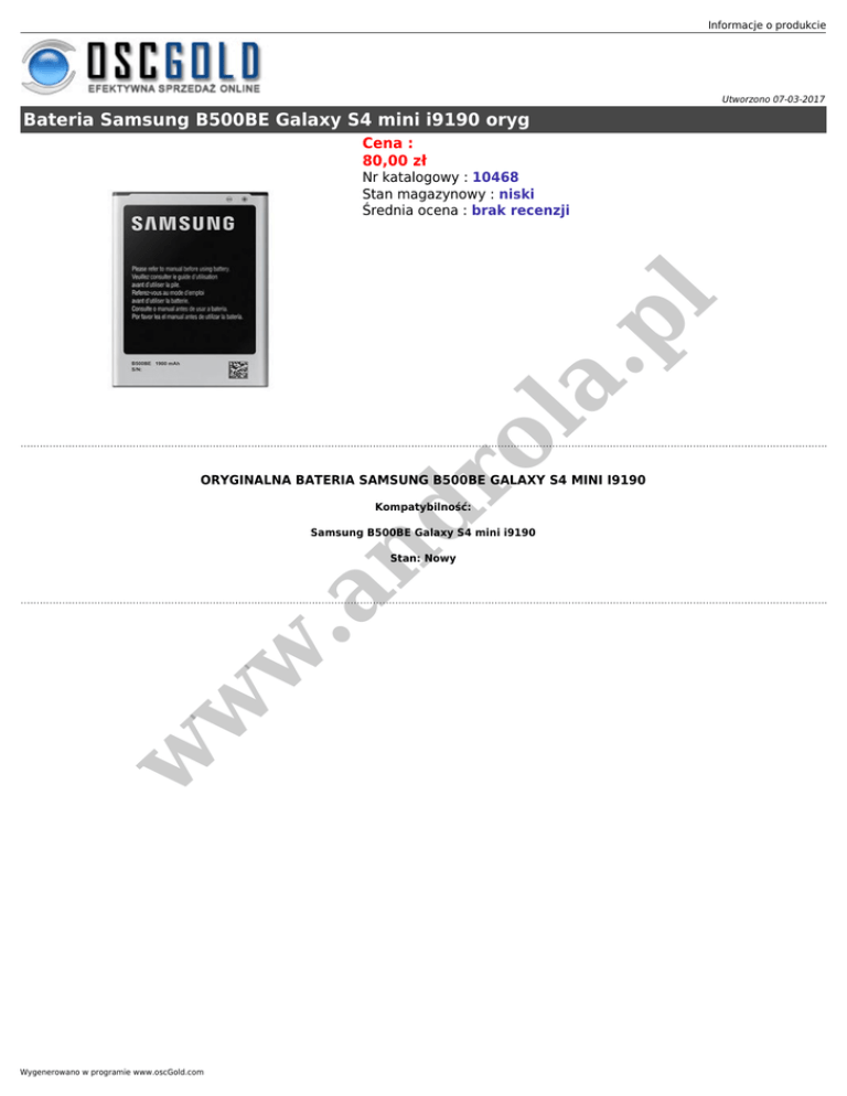 Informacje o produkcie Utworzono 07-03-2017 Bateria Samsung B500BE Galaxy S4 mini i9190 oryg Cena : 80,00 zł ro la .p l Nr katalogowy : 10468 Stan magazynowy : niski Średnia ocena : brak recenzji ORYGINALNA BATERIA SAMSUNG B500BE GALAXY S4 MINI I9190 nd Kompatybilność: Samsung B500BE Galaxy S4 mini i9190 w w w .a Stan: Nowy Wygenerowano w programie www.oscGold.com