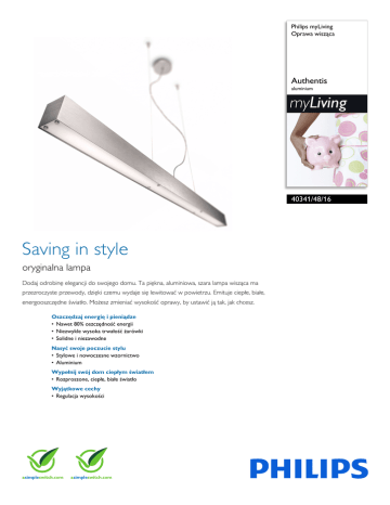 Philips myLiving Oprawa wisząca Authentis aluminium myLiving 40341/48/16 Saving in style oryginalna lampa Dodaj odrobinę elegancji do swojego domu. Ta piękna, aluminiowa, szara lampa wisząca ma przezroczyste przewody, dzięki czemu wydaje się lewitować w powietrzu. Emituje ciepłe, białe, energooszczędne światło. Możesz zmieniać wysokość oprawy, by ustawić ją tak, jak chcesz. Oszczędzaj energię i pieniądze • Nawet 80% oszczędność energii • Niezwykle wysoka trwałość żarówki • Solidne i niezawodne Nasyć swoje poczucie stylu • Stylowe i nowoczesne wzornictwo • Aluminium Wypełnij swój dom ciepłym światłem • Rozproszone, ciepłe, białe światło Wyjątkowe cechy • Regulacja wysokości 403414816 Oprawa wisząca Authentis aluminium Zalety Dane techniczne Nawet 80% oszczędność energii części i materiałów. To doskonałe oprawy na wiele, wiele lat. Stylowe i nowoczesne wzornictwo Linia Ecomoods charakteryzuje się czystym, nowoczesnym wyglądem, który przełamuje stereotyp tradycyjnych produktów energooszczędnych — masywnych i nieatrakcyjnych. Jest smukła i stylowa — każda oryginalna lampa z tej kolekcji została starannie zaprojektowana jako idealne połączenie formy i funkcjonalności. Rozproszone, ciepłe, białe światło Dużą zaletą fluorescencyjnego oświetlenia jest jego energooszczędność. Świetlówka zużywa jedynie jedną piątą energii wykorzystywanej przez konwencjonalną żarówkę. To oznacza, że instalując oświetlenie fluorescencyjne firmy Philips w swoim domu zamiast standardowych żarówek, możesz obniżyć rachunki za prąd o około 80%! Stylistyka i wykończenie • Materiał: metal, syntetyk • Kolor: aluminium Dodatkowe funkcje/akcesoria w zestawie • Świetlówki w zestawie • Regulacja wysokości Wymiary i waga produktu • • • • • Minimalna wysokość: 0,0 cm Maksymalna wysokość: 206,2 cm Długość: 117,5 cm Szerokość: 5,5 cm Waga netto: 2,791 kg Dane techniczne • • • • • • Niezwykle wysoka trwałość żarówki Ta lampa wykorzystuje najnowszą technologię opracowaną przez firmę Philips, która pozwala uzyskać ciepłe, naturalne, białe światło przy jednoczesnej oszczędności energii. Efekt rozproszonego światła rozjaśni pomieszczenie ciepłym, białym blaskiem. Produkt łączy w sobie funkcjonalność i dbałość o środowisko. Rozproszone światło nadaje się idealnie do ogólnego oświetlenia. Regulacja wysokości • • • • • • • • • • Zasilanie sieciowe: 230 V, 50 Hz Technologia źródła światła: fluorescencyjne, 230 V Liczba źródeł światła: 1 Trzonek: G5 Moc źródła światła w zestawie: 28 W Maksymalna moc wymiennego źródła światła: 28 W Barwa światła: ciepła biel Maksymalna trwałość źródła światła: 24 000 godz. Oprawa z możliwością przyciemniania: Nie LED: Nie Wbudowane źródło światła LED: NIE Klasa energetyczna dołączonego źródła światła: A+ Oprawa jest zgodna ze źródłami światła klasy: A++ do E Współczynnik IP: IP20, ochrona przed przedmiotami powyżej 12,5 mm, brak ochrony przed wodą Klasa ochronności: I — uziemienie Moc strumienia świetlnego dołączonego źródła światła w lumenach: 2900 lm W zestawie żarówka firmy Philips o niezwykłej trwałości — do 20 000 godzin użytkowania. Serwis Solidne i niezawodne Wymiary i waga opakowania • Gwarancja: 2 lata • • • • Wysokość: 119,4 cm Długość: 12,4 cm Szerokość: 10,5 cm Waga: 3,573 kg Różne Oprawa firmy Philips jest wyposażona w długie przewody, co zapewnia większą elastyczność podczas instalacji. Wybierz odpowiednią wysokość w zależności od potrzeb. Produkty oświetleniowe Ecomoods firmy Philips gwarantują trwałość przez długi czas, ponieważ każdy ich moduł jest wykonany z wysokiej jakości Aluminium Aluminium to bardzo nowoczesny, miękki, wytrzymały, lekki materiał o stonowanym srebrnym kolorze. Data wydania 2016-01-18 © 2016 Koninklijke Philips N.V. Wszelkie prawa zastrzeżone. Wersja: 6.1.2 Dane techniczne mogą ulec zmianie bez powiadomienia. Znaki towarowe są własnością Koninklijke Philips N.V. lub własnością odpowiednich firm. 12 NC: 9150 000 41101 EAN: 87 27900 74600 6 www.philips.com • Opracowano z myślą o: Salon i sypialnia, Gabinet • Styl: Nowoczesna • Typ: Oprawa wisząca •