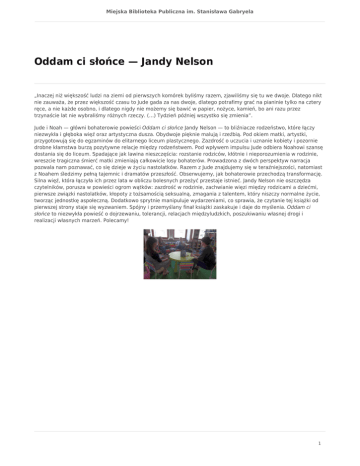 Miejska Biblioteka Publiczna im. Stanisława Gabryela Oddam ci słońce — Jandy Nelson „Inaczej niż większość ludzi na ziemi od pierwszych komórek byliśmy razem, zjawiliśmy się tu we dwoje. Dlatego nikt nie zauważa, że przez większość czasu to Jude gada za nas dwoje, dlatego potrafimy grać na pianinie tylko na cztery ręce, a nie każde osobno, i dlatego nigdy nie możemy się bawić w papier, nożyce, kamień, bo ani razu przez trzynaście lat nie wybraliśmy różnych rzeczy. (…) Tydzień później wszystko się zmienia”. Jude i Noah — główni bohaterowie powieści Oddam ci słońce Jandy Nelson — to bliźniacze rodzeństwo, które łączy niezwykła i głęboka więź oraz artystyczna dusza. Obydwoje pięknie malują i rzeźbią. Pod okiem matki, artystki, przygotowują się do egzaminów do elitarnego liceum plastycznego. Zazdrość o uczucia i uznanie kobiety i pozornie drobne kłamstwa burzą pozytywne relacje między rodzeństwem. Pod wpływem impulsu Jude odbiera Noahowi szansę dostania się do liceum. Spadające jak lawina nieszczęścia: rozstanie rodziców, kłótnie i nieporozumienia w rodzinie, wreszcie tragiczna śmierć matki zmieniają całkowicie losy bohaterów. Prowadzona z dwóch perspektyw narracja pozwala nam poznawać, co się dzieje w życiu nastolatków. Razem z Jude znajdujemy się w teraźniejszości, natomiast z Noahem śledzimy pełną tajemnic i dramatów przeszłość. Obserwujemy, jak bohaterowie przechodzą transformację. Silna więź, która łączyła ich przez lata w obliczu bolesnych przeżyć przestaje istnieć. Jandy Nelson nie oszczędza czytelników, porusza w powieści ogrom wątków: zazdrość w rodzinie, zachwianie więzi między rodzicami a dziećmi, pierwsze związki nastolatków, kłopoty z tożsamością seksualną, zmagania z talentem, który niszczy normalne życie, tworząc jednostkę aspołeczną. Dodatkowo sprytnie manipuluje wydarzeniami, co sprawia, że czytanie tej książki od pierwszej strony staje się wyzwaniem. Spójny i przemyślany finał książki zaskakuje i daje do myślenia. Oddam ci słońce to niezwykła powieść o dojrzewaniu, tolerancji, relacjach międzyludzkich, poszukiwaniu własnej drogi i realizacji własnych marzeń. Polecamy! 1