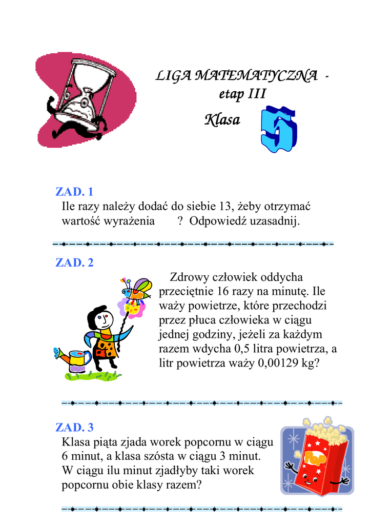 LIGA MATEMATYCZNA etap II III Klasa ZAD. 1 Ile razy należy należyy dodać doda do siebie 13, żeby żeby otrzymać otrzyma wartość wyrażenia wartość wyra ? Odpowiedź Odpowied uzasadnij. ZAD. 2 Zdrowy człowiek oddycha przeciętnie przeciętnie tnie 16 razy na minutę. minut minutę Ile w y powietrze, które przechodzi waży przez płuca człowieka w ciągu ci jednej godziny, jeżeli jeżeli eli za każdym ka razem wdycha 0,5 litra powietrza, a litr powietrza waży waży y 0,00129 kg? ZAD. 3 Klasa piąta pi ta zjada worek popcornu w ciągu pią ciągu 6 minut, a klasa szósta w ciągu ci cią 3 minut. W ciągu ciągu gu ilu minut zjadłyby taki worek popcornu obie klasy razem? ZAD. 4 W Zakładzie Przyrodoleczniczym Przyrodoleczniczym w Kołobrzegu dno basenu solankowego solankowego ma kształt pięciokąta jak na rysunku. Jaką pięcioką Jaką miar miaręę ma kąt k BCA? ZAD. 5 Figa z makiem kosztuje 3,20 zł. Figa jest dro sza od mak o 3 zł. Ile kosztuje mak? droższa Powodzenia! Opracowała : Renata Gawliń Gawli Gawlińska-Pompe Pompe