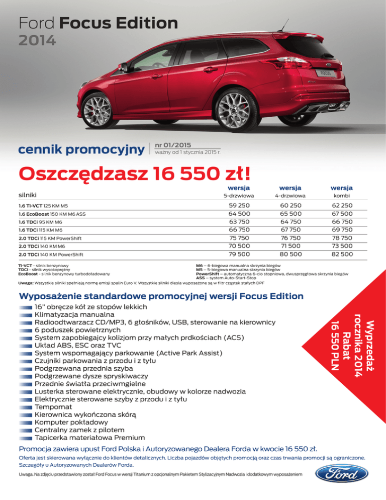 Ford Focus Edition 2014 cennik promocyjny nr 01/2015 ważny od 1 stycznia 2015 r. Oszczędzasz 16 550 zł! silniki wersja wersja wersja 5-drzwiowa 4-drzwiowa kombi 1.6 Ti-VCT 125 KM M5 59 250 60 250 62 250 1.6 EcoBoost 150 KM M6 ASS 64 500 65 500 67 500 1.6 TDCi 95 KM M6 63 750 64 750 66 750 1.6 TDCi 115 KM M6 66 750 67 750 69 750 2.0 TDCi 115 KM PowerShift 75 750 76 750 78 750 2.0 TDCi 140 KM M6 70 500 71 500 73 500 2.0 TDCi 140 KM PowerShift 79 500 80 500 82 500 Ti-VCT - silnik benzynowy TDCi - silnik wysokoprężny EcoBoost - silnik benzynowy turbodoładowany M6 – 6-biegowa manualna skrzynia biegów M5 – 5-biegowa manualna skrzynia biegów PowerShift – automatyczna 6-cio stopniowa, dwusprzęgłowa skrzynia biegów ASS – system Auto-Start-Stop Uwaga: Wszystkie silniki spełniają normę emisji spalin Euro V. Wszystkie silniki diesla wyposażone są w filtr cząstek stałych DPF Wyposażenie standardowe promocyjnej wersji Focus Edition Wyprzedaż rocznika 2014 Rabat 16 550 PLN 16” obręcze kół ze stopów lekkich Klimatyzacja manualna Radioodtwarzacz CD/MP3, 6 głośników, USB, sterowanie na kierownicy 6 poduszek powietrznych System zapobiegajcy kolizjom przy małych prdkościach (ACS) Układ ABS, ESC oraz TVC System wspomagający parkowanie (Active Park Assist) Czujniki parkowania z przodu i z tyłu Podgrzewana przednia szyba Podgrzewane dysze spryskiwaczy Przednie światła przeciwmgielne Lusterka sterowane elektrycznie, obudowy w kolorze nadwozia Elektrycznie sterowane szyby z przodu i z tyłu Tempomat Kierownica wykończona skórą Komputer pokładowy Centralny zamek z pilotem Tapicerka materiałowa Premium Promocja zawiera upust Ford Polska i Autoryzowanego Dealera Forda w kwocie 16 550 zł. Oferta jest skierowana wyłącznie do klientów detalicznych. Liczba pojazdów objętych promocją oraz czas trwania promocji są ograniczone. Szczegóły u Autoryzowanych Dealerów Forda. Uwaga. Na zdjęciu przedstawiony został Ford Focus w wersji Titanium z opcjonalnym Pakietem Stylizacyjnym Nadwozia i dodatkowym wyposażeniem Ford Focus PROMO 2015 CJA od...1. s t y .. c z do..3.1. m ....n..i a...2.0.1.5. .. a r ....c.a.. 2 0 lub wy ....1.5. c pojazd zerpania ów ob j´tych zapasów promo cjà Pakiety promocyjne: Dla wersji AMBIENTE pakiet promocyjny START Klimatyzacja manualna Radioodtwarzacz p∏yt CD/MP3, wyÊwietlacz 3,5“, zintegrowany panel sterowania, 6 g∏oÊników, gniazdo USB, zdalne sterowanie na kierownicy (zawiera komputer pok∏adowy) cena cena promocyjna oszcz´dnoÊç podstawowa pakietu przy zakupie pakietu z VAT z VAT pakietu 4 500 2 500 7 000 Dla wersji TREND, pakiet promocyjny 3 500 50% EDITION START, EDITION i EDITION ECOBOOST 1.0 Klimatyzacja dwustrefowa z automatycznà regulacjà temperatury (DEATC) 2 500 Radioodtwarzacz CD/MP3 z Ford SYNC i AppLink (zestaw g∏oÊnomówiàcy z Bluetooth® i rozbudowanà funkcjà sterowania g∏osem - bez j´zyka polskiego oraz funkcjà wzywania pomocy), 6 g∏oÊników, gniazdo USB/iPod®, gniazdo AUX-IN, zdalne sterowanie na kierownicy) (ICFAE) 1 200 Przednie Êwiat∏a przeciwmgielne 800 Konsola centralna Premium 500 Elektrycznie sterowane szyby przednich i tylnych drzwi, opuszczane i podnoszone jednym naciÊni´ciem przycisku, z czujnikami przeszkody, z funkcjà ca∏kowitego otwierania i zamykania wszystkich szyb 450 Aktywne zabezpieczenie kraw´dzi drzwi 250 5 700 3 100 45% Oferta promocyjna przygotowana wspólnie przez Ford Polska Sp. z o.o. i Autoryzowanych Dealerów Forda. Ford Focus Edition 2014 wyposażenie bezpieczeństwo System ABS z elektronicznym podziałem siły hamowania (EBD) Elektroniczny układ stabilizacji toru jazdy (ESC) z układem kontroli trakcji (TA) oraz układem wspomagania awaryjnego hamowania (EBA) Poduszki powietrzne czołowe kierowcy i pasażera z przodu Poduszki powietrzne boczne kierowcy i pasażera z przodu Boczne kurtyny powietrzne chroniące osoby w 1 i 2 rzędzie siedzeń System zapobiegający kolizjom przy małych prędkościach (ACS) System monitorowania martwego pola widzenia w lusterkach (BLIS) (zawiera elektrycznie składane i podgrzewane lusterka z lampkami oświetlającymi podłoże oraz elektrycznie sterowane szyby tylnych drzwi) Przednie światła przeciwmgielne System reflektorów automatycznych z automatycznymi wycieraczkami z czujnikiem deszczu, automatycznie ściemniającym się lusterkiem wstecznym, funkcją wyłączania świateł z opóśnieniem oraz ze światłami przeciwmgielnymi (opcja reflektorów automatycznych dostępna jest jedynie w kombinacji z reflektorami biksenonowymi) Reflektory biksenonowe – z samoczynną regulacją kąta ustawienia i spryskiwaczami, z systemem statycznych świateł, doświetlających zakręty (zawierają: światła do jazdy dziennej LED, przednie światła przeciwmgielne, tylne światła w technologii LED (tylko do wersji: 5dr i kombi) oraz regulację jasności podświetlenia zegarów) System monitorowania ciśnienia w oponach (TPMS)* System wspomagający utrzymanie pojazdu na pasie ruchu (LKA) (zawiera: system rozpoznawania znaków drogowych, system monitorowania koncentracji kierowcy, system automatycznej zmiany świateł drogowych na mijania, automatycznie sterowane wycieraczki z czujnikiem deszczu, automatycznie ściemniające się lusterko wsteczne. Dostępny jedynie z systemem zapobiegającym kolizjom przy małych prędkościach (ACS)) n Editio s s s s s s 2 500/p s 800/p 4 000 s 3 400/p komfort Klimatyzacja manualna Klimatyzacja dwustrefowa z automatyczną regulacją temperatury (DEATC) System wspomagający parkowanie (Active Park Assist, zawiera czujniki parkowania z przodu i z tyłu) Komputer pokładowy Przednie fotele styl komfortowy Przednie fotele – podgrzewane, z regulacją temperatury Fotel kierowcy – regulacja podparcia odcinka lędźwiowego Fotel kierowcy – ręczna regulacja położenia w płaszczyznach: góra–dół oraz przód–tył Fotel kierowcy – elektryczna regulacja położenia w płaszczyznach: góra–d