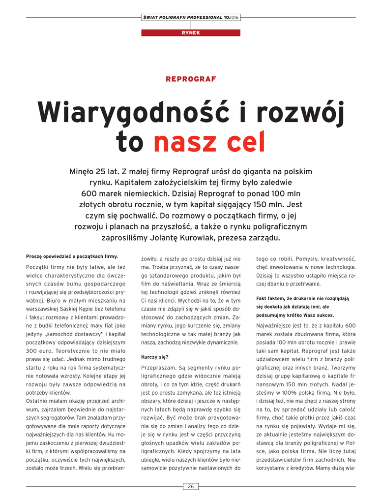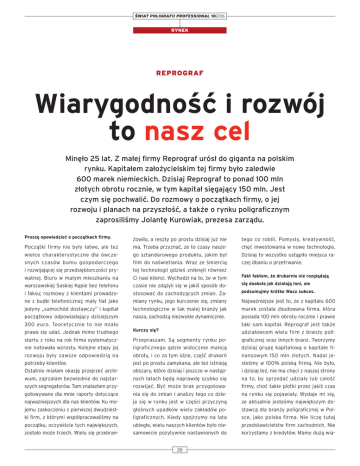 ŚWIAT POLIGRAFII PROFESSIONAL 102016 RYNEK REPROGRAF Wiarygodność i rozwój to nasz cel Minęło 25 lat. Z małej firmy Reprograf urósł do giganta na polskim rynku. Kapitałem założycielskim tej firmy było zaledwie 600 marek niemieckich. Dzisiaj Reprograf to ponad 100 mln złotych obrotu rocznie, w tym kapitał sięgający 150 mln. Jest czym się pochwalić. Do rozmowy o początkach firmy, o jej rozwoju i planach na przyszłość, a także o rynku poligraficznym zaprosiliśmy Jolantę Kurowiak, prezesa zarządu. Proszę opowiedzieć o początkach firmy. żowiło, a reszty po prostu dzisiaj już nie tego co robili. Pomysły, kreatywność, Początki firmy nie były łatwe, ale też ma. Trzeba przyznać, ze to czasy nasze- chęć inwestowania w nowe technologie. wielce charakterystyczne dla ówcze- go sztandarowego produktu, jakim był Dzisiaj to wszystko ustąpiło miejsca ra- snych czasów bumu gospodarczego film do naświetlania. Wraz ze śmiercią czej dbaniu o przetrwanie. i rozwijającej się przedsiębiorczości pry- tej technologii gdzieś zniknęli również watnej. Biuro w małym mieszkaniu na Ci nasi klienci. Wychodzi na to, że w tym Fakt faktem, że drukarnie nie rozglądają warszawskiej Saskiej Kępie bez telefonu czasie nie zdążyli się w jakiś sposób do- się dookoła jak działają inni, ale i faksu; rozmowy z klientami prowadzo- stosować do zachodzących zmian. Za- podsumujmy krótko Wasz sukces. ne z budki telefonicznej; mały fiat jako miany rynku, jego kurczenie się, zmiany Najważniejsze jest to, że z kapitału 600 jedyny „samochód dostawczy” i kapitał technologiczne w tak małej branży jak marek została zbudowana firma, która początkowy odpowiadający dzisiejszym nasza, zachodzą niezwykle dynamicznie. posiada 100 mln obrotu rocznie i prawie taki sam kapitał. Reprograf jest także 300 euro. Teoretycznie to nie miało prawa się udać. Jednak mimo trudnego Kurczy się? udziałowcem wielu firm z branży poli- startu z roku na rok firma systematycz- Przepraszam. Są segmenty rynku po- graficznej oraz innych branż. Tworzymy nie notowała wzrosty. Kolejne etapy jej ligraficznego gdzie widocznie maleją dzisiaj grupę kapitałową o kapitale fi- rozwoju były zawsze odpowiedzią na obroty, i co za tym idzie, część drukarń nansowym 150 mln złotych. Nadal je- potrzeby klientów. jest po prostu zamykana, ale też istnieją steśmy w 100% polską firmą. Nie było, Ostatnio miałam okazję przejrzeć archi- obszary, które dzisiaj i jeszcze w następ- i dzisiaj też, nie ma chęci z naszej strony wum, zajrzałam bezwiednie do najstar- nych latach będą naprawdę szybko się na to, by sprzedać udziały lub całość szych segregatorów. Tam znalazłam przy- rozwijać. Być może brak przygotowa- firmy, choć takie plotki przez jakiś czas gotowywane dla mnie raporty dotyczące nia się do zmian i analizy tego co dzie- na rynku się pojawiały. Wydaje mi się, najważniejszych dla nas klientów. Ku mo- je się w rynku jest w części przyczyną ze aktualnie jesteśmy największym do- jemu zaskoczeniu z pierwszej dwudziest- głośnych upadków wielu zakładów po- stawcą dla branży poligraficznej w Pol- ki firm, z którymi współpracowaliśmy na ligraficznych. Kiedy spojrzymy na lata sce, jako polska firma. Nie liczę tutaj początku, oczywiście tych największych, ubiegłe, wielu naszych klientów było nie- przedstawicielstw firm zachodnich. Nie zostało może trzech. Wielu się przebran- samowicie pozytywnie nastawionych do korzystamy z kredytów. Mamy dużą wia- 26 rygodność finansową. Stabilność ta pozwala na współpracę z wieloma różnego rodzaju dostawcami. Oprócz tego trzeba pamiętać, że w ślad za tym idzie również bardzo pozytywna o nas samych opinia na rynku. Dobra opinia dzisiaj jest naprawdę w cenie. Gdzie dzisiaj jest Reprograf organizacyjnie? Przede wszystkim duże zmiany zaszły w ostatnich latach. To nie tylko sprowadzenie całości naszej oferty do jednego magazynu. To przede wszystkim wdrożenie wielu procedur, bez czego byłoby nam bardzo trudno aktualnie zabiegać o klientów. Zmieniliśmy w dużej mierze metody zarządzania, nie tylko tego bezpośredniego, ale zarządzania firmą na każdym etapie jej działania. Pojawiły się nowe osoby w składzie zarządu firmy. Czterej nowi handlowcy i chyba, to co najważniejsze, pojawiły się w naszej ofercie nowe gamy produktów. Rozwój osobowy jest zawsze skorelowany z rozwojem samej firmy. I przyznam, że dzisiaj jest to jeden z najtrudniejszych tematów, ponieważ ewidentnie brak jest fachowców i ekspertów w poszczególnych dziedzinach poligrafii. 500+? Po części to chyba rzeczywiście tak zadziałało. Program naprawdę potrzebny, ale jego efekt jest nieco inny, jak tylko dokładnie rozejrzymy się po rynku. Nawet my słyszymy od wielu drukarń, że posiadają vacaty na konkretne stanowiska, a pracowników po prostu brak. A my zauważyliśmy to po naszej ofercie urządzeń z obszaru introligatorni. Jest wśród nich wiele takich, które są już wysoce zautomatyzowane. I dość długo nie cieszyły się dużym zainteresowaniem. Teraz wręcz przeciwnie. Problemy kadrowe są eliminowane poprzez wprowadzanie do linii produkcyjnych bardziej zautomatyzowanych zestawów. Takie urządzenie nie pójdzie na urlop, nie będzie narzekać, nie zrezygnuje z pracy przez 500+, itd. » ŚWIAT POLIGRAFII PROFESSIONAL 102016 » Logistyka w Reprografie. sze zarządzanie również naszymi stana- strony pozwala nie tylko kompleksowo mi magazynowymi. podchodzić do potrzeb naszych klientów, Niezwykle dla nas ważne zadanie. ale także być bardziej elastycznym przy Przede wszystkim posiadamy jeden Reprograf dzisiaj to… zachodzących zmianach w całości rynku główny magazyn, który został przygoto- Oprogramowanie, cały prepress, druk tra- poligraficznego. Wszak nowe technologie wany do obsługi kilkudziesięciu tysięcy dycyjny i cyfrowy, introligatornia, flekso, poja