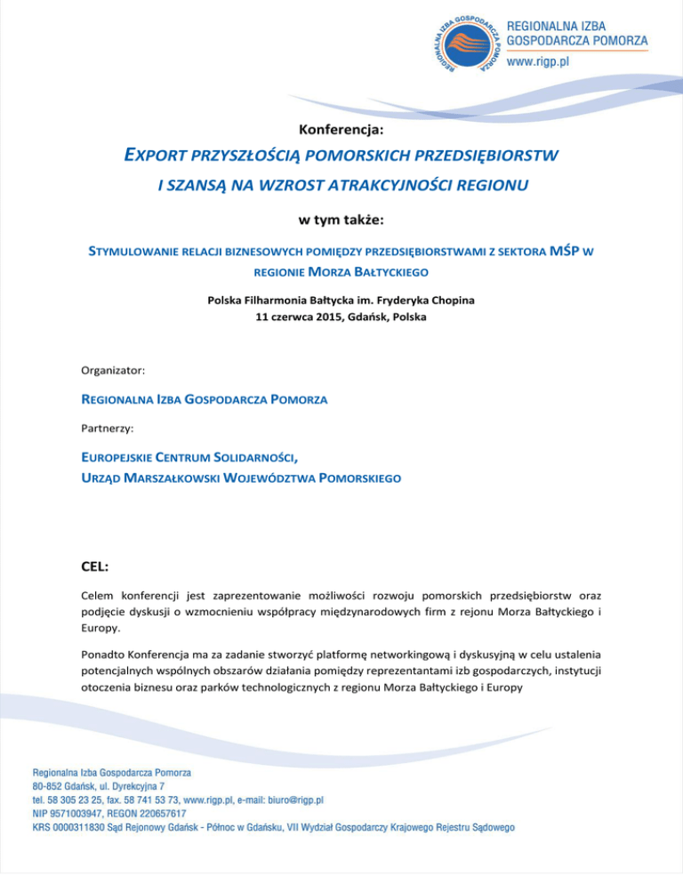 Konferencja: EXPORT PRZYSZŁOŚCIĄ POMORSKICH PRZEDSIĘBIORSTW I SZANSĄ NA WZROST ATRAKCYJNOŚCI REGIONU w tym także: STYMULOWANIE RELACJI BIZNESOWYCH POMIĘDZY PRZEDSIĘBIORSTWAMI Z SEKTORA MŚP W REGIONIE MORZA BAŁTYCKIEGO Polska Filharmonia Bałtycka im. Fryderyka Chopina 11 czerwca 2015, Gdańsk, Polska Organizator: REGIONALNA IZBA GOSPODARCZA POMORZA Partnerzy: EUROPEJSKIE CENTRUM SOLIDARNOŚCI, URZĄD MARSZAŁKOWSKI WOJEWÓDZTWA POMORSKIEGO CEL: Celem konferencji jest zaprezentowanie możliwości rozwoju pomorskich przedsiębiorstw oraz podjęcie dyskusji o wzmocnieniu współpracy międzynarodowych firm z rejonu Morza Bałtyckiego i Europy. Ponadto Konferencja ma za zadanie stworzyć platformę networkingową i dyskusyjną w celu ustalenia potencjalnych wspólnych obszarów działania pomiędzy reprezentantami izb gospodarczych, instytucji otoczenia biznesu oraz parków technologicznych z regionu Morza Bałtyckiego i Europy AGENDA: 9:00 – 9:20 SESJA OTWIERAJĄCA Wprowadzenie przez moderatora, Bogdana Ołdakowskiego, Członka Zarządu Regionalnej Izby Gospodarczej Pomorza Powitanie: Mieczysław Struk, Marszałek Województwa Pomorskiego Sławomir Halbryt, Prezes Zarządu Regionalnej Izby Gospodarczej Pomorza 9:20 SESJA: HANDEL W REGIONIE MORZA BAŁTYCKIEGO 9:20-9:40 Handel zagraniczny pomiędzy krajami bałtyckimi – fakty i liczby, dr Maciej Matczak, Szef Działu Actia Consulting, Actia Forum, Akademia Morska w Gdyni; 9:40-10:00 Eksportowanie dóbr i usług z Pomorza – fakty i liczby, Prelegent zostanie ogłoszony wkrótce 10:00-10:20 Atrakcyjność Pomorza – główne zalety oraz inwestorzy Marcin Piątkowski. Dyrektor Centrum Obsługi Inwestora, Invest in Pomerania, Agencja Rozwoju Pomorza 10:20-10:30 Pytania i odpowiedzi 10:30 – 11:00 Przerwa kawowa 11.00 – 12:30 3 RÓWNOLEGŁE SESJE PANELOWE: PANEL 1: Budowanie relacji partnerskich pomiędzy organizacjami otoczenia biznesu Moderator: Bogdan Ołdakowski, Członek Zarządu Regionalnej Izby Gospodarczej Pomorza CASE STUDY: Jak izby gospodarcze pomagają swoim członkom w promocji zagranicą? Prelegent zostanie ogłoszony wkrótce PANELISTS: Peter Westher, Area Manager, Izba Przemysłowo-Handlowa Południowej Szwecji zaproszony Toomas Kuuda, Szef Biura w Pärnu, Estońska Izba Gospodarczo-Przemysłowa Prelegent zostanie ogłoszony wkrótce PANEL 2: Budowanie marki eksportowej i jej przynależności do kraju lub regionu Moderator: Joanna Engländer-Brzozowska, Ekspert Regionalnej Izby Gospodarczej Pomorza CASE STUDY: Międzynarodowa promocja usług logistycznych w Estonii Illimar Paul, Kierownik Rozwoju, Estoński Klaster Logistyczny PANELIŚCI: Jens Klarskov, Dyrektor Zarządzający, Duńska Izba Gospodarcza – zaproszony Reprezentant Izby Gospodarczej w Rostocku – zaproszony Reprezentant Izby Gospodarczej z Bergen – zaproszony PANEL 3: Promocja regionu jako efekt współpracy organizacji otoczenia biznesu, przedsiębiorstw i władz regionu – PANEL PROWADZONY W JĘZYKU POLSKIM CASE STUDY: Promocja biznesu i regionu jednocześnie Prelegent zostanie ogłoszony wkrótce PANELIŚCI: Polscy paneliści do ustalenia Oleg Matukievich, Prezes Fundacji Wiedzy i Technologii dla MŚP “Viktoria” 12:45 – 13:00 Przerwa 13:00 – 13:45 Podsumowanie paneli i konferencji przez moderatorów 13:45 – 15:00 Lunch networkingowy 15:00 Wizyta w Europejskim Centrum Solidarności (ECS): Nowa siedziba ECS jestagorą, gdzie przestrzeń znajdują ludzie i idee służące budowaniu i rozwojowi społeczeństwa obywatelskiego, miejscem spotkań tych, którym droga jest przyszłość świata. ECS to kontynuacja przedsięwzięcia adresowanego do różnych środowisk z Polski, Europy i świata: konferencje, debaty, projekty dla dzieci i młodzieży, spektakle teatralne, pokazy filmowe (także w 3D) i wystawy czasowe. 17 pomieszczeń w budynku ECS zajmują organizacje pozarządowe, które działają na rzecz dobra wspólnego, wolności i praw człowieka. Przez cały rok czynny jest ogród zimowy, stworzony do aktywności artystycznych, spotkań i wypoczynku, a od wiosny do jesieni taras widokowy na dachu, skąd roztacza się piękna panorama terenów postoczniowych, a także Starego i Głównego Miasta.