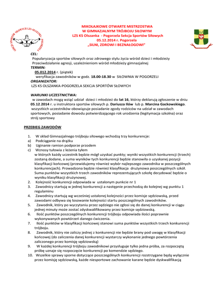 MIKOŁAJKOWE OTWARTE MISTRZOSTWA W GIMNAZJALNYM TRÓJBOJU SIŁOWYM LZS KS Olszanka - Pogorzela Sekcja Sportów Siłowych 05.12.2014 r. Pogorzela „SILNI, ZDROWI I BEZNAŁOGOWI” CEL: Popularyzacja sportów siłowych oraz zdrowego stylu życia wśród dzieci i młodzieży Przeciwdziałanie agresji, uzależnieniom wśród młodzieży gimnazjalnej TERMIN: 05.012.2014 r. (piątek) weryfikacja zawodników w godz. 18.00-18.30 w SIŁOWNIA W POGORZELI ORGANIZATOR: LZS KS OLSZANKA-POGORZELA SEKCJA SPORTÓW SŁOWYCH WARUNKI UCZESTNICTWA: w zawodach mogą wziąć udział dzieci i młodzież do lat 16, którzy deklarują zgłoszenie w dniu 05.12.2014 r. u instruktora sportów siłowych p. Dariusza Ilów lub p. Marcina Gackowskiego. wszystkich uczestników obowiązuje posiadanie zgody rodziców na udział w zawodach sportowych, posiadanie dowodu potwierdzającego rok urodzenia (legitymacja szkolna) oraz strój sportowy PRZEBIEG ZAWODÓW 1. a) b) c) 2. 3. 4. 5. 6. 7. 8. 9. 10. W skład Gimnazjalnego trójboju siłowego wchodzą trzy konkurencje: Podciąganie na drążku Uginanie ramion podporze przodem Wznosy tułowia z leżenia tyłem w których każdy uczestnik będzie mógł uzyskać punkty; wyniki wszystkich konkurencji (trzech) zostaną dodane, a suma wyników tych konkurencji będzie stanowiła o uzyskanej pozycji klasyfikacji końcowej (przewidujemy również wybór najlepszego zawodnika w poszczególnych konkurencjach). Prowadzona będzie również klasyfikacja drużynowa poszczególnych szkół. Suma punktów wszystkich trzech zawodników reprezentujących szkołę decydować będzie o wyniku klasyfikacji drużynowej. Kolejność konkurencji odpowiada w ustalonym punkcie nr 1 Zawodnicy startują w jednej konkurencji a następnie przechodzą do kolejnej wg punktu 1 regulaminu Zawodnicy startują wg wcześniej ustalonej kolejności przez komisje sędziowską, przed zawodami odbywa się losowanie kolejności startu poszczególnych zawodników. Zawodnik, który po wyczytaniu przez sędziego nie zgłosi się do danej konkurencji w ciągu jednej minuty może zostać zdyskwalifikowany przez komisje sędziowską. Ilość punktów poszczególnych konkurencji trójboju odpowiada ilości poprawnie wykonywanych powtórzeń danego ćwiczenia. Ilość punktów w klasyfikacji końcowej stanowi suma punktów wszystkich trzech konkurencji trójboju. Zawodnik, który nie zaliczy jednej z konkurencji nie będzie brany pod uwagę w klasyfikacji końcowej (do zaliczenia danej konkurencji wystarczy wykonanie jednego powtórzenia zaliczonego przez komisję sędziowską) W każdej konkurencji trójboju zawodnikowi przysługuje tylko jedna próba, za rozpoczętą próbę uznaje się rozpoczęcie konkurencji po komendzie sędziego. Wszelkie sprawy sporne dotyczące poszczególnych konkurencji rozstrzygane będą wyłącznie przez komisję sędziowską, każde niesportowe zachowanie karane będzie dyskwalifikacją 11. W przypadku uzyskania przez dwóch lub więcej zawodników jednakowej ilości punktów o rozstrzygnięciu zadecyduje przeprowadzenie dodatkowej konkurencji w postaci skoku w dal z miejsca. Przy braku rozstrzygnięcia dogrywki komisja sędziowska może zarządzić dodatkową kolejkę skoków. NAGRODY: Wszyscy zawodnicy otrzymują pamiątkowe certyfikaty, a zawodnicy od miejsca I do III dyplomy oraz nagrody rzeczowe. OPIS KONKURENCJI GIMNAZJALNEGO TRÓJBOJU SIŁOWEGO: I. Podciąganie na drążku ze zwisu Drążek założony do skocznie, zawodnik chwyta drążek podchwytem na szerokość barków i wykonuje zwis z pełnym wyprostem w łokciach. Na sygnał sędziego podciąga ciało tak wysoko, aby broda znalazła się nad drążkiem po czym powraca do zwisu z pełnym wyprostem w łokciach. Czynność tę powtarza się bez przerwy, tyle powtórzeń ile potrafi. Próba jest zakończona wtedy, kiedy zawodnik pozostając w zwisie dłużej niż 2 sekundy, pomimo dwukrotnych wysiłków nie może unieść brody ponad drążek lub w czasie próby dotyka konstrukcji drążka (wsporniki lub drabinka). W przypadku nie pełnego wyprostu ramion w łokciach ruchy nie będą zaliczane przez komisję sędziowską. Dotknięcia wsporników drążka lub drabinek nie będą również zaliczone przez komisję sędziowską. II. Uginanie i wyprosty ramion w podporze przodem Zawodnik ustawia dłonie na szerokość barków (lub pomiędzy dwoma wyznaczonymi liniami, które stanowią szerokość maksymalną), tułów wyprostowany. Stopy rozstawione maksymalnie na szerokość bioder. Niedozwolone jest unoszenie pośladków w górę (nie załamywać się w biodrach). Zawodnik ugina ramiona i dotyka klatką punktu kontrolnego umieszczonego na podłożu, a następnie prostuje ramiona do pełnego wyprostu. Czynność tę powtarza bez przerwy tyle powtórzeń ile może. Próba jest zakończona wtedy, kiedy zawodnik pozostaje w pozycji początkowej dłużej niż 2 sekundy lub mimo dwukrotnych wysiłków nie może wykonać pełnego ruchu ćwiczenia lub w czasie próby przyjmuje nie prawidłową pozycję tułowia. III. Wznosy tułowia z leżenia tyłem Zawodnik wykonuje leżenie na plecach na twardym materacu w ten sposób, aby nogi były ugięte w stawach kolanowych pod kątem 90 stopni, a stopy rozstawione na odległość około 30 cm. Ręce splecione z tyłu za głową. Sędzia klęka między rozstawionymi stopami zawodnika i przyciska je , aby dotykały całą podeszwą do maty, na sygnał zawodnik przechodzi do siadu i dotyka łokciami kolan (uda), a następnie powraca do leżenia na plecach i znów wykonuje siad. Czynność tę powtarza tak szybko, jak może, w czasie 30 sekund. Plecy za każdym razem muszą powrócić do pozycji wyjściowej, tak aby umożliwić splecionym dłoniom kontakt z podłożem. Używanie łokci do odpychania się od materaca jest zabronione. ORGANIZATOR: . Dariusz Ilów ,Marcin Gackowski