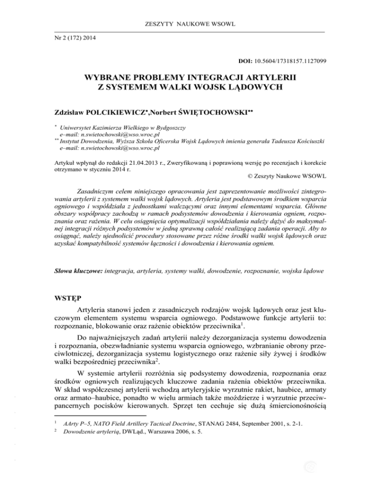 ZESZYTY NAUKOWE WSOWL Nr 2 (172) 2014 ISSN 1731-8157 DOI: 10.5604/17318157.1127099 WYBRANE PROBLEMY INTEGRACJI ARTYLERII Z SYSTEMEM WALKI WOJSK LĄDOWYCH Zdzisław POLCIKIEWICZ,Norbert ŚWIĘTOCHOWSKI * Uniwersytet Kazimierza Wielkiego w Bydgoszczy e–mail: [email protected] ** Instytut Dowodzenia, Wyższa Szkoła Oficerska Wojsk Lądowych imienia generała Tadeusza Kościuszki e–mail: [email protected] Artykuł wpłynął do redakcji 21.04.2013 r., Zweryfikowaną i poprawioną wersję po recenzjach i korekcie otrzymano w styczniu 2014 r. © Zeszyty Naukowe WSOWL Zasadniczym celem niniejszego opracowania jest zaprezentowanie możliwości zintegrowania artylerii z systemem walki wojsk lądowych. Artyleria jest podstawowym środkiem wsparcia ogniowego i współdziała z jednostkami walczącymi oraz innymi elementami wsparcia. Główne obszary współpracy zachodzą w ramach podsystemów dowodzenia i kierowania ogniem, rozpoznania oraz rażenia. W celu osiągnięcia optymalizacji współdziałania należy dążyć do maksymalnej integracji różnych podsystemów w jedną sprawną całość realizującą zadania operacji. Aby to osiągnąć, należy ujednolicić procedury stosowane przez różne środki walki wojsk lądowych oraz uzyskać kompatybilność systemów łączności i dowodzenia i kierowania ogniem. Słowa kluczowe: integracja, artyleria, systemy walki, dowodzenie, rozpoznanie, wojska lądowe WSTĘP Artyleria stanowi jeden z zasadniczych rodzajów wojsk lądowych oraz jest kluczowym elementem systemu wsparcia ogniowego. Podstawowe funkcje artylerii to: rozpoznanie, blokowanie oraz rażenie obiektów przeciwnika1. W systemie artylerii rozróżnia się podsystemy dowodzenia, rozpoznania oraz środków ogniowych realizujących kluczowe zadania rażenia obiektów przeciwnika. W skład współczesnej artylerii wchodzą artyleryjskie wyrzutnie rakiet, haubice, armaty oraz armato–haubice, ponadto w wielu armiach także moździerze i wyrzutnie przeciwpancernych pocisków kierowanych. Sprzęt ten cechuje się dużą śmiercionośnością - - Do najważniejszych zadań artylerii należy dezorganizacja systemu dowodzenia i rozpoznania, obezwładnianie systemu wsparcia ogniowego, wzbranianie obrony przeciwlotniczej, dezorganizacja systemu logistycznego oraz rażenie siły żywej i środków walki bezpośredniej przeciwnika2. - - - 1 2 AArty P–5, NATO Field Artillery Tactical Doctrine, STANAG 2484, September 2001, s. 2-1. Dowodzenie artylerią, DWLąd., Warszawa 2006, s. 5. Zdzisław POLCIKIEWICZ, Norbert ŚWIĘTOCHOWSKI i zasięgiem ognia, precyzją oraz szybkostrzelnością. Artyleria dzięki swym właściwościom jest zdolna do rażenia przeciwnika znajdującego się głęboko w ugrupowaniu bojowym, którego zwalczanie za pomocą innych środków walki jest często niemożliwe. Jednak o skuteczności artylerii przede wszystkim decyduje jej skoordynowanie oraz zintegrowanie z innymi środkami walki wojsk lądowych, a zwłaszcza ze wspieranymi jednostkami, ponieważ z założenia jej ogień powinien być celowy i ukierunkowany na osiągnięcie zakładanych skutków. Stąd jednym z podstawowych problemów rozwojowych współczesnej artylerii jest zapewnienie jej możliwości szerokiego współdziałania z wojskami w zakresie dowodzenia, rozpoznania, realizacji uderzeń ogniowych oraz wsparcia logistycznego. Celem niniejszego opracowania jest wskazanie możliwości integracji podsystemów wojsk rakietowych i artylerii (WRiA) z systemem walki wojsk lądowych, mających kluczowe znaczenie dla zwiększenia zdolności bojowej artylerii i możliwości realizacji zadań wsparcia ogniowego. 1. ZASADNICZE OBSZARY INTEGRACJI SYSTEMÓW Rys. 1. Zasadnicze obszary integracji artylerii z systemami wojsk lądowych Źródło: opracowanie własne W zakresie sprzętu najważniejsze wydaje się utworzenie interoperacyjnego systemu dowodzenia, pozwalającego przyłączyć jednostki artylerii do wspólnej sieci łącz- - - - - Artyleria, jako wspierający rodzaj wojsk, współdziała z jednostkami walczącymi oraz innymi elementami wsparcia. Główne obszary współpracy zachodzą w ramach podsystemów dowodzenia i kierowania ogniem, rozpoznania oraz rażenia. Chodzi tu z jednej strony o możliwość uzyskania interoperacyjności w zakresie sprzętu i techniki bojowej, z drugiej zaś o określenie wspólnej doktryny i procedur operacyjnych rysunek 1. - 81 WYBRANE PROBLEMY INTEGRACJI ARTYLERII Z SYSTEMEM WALKI WOJSK LĄDOWYCH ności cyfrowej, która pozwoli na wymianę danych i informacji w czasie rzeczywistym, przekazywanie komend i poleceń oraz sprawną realizację zadań ogniowych. Do tego potrzebne będą przede wszystkim odpowiednie środki łączności oraz skomputeryzowany system dowodzenia i kierowania ogniem, który obejmie wszystkie procedury artyleryjskie w zakresie sposobów realizacji zadań taktycznych i ogniowych oraz będzie kompatybilny z nadrzędnym systemem dowodzenia wojsk lądowych. Kolejny problem stanowi integracja systemów rozpoznania artyleryjskiego oraz innych źródeł informacji, które mogą być wykorzystane do realizacji zadań taktycznych i ogniowych. Utworzenie zintegrowanego systemu rozpoznania, z którego artyleria będzie w stanie pobierać w czasie rzeczywistym informacje o przeciwniku, usprawni proces selekcji i rażenia celów. W obszarze wspólnych procedur do najważniejszych zagadnień należy koordynacja wsparcia ogniowego na wszystkich szczeblach dowodzenia oraz wdrażanie i doskonalenie procedury wezwania ognia artylerii z pola walki (CFF). Nie mniej ważne będą wzajemne relacje pomiędzy artylerią a wojskami inżynieryjnymi ze względu na realizowanie wspólnych zadań, do których należą: wykonywanie narzutowych pól minowych, osłona ogniem rejonu przeprawy oraz organizacja i wykorzystanie oddziałów zaporowych. 2. PODSYSTEM DOWODZENIA I KIEROWANIA OGNIEM ARTYLERII JAKO KOMPONENT SYSTEMU DOWODZENIA WOJSK LĄDOWYCH System dowodzenia i kierowania ogniem 