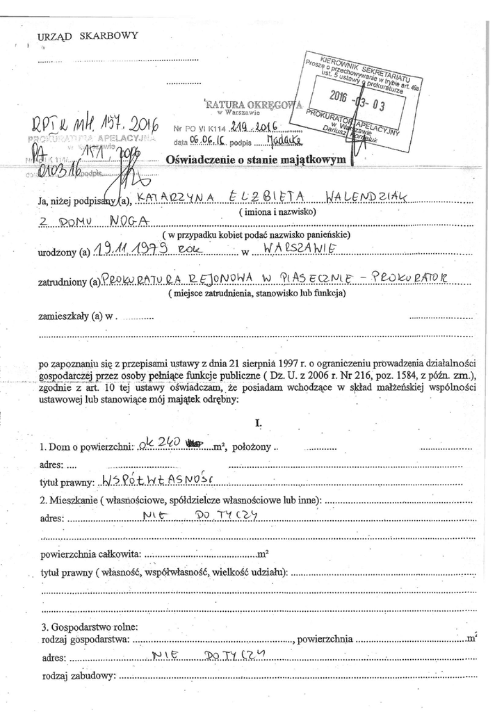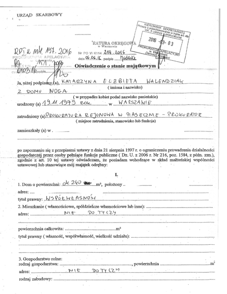 URZĄD SKARBOWY i "RATURA OKRĘGO mim r A i mM . w Warszawie Warszawie w Nf PO VI K114 .MH...<.W±?. a' Oświadczenie o stanie majątkowym Ł^MifeM Ja,niżejpodpis4ia) ^^..^.^.^^A 5 &....£&tig fc/..Q.Q:.& , ^.M^MiC (imiona i nazwisko) : , ( w przypadku kobiet podać nazwisko panieńskie) urodzony (a) d%MJMS....M^. i m M w £ f f i > W K bML§SSAM£ w A , . w , . „ ftte.go^ir - $to\ćo£$o£_. ( miejsce zatrudnienia, stanowisko lub ninkcja) zamieszkały (a) w . po zapoznaniu się z przepisami ustawy z dnia 21 sierpnia 1997 r. o ograniczeniu prowadzenia działalności gospodarczej przez osoby pełniące funkcje publiczne ( Dż. U. z 2006 r. N r 216, poz. 1584, z późn. zm.), zgodnie z art. 10 tej ustawy oświadczam, że posiadam wchodzące w skład małżeńskiej wspólności ustawowej lub stanowiące mój majątek odrębny: I. 1. Dom o powierzchni: .Q^..^^P..^^'.....m , 2 adres: .,. położony.. ............... tytuł prawny: JoISSŚlt.HL M^k...... : 2. Mieszkanie ( własnościowe, spółdzielcze własnościowe lub inne): adres: N.Lt. ,.,.$2.,iX.C.^7. powierzchnia całkowita: m '. , .......................................................... 2 tytuł prawny ( własność, współwłasność, wielkość udziału): 3. Gospodarstwo rolne: rodzaj gospodarstwa: adres: rodzaj zabudowy: ' ....m' ,powierzchnia Jt£i£ $9..J1±W. : , tytuł prawny ( własność, współwłasność, użytkowanie wieczyste, dzierżawa, inny tytuł, podać jaki): Z tego tytułu osiągnąłem ( ęłam) w roku ubiegłym przychód i dochód w wysokości: 4. Inne nieruchomości ( place, działki): powierzchnia: m M.fe 2 $.SX.X^.£<Zh. (adres, tytuł prawny: własność, współwłasność, inny tytuł - podać jaki oraz inne dane) 5. Zasoby pieniężne: - środki pieniężne zgromadzone w walucie polski&y.....Q}^:...'i.^...P..Q.C..^Ó^.. §.p.T^..9.3£?.. - środki pieniężne zgromadzone w walucie obcej:., papiery wartościowe: .C^AiT £$L33u2£3l na kwotę: u. Nabyłem(am) ( nabył mój małżonek) mienie od Skarbu Państwa, innej państwowej osoby prawnej, jednostek samorządu terytorialnego, ich związków lub od komunalnej osoby prawnej, które podlegało zbyciu w drodze przetargu: tak* ^rńfP) Podać rodzaj mienia, datę nabycia, od kogo .- , III. (a*JNie jestem członkiem zarządu ani rady nadzorczej, komisji rewizyjnej spółki prawa handlowego, ani też członkiem zarządu fundacji prowadzącej działalność gospodarczą, b* Jestem członkiem zarządu, rady nadzorczej lub komisji rewizyjnej spółki prawa handlowego, członkiem zarządu fundacji prowadzącej działalność gospodarczą. (wymienić pełnione funkcje i stanowiska wraz z nazwami spółek i fundacji) Z tego tytułu osiągnąłem (ęłam) w roku ubiegłym dochód w wysokości: ^.y Nie jestem zatrudniony (a) ani też nie wykonuję innych zajęć w spółkach prawa które mogłyby wywołać podejrzenie o moją stronniczość lub interesowność, b* W spółkach prawa handlowego wykonuję niżej wymienione zajęcia: handlowego : Z tego tytułu osiągnąłem (ęłam) w roku ubiegłym dochód w wysokości: 3 ( ^ N i e jestem członie b* Jestem członkiem zarządu, rady nadzorczej lub komisji rewizyjnej spółdzielni; ( podać pełnioną funkcję, nazwę i adres spółdzielni) Z tego tytułu osiągnąłem ( ęłam) w roku ubiegłym dochód w wysokości: 4 W następujących akcje: spółkach prawa handlowego posiadam niżej fc>A.£ podane udziały lub ... ( nazwa spółki - adresy, wielkość udziałów, ilość akcji) Z tego tytułu osiągnąłem (ęłam) w roku ubiegłym dochód w wysokości: Równocześnie oświadczam, że w spółce moje udziały ( l u b akcje) przekraczają 10%. W pozostałych spółkach prawa handlowego posiadane udziały lub akcje nie stanowią 10% kapitału. IV. (!) Nie prowadzę działalności gospodarczej na własny rachunek ani wspólnie z innymi . osobami, nie zarządzam również taką działalnością, ani nie jestem przedstawicielem czy też pełnomocnikiem w prowadzeniu takiej działalności. 2 Prowadzę w wyżej określony sposób działalność polegającą na: 2 Z tego tytułu osiągnąłem ( ęłam) w roku ubiegłym dochód w wysokości: ' V. Składniki mienia ruchomego o wartości powyżej 10.000 złotych ( w przypadku pojazdów mechanicznych należy podać markę, model i rok produkcji): VI. Zobowiązania pieniężne o wartości powyżej 10.000 złotych, w tym zaciągnięte kredyty i pożyczki oraz warunki, na jakich zostały udzielone ( wobec kogo, w związku z jakim zdarzeniem, w jakiej wysokości): *g£!S*.T.. M , ! B , ^ ^ ~ ^ - 0 - - - ^ ^ T > - ók^tOOO.^f : Ut M. z o o o... z. è VII. Inne dodatkowe dane o stanie majątkowym „...Nie $OìjC7/i Z tego tytułu osiągnąłem (ęłam) w roku ubiegłym dochód w wysokości: Powyższe oświadczenie składam świadomy(a), iż na podstawie art. 14 ust 1 ustawy z dnia 21 sierpnia 1997 r. o ograniczeniu prowadzenia działalności gospodarczej przez osoby pełniące funkcje publiczne (Dz. U. z 2006 r. Nr 216,poz. 1584,z późn. zm.) za podanie nieprawdy grozi kara pozbawienia wolności. (miej scowość, data) ^(podpis) f //•. , ti ĄióA ÏOWY 1. Nie dotyczy rad nadzorczych spółdzielni m ieszkaniowych. 2. Nie dotyczy działalności wytwórczej w rolnictwie. Paweł * Niewłaściwe skreślić i uzupełnić, wpisując w,poszczególnych punktach odpowiednie dane. WHkoszewskl