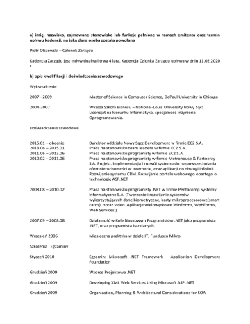 a) imię, nazwisko, zajmowane stanowisko lub funkcje pełnione w ramach emitenta oraz termin upływu kadencji, na jaką dana osoba została powołana Piotr Olszewski – Członek Zarządu Kadencja Zarządu jest indywidualna i trwa 4 lata. Kadencja Członka Zarządu upływa w dniu 11.02.2020 r. b) opis kwalifikacji i doświadczenia zawodowego Wykształcenie 2007 - 2009 Master of Science in Computer Science, DePaul University in Chicago 2004-2007 Wyższa Szkoła Biznesu – National-Louis University Nowy Sącz Licencjat na kierunku Informatyka, specjalność Inżynieria Oprogramowania. Doświadczenie zawodowe 2015.01 – obecnie 2013.06 – 2015.01 2011.06 – 2013.06 2010.02 – 2011.06 Dyrektor oddziału Nowy Sącz Development w firmie EC2 S.A. Praca na stanowisku team leadera w firmie EC2 S.A. Praca na stanowisku programisty w firmie EC2 S.A. Praca na stanowisku programisty w firmie Metrohouse & Partnerzy S.A. Projekt, implementacja i rozwój systemu do rozpowszechniania ofert nieruchomości w Internecie, oraz aplikacji do obsługi infolinii. Rozwijanie systemu CRM. Rozwijanie portalu webowego opartego o technologię ASP.NET 2008.08 – 2010.02 Praca na stanowisku programisty .NET w firmie Pentacomp Systemy Informatyczne S.A. (Tworzenie i rozwijanie systemów wykorzystujących dane biometryczne, karty mikroprocesorowe(smart cards), obraz video. Aplikacje wielowątkowe WinForms, WebForms, Web Services.) 2007.09 – 2008.08 Działalność w Kole Naukowym Programistów .NET jako programista .NET, oraz programista baz danych. Wrzesień 2006 Miesięczna praktyka w dziale IT, Funduszu Mikro. Szkolenia i Egzaminy Styczeń 2010 Egzamin: Microsoft .NET Framework - Application Development Foundation Grudzień 2009 Wzorce Projektowe .NET Grudzień 2009 Developing XML Web Services Using Microsoft ASP .NET Grudzień 2009 Organization, Planning & Architectural Considerations for SOA Listopad – Grudzień 2006 Cisco CCNA1, CCNA2, CCNA3 Umiejętności systemy operacyjne: języki programowania: bazy danych: sieci komputerowe: języki obce: Prawo jazdy kat: Windows 98/ME/NT/2000/XP (poziom administracyjny), Linux (podstawy) C#, ASP.NET MVC, T-SQL, Java, php,C++, HTML, XML,CSS,JavaScript MS SQL Server, MySQL sieci LAN Bardzo dobra znajomość języka angielskiego w mowie i piśmie A, B c) wskazanie działalności wykonywanej przez daną osobę poza emitentem, gdy działalność ta ma istotne znaczenie dla emitenta Brak. d) wskazanie wszystkich spółek prawa handlowego, w których, w okresie ostatnich trzech lat, dana osoba była członkiem organów zarządzających lub nadzorczych albo wspólnikiem, ze wskazaniem, czy dana osoba nadal pełni funkcje w organach lub jest nadal wspólnikiem 2015 – na dzień przekazania informacji - Prezes zarządu Prosum Development Sp. z o. o. 2015 – na dzień przekazania informacji - Członek rady nadzorczej Prism Consulting Sp. z o. o. e) informacje na temat prawomocnych wyroków, na mocy których dana osoba została skazana za przestępstwa oszustwa w okresie co najmniej ostatnich pięciu lat oraz wskazanie, czy w okresie co najmniej ostatnich pięciu lat osoba taka otrzymała sądowy zakaz działania jako członek organów zarządzających lub nadzorczych w spółkach prawa handlowego Brak. f) szczegóły wszystkich przypadków upadłości, zarządu komisarycznego lub likwidacji, w okresie co najmniej ostatnich pięciu lat, w odniesieniu do podmiotów, w których dana osoba pełniła funkcje członka organu zarządzającego lub nadzorczego Brak. g) informację, czy dana osoba prowadzi działalność, która jest konkurencyjna w stosunku do działalności emitenta, oraz czy jest wspólnikiem konkurencyjnej spółki cywilnej lub osobowej albo członkiem organu spółki kapitałowej lub członkiem organu jakiejkolwiek konkurencyjnej osoby prawnej Nie prowadzi działalności konkurencyjnej. h) informację, czy dana osoba figuruje w rejestrze dłużników niewypłacalnych, prowadzonym na podstawie ustawy z dnia 20 sierpnia 1997 r. o Krajowym Rejestrze Sądowym Nie figuruje.