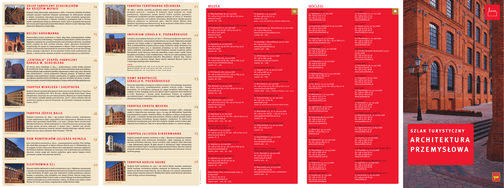 S K LE P FA B RYC Z N Y S C H E I B LE RÓ W N A K S I ¢ ˚ Y M M ¸Y N I E ul. Ksi´˝y M∏yn Budynek sklepu fabrycznego, wybudowany w 1882 r. Pracownicy zak∏adów Scheiblera posiadali specjalne ksià˝eczki sklepowe uprawniajàce do dokonywania zakupów w sklepie, nazywanym zwyczajowo konsumami. Oprócz produktów spo˝ywczych, w wi´kszoÊci pochodzàcych z folwarku Scheiblera, sprzedawane by∏y tu firmowe resztki i wybrakowane towary po obni˝onych cenach. Zysk ze sprzeda˝y przeznaczony by∏ na kas´ zapomogowà dla pracowników fabryki. Obecnie w cz´Êci dawnego sklepu dzia∏a Dom Wydawniczy Ksi´˝y M∏yn. B E C Z K I G RO H M A N N A ul. Targowa 46 ul. Rewolucji 1905 r. 52 IMPE RIUM IZRAELA K. POZNA¡SKIEGO 16 Kompleks przemys∏owy tworzony od 1872 r. Pierwszym budynkiem by∏a tkalnia z szedowym dachem, zastosowanym tutaj pierwszy raz w ¸odzi. Najbardziej okaza∏ym gmachem jest stojàca wzd∏u˝ ul. Ogrodowej prz´dzalnia, powsta∏a w latach 18761878, prawdopodobnie projektu Juliusza Junga. Symbolem ca∏ego kompleksu jest monumentalna brama przy ul. Ogrodowej prowadzàca na teren dawnej fabryki. Oprócz budynków przemys∏owych w sk∏ad kompleksu wchodzi rezydencja rodziny Poznaƒskich, kantor fabryczny, domy dla robotników, a tak˝e szko∏a i szpital. Dawny kompleks przemys∏owy zosta∏ zrewitalizowany i obecnie jest wykorzystywany przez centrum handlowo-rozrywkowo-kulturalne Manufaktura. Histori´ tego miejsca mo˝na poznaç w Muzeum Fabryki. Warto równie˝ odwiedziç Muzeum Sztuki ms2 z imponujàcà kolekcjà sztuki nowoczesnej. ul. Ogrodowa 17 D O MY RO B OT N I C Z E IZRAELA K. POZNA¡SKIEGO 17 Budynek fabryki wyrobów dzierzganych (poƒczoszniczych) Winklera i Gaertnera wzniesiony na prze∏omie XIX i XX w. W 1919 r. fabryk´ przej´li bracia Naum i Borys Eitingonowie, utrzymujàc ten sam rodzaj produkcji. Równie˝ po II wojnie Êwiatowej w tym miejscu dzia∏a∏y zak∏ady poƒczosznicze „Zenit”. Dawna fabryka obecnie zamieniona zosta∏a na centrum biznesowe. Do przesz∏oÊci nawiàzuje utrzymana nazwa „Zenit”. ul. Ogrodowa 24, 26, 28 22 ms2 Oddzia∏ Muzeum Sztuki w ¸odzi ul. Ogrodowa 19, 91-065 ¸ódê tel. +48 42 634 39 48, fax +48 42 634 39 62 www.msl.org.pl czynne: wt. - ndz. Centralne Muzeum W∏ókiennictwa ul. Piotrkowska 282, 93-034 ¸ódê tel. +48 42 683 26 84, fax. +48 42 684 33 55 www.muzeumwlokiennictwa.pl czynne: wt. - ndz. Skansen ¸ódzkiej Architektury Drewnianej ul. Piotrkowska 282, 93-034 ¸ódê tel. +48 42 683 26 84, fax. +48 42 684 33 55 www.muzeumwlokiennictwa.pl czynne: wt.- ndz. 23 Muzeum Archeologiczne i Etnograficzne Plac WolnoÊci 14, 91-415 ¸ódê tel. +48 42 632 84 40, fax +48 42 632 97 14 www.maie.art.pl czynne: wt. - ndz. Muzeum Kinematografii Plac Zwyci´stwa 1, 90-312 ¸ódê tel. +48 42 674 09 57, fax +48 42 674 90 06 www.kinomuzeum.pl czynne: wt. - ndz. 24 Fabryka sk∏ada si´ z dwóch po∏àczonych budynków: starszego z 1880 r. stojàcego wzd∏u˝ ul. Kopernika oraz nowszego z 1903 r. na rogu ulic Wólczaƒskiej i Kopernika, prawdopodobnie projektu Fryderyka Miksa. Poczàtkowo w fabryce produkowane by∏y guziki, a nast´pnie wyroby pasmanteryjne. Nowszy budynek posiada bardzo rzadko spotykanà architektur´, ∏àczàcà neogotyk i modernizm. Po zakoƒczeniu dzia∏alnoÊci produkcyjnej przez wiele lat w budynku dzia∏a∏o centrum kultury alternatywnej Forum Fabricum. Obecnie w dawnej fabryce dzia∏a m.in. centrum designu. 18 Budynek wzniesiony ok. 1892 r. wg projektu Stefana Lemené, rozbudowany o cz´Êç po∏udniowà w 1898 r. wg projektu Lwa Lubotynowicza. MieÊci∏a si´ tutaj fabryka taÊm gumowych Józefa Balle, a od 1909 r. fabryka tkanin technicznych Micha∏a Nutkiewicza. Obiekt wybudowany z charakterystycznej czerwonej ceg∏y posiada bardzo skromne dekoracje w postaci fryzu i zdobieƒ nad oknami. Wspó∏czeÊnie odnowiony budynek stanowi siedzib´ ∏ódzkiego oddzia∏u Gazety Wyborczej oraz stacji radiowych Z∏ote Przeboje i TOK FM. Muzeum Miasta ¸odzi ul. Ogrodowa 15, 91-065 ¸ódê tel. +48 42 254 90 00, tel./fax. +48 42 654 03 23 www.muzeum-lodz.pl czynne: pon. - czw., sb.- ndz. Muzeum Kana∏u „D´tka” – Oddzia∏ Muzeum Miasta ¸odzi Pl. WolnoÊci 2, 91-415 ¸ódê tel. +48 42 254 90 11, tel./fax +48 42 654 03 23 www.muzeum-lodz.pl czynne: IV - X ul. Kopernika 1/3 FA B RY K A J U L I U S Z A K I N D E R M A N N A ul. Sienkiewicza 72 D O M RO B OT N I KÓ W J U L I U S Z A H E I N Z L A Pa∏ac Herbsta - Oddzia∏ Muzeum Sztuki w ¸odzi ul. Prz´dzalniana 72, 90-338 ¸ódê tel. +48 42 674 96 98, +48 42 674 99 11, fax +48 42 674 99 82 www.msl.org.pl czynne: wt. - ndz. Domy dla robotników pracujàcych w fabryce Izraela K. Poznaƒskiego, budowane w latach 1879-1913, prawdopodobnie projektu Juliusza Junga i Dawida Rosenthala. Ich architektura nawiàzuje do ca∏ego kompleksu fabrycznego. Ze wzgl´du na brak rozleg∏ego terenu przy fabryce by∏y to najwy˝sze domy robotnicze w ¸odzi. Najstarszy z domów zosta∏ otynkowany. Kolejne, ze wzgl´dów oszcz´dnoÊciowych, nadal posiadajà elewacje z czerwonej ceg∏y. Wszystkie do dziÊ pe∏nià funkcj´ mieszkalnà. FA B RY K A E R N S TA W E V E R A ul. Sienkiewicza 82/84 FA B RY K A J Ó Z E FA B A L LE Muzeum Sztuki w ¸odzi ul. Wi´ckowskiego 36, 90-734 ¸ódê tel. +48 42 633 97 90, fax +48 42 632 99 41 www.msl.org.pl czynne: wt. - ndz. czynne: kompleks handlowy: pon.-sob. 10.00-22.00, ndz. 10.00-21.00, Muzeum Fabryki: wt.-pt. 9.00-19.00, sob.-ndz. 11.00-19.00 Muzeum Sztuki ms 2: wt. 10.00-18.00, Êr.-ndz. 12.00-20.00 Na terenie parku miejskiego w 1854 r. wydzier˝awiona zosta∏a dzia∏ka Karolowi W. Scheiblerowi. W tym miejscu rozpocz´∏a si´ niesamowita kariera tego przemys∏owca. Pierwszà fabrykà by∏a prz´dzalnia bawe∏ny, wybudowana w latach 1855-1856. NowoÊcià by∏y nieotynkowane i niemal pozbawione dekoracji elewacje. W kolejnych latach kompleks zosta∏ powi´kszony o tkalni´ i wykaƒczal
