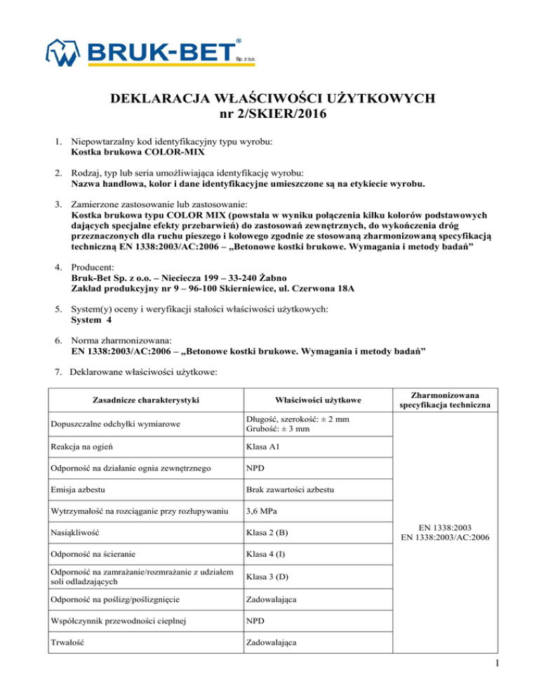 DEKLARACJA WŁAŚCIWOŚCI UŻYTKOWYCH nr 2/SKIER/2016 1. Niepowtarzalny kod identyfikacyjny typu wyrobu: Kostka brukowa COLOR-MIX 2. Rodzaj, typ lub seria umożliwiająca identyfikację wyrobu: Nazwa handlowa, kolor i dane identyfikacyjne umieszczone są na etykiecie wyrobu. 3. Zamierzone zastosowanie lub zastosowanie: Kostka brukowa typu COLOR MIX (powstała w wyniku połączenia kilku kolorów podstawowych dających specjalne efekty przebarwień) do zastosowań zewnętrznych, do wykończenia dróg przeznaczonych dla ruchu pieszego i kołowego zgodnie ze stosowaną zharmonizowaną specyfikacją techniczną EN 1338:2003/AC:2006 – „Betonowe kostki brukowe. Wymagania i metody badań” 4. Producent: Bruk-Bet Sp. z o.o. – Nieciecza 199 – 33-240 Żabno Zakład produkcyjny nr 9 – 96-100 Skierniewice, ul. Czerwona 18A 5. System(y) oceny i weryfikacji stałości właściwości użytkowych: System 4 6. Norma zharmonizowana: EN 1338:2003/AC:2006 – „Betonowe kostki brukowe. Wymagania i metody badań” 7. Deklarowane właściwości użytkowe: Właściwości użytkowe Zasadnicze charakterystyki Dopuszczalne odchyłki wymiarowe Długość, szerokość: ± 2 mm Grubość: ± 3 mm Reakcja na ogień Klasa A1 Odporność na działanie ognia zewnętrznego NPD Emisja azbestu Brak zawartości azbestu Wytrzymałość na rozciąganie przy rozłupywaniu 3,6 MPa Nasiąkliwość Klasa 2 (B) Odporność na ścieranie Klasa 4 (I) Odporność na zamrażanie/rozmrażanie z udziałem soli odladzających Klasa 3 (D) Odporność na poślizg/poślizgnięcie Zadowalająca Współczynnik przewodności cieplnej NPD Trwałość Zadowalająca Zharmonizowana specyfikacja techniczna EN 1338:2003 EN 1338:2003/AC:2006 1 Wyroby nie zawierają substancji niebezpiecznych w rozumieniu Rozporządzenia (WE) nr 1907/2006 Parlamentu Europejskiego i Rady z dnia 18 grudnia 2006r. Produkt na etapie produkcji może być wyposażony w system ochrony nawierzchni Hydrostop, Perlon Mat lub Perlon Lak poprzez dodanie środków hydrofobowych (odpowiednie oznakowanie na etykiecie). Właściwości użytkowe określonego powyżej wyrobu są zgodne z zestawem deklarowanych właściwości użytkowych. Niniejsza deklaracja właściwości użytkowych wydana została zgodnie z rozporządzeniem (UE) nr 305/2011 na wyłączną odpowiedzialność producenta określonego powyżej. W imieniu producenta podpisał(a): Łukasz Lechowicz – Technolog, Kontroler Produkcji ………………………………………………………………………………………………… (nazwisko i stanowisko) Skierniewice dn. 01.02.2016r. ……………………………………………………………………………………………………………………………. ………………………………………………. (data i miejsce wystawienia) (podpis) 2
