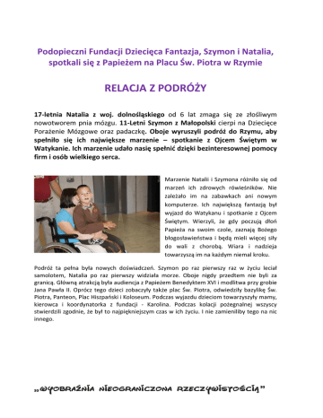 Podopieczni Fundacji Dziecięca Fantazja, Szymon i Natalia, spotkali się z Papieżem na Placu Św. Piotra w Rzymie RELACJA Z PODRÓŻY 17-letnia Natalia z woj. dolnośląskiego od 6 lat zmaga się ze złośliwym nowotworem pnia mózgu. 11-Letni Szymon z Małopolski cierpi na Dziecięce Porażenie Mózgowe oraz padaczkę. Oboje wyruszyli podróż do Rzymu, aby spełniło się ich największe marzenie – spotkanie z Ojcem Świętym w Watykanie. Ich marzenie udało nasię spełnić dzięki bezinteresownej pomocy firm i osób wielkiego serca. Marzenie Natalii i Szymona różniło się od marzeń ich zdrowych rówieśników. Nie zależało im na zabawkach ani nowym komputerze. Ich największą fantazją był wyjazd do Watykanu i spotkanie z Ojcem Świętym. Wierzyli, że gdy poczują dłoń Papieża na swoim czole, zaznają Bożego błogosławieństwa i będą mieli więcej siły do wali z chorobą. Wiara i nadzieja towarzyszą im na każdym niemal kroku. Podróż ta pełna była nowych doświadczeń. Szymon po raz pierwszy raz w życiu leciał samolotem, Natalia po raz pierwszy widziała morze. Oboje nigdy przedtem nie byli za granicą. Główną atrakcją była audiencja z Papieżem Benedyktem XVI i modlitwa przy grobie Jana Pawła II. Oprócz tego dzieci zobaczyły także plac Św. Piotra, odwiedziły bazylikę Św. Piotra, Panteon, Plac Hiszpański i Koloseum. Podczas wyjazdu dzieciom towarzyszyły mamy, kierowca i koordynatorka z fundacji - Karolina. Podczas kolacji pożegnalnej wszyscy stwierdzili zgodnie, że był to najpiękniejszym czas w ich życiu. I nie zamieniliby tego na nic innego. Dzień pierwszy – spotkanie w Warszawie i lot do Rzymu Zbiórka generalna odbyła się w poniedziałek 3 października 2011. Najpierw do Warszawy przyleciał z Krakowa Szymon. Na lotnisku czekała na nich koordynatorka z Fundacji-Karolina. Chłopiec pierwszy raz leciał samolotem - już sam spacer po lotnisku był dla niego bardzo emocjonujący, a jak wzbiliśmy się w powietrze widok chmur od razu sprawił, że nasz podopieczny był zachwycony. Wszyscy byli poruszeni uprzejmością i pomocą, jaką obdarzyli nas pracownicy linii lotniczej LOT. Kiedy lądowaliśmy w Rzymie przywitało nas słońce i bezchmurne niebo. Natalia dołączyła do nas wieczorem-trasę Wrocław-Rzym odbyła samochodem ze względu na stan zdrowia, który uniemożliwił jej lot samolotem. Dzięki uprzejmości hotelu IBIS na preferencyjnych warunkach udało nam się zatrzymać w hotelu tej samej sieci, niedaleko od centrum Rzymu. Obsługa i atmosfera w hotelu była przemiła. Po powitalnej kolacji poszliśmy spać z nadzieją, że kolejny dzień będzie słoneczny, czekało nas przecież wiele atrakcji! Dzień drugi –Bazylika Św. Piotra i Panteon Tego dnia obudziło na bezchmurne niebo i słońce. To był wspaniały początek dnia, zaraz po pysznym włoskim śniadaniu wybraliśmy się na podbój wiecznego miasta. Pierwszym punktem programu był plac świętego Piotra i zwiedzanie Bazyliki. Największym przeżyciem dla naszych podopiecznych była modlitwa przy grobie błogosławionego Jana Pawła II. Marzyciele wraz z mamami mogli przez dłuższy moment wyciszyć się w tym wyjątkowym miejscu. Następnie Natalia opowiadała nam o wszystkich godnych uwagi elementach tej świątyni. Aby schronić się przed upałem, poszliśmy na obiad i udaliśmy się do hotelu na krótki odpoczynek, który był nam potrzebny gdyż kolejnym punktem zwiedzenia był Panteon. Wieczorem udaliśmy się na spacer rzymskimi ulicami między Panteonem i fontanną di Trevi. Pomiędzy tymi zabytkami nasi marzyciele mieli okazję skosztować najlepszych lodów. To był dzień pełen pozytywnych emocji. Dzień trzeci- audiencja z Papieżem Benedyktem XVI i ogrody Watykańskie W środę wszyscy wstaliśmy wcześniej, aby przygotować się na audiencję generalną. Po dłuższym oczekiwaniu Marzyciele mieli okazję zobaczyć Papieża i wspólnie się pomodlić. Było to bardzo emocjonujące przeżycie, obie rodziny wiążą z tym spotkaniem ogromne nadzieje. Dzieci wraz z mamami, dzięki specjalnemu zaproszeniu, mieli miejsca w I rzędzie i mogli poczuć bliskość Papieża. Mimo, że było bardzo dużo ludzi, zarówno Natalia, Szymon jak i ich mamy bardzo przeżyli ten niezapomniany moment. Po uroczystej audiencji wybraliśmy się do Ogrodów Watykańskich, do których wprowadziła nas Pani Ania z Ambasady Polski przy Stolicy Apostolskiej. Taki spokojny spacer był dobrą okazją do odpoczynku. Następnie udaliśmy się na przepyszny obiad. Szymon i Natalia byli zachwyceni smakiem włoskiej kuchni. Po powrocie do hotelu i krótkim odpoczynku wybraliśmy się ponownie na spacer i podziwialiśmy piękny widok zachodzącego słońca, a głównym tematem rozmów była wizyta na grobie Jana Pawła II, audiencja i wiążące się z nią nadzieję. To był piękny dzień, który dodał dzieciom i ich rodzinom siły do walki z chorobą. Dzień czwarty – pobyt nad morzem i zwiedzanie Rzymskich zabytków Gwoździem programu tego dnia była wizyta na plaży, a przede wszystkim spotkanie z morzem. Szymon jak i Natalia do tej pory morze znali tylko z telewizji i książek. Oboje byli zachwyceni, bawili się na piasku, zbierali muszle i obserwowali morskie fale. Natalia powiedziała, że to jedna z najpiękniejszych chwil jej życia, a z twarzy Szymona nie schodził uśmiech. Po pysznym obiedzie w jednej z nadmorskich restauracji – udaliśmy się do hotelu na krótki odpoczynek, tego dnia czekała nas jeszcze wizyta w Koloseum i placu Hiszpańskim. Wszystko udało się zobaczyć - Natalia była bardzo przejęta, że miała okazję zobaczyć zabytki, o których uczyła się na lekcjach historii. Zrealizowaliśmy chyba wszystkie najważniejsze punkty z misternie przygotowanego przez Natalię planu zwiedzania wiecznego miasta. Był to intensywny, a zarazem piękny i emocjonujący dzień Dzień piaty – przygotowanie do podróży i pamiątki Tego dnia znów od rana