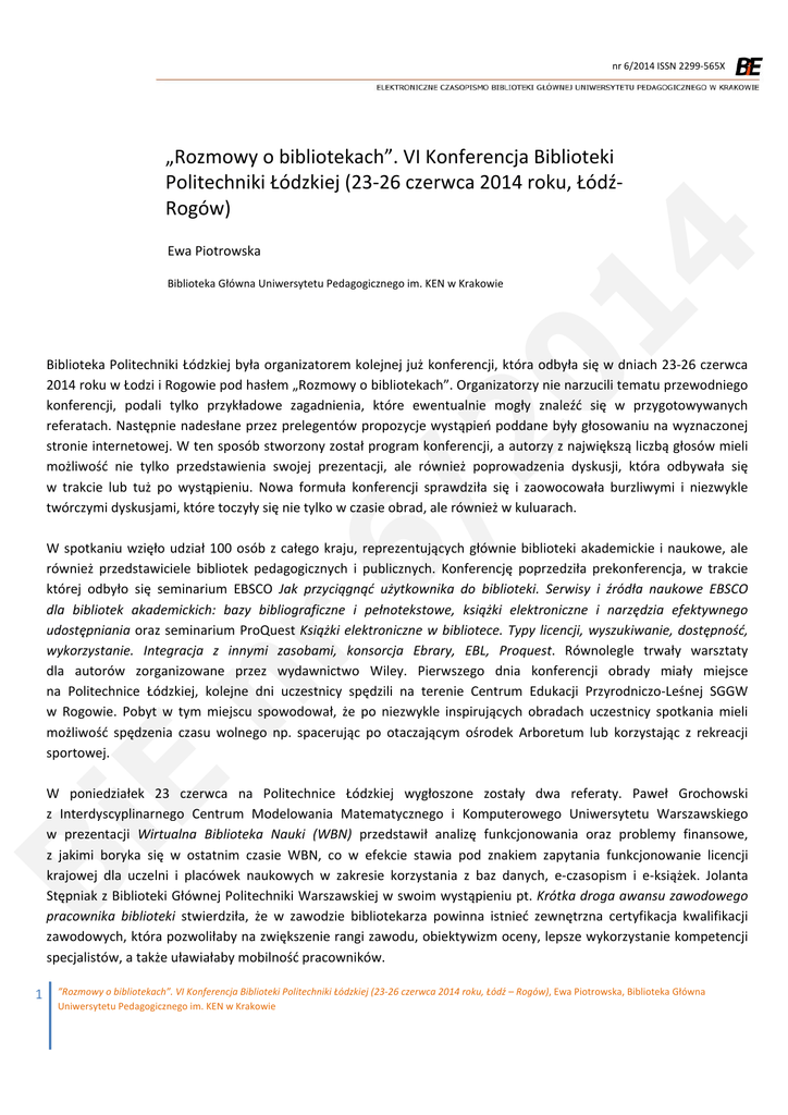 nr 6/2014 ISSN 2299‐565X 14 „Rozmowy o bibliotekach”. VI Konferencja Biblioteki Politechniki Łódzkiej (23‐26 czerwca 2014 roku, Łódź‐ Rogów) Ewa Piotrowska Biblioteka Główna Uniwersytetu Pedagogicznego im. KEN w Krakowie Bi E nr 6/ 20 Biblioteka Politechniki Łódzkiej była organizatorem kolejnej już konferencji, która odbyła się w dniach 23‐26 czerwca 2014 roku w Łodzi i Rogowie pod hasłem „Rozmowy o bibliotekach”. Organizatorzy nie narzucili tematu przewodniego konferencji, podali tylko przykładowe zagadnienia, które ewentualnie mogły znaleźć się w przygotowywanych referatach. Następnie nadesłane przez prelegentów propozycje wystąpień poddane były głosowaniu na wyznaczonej stronie internetowej. W ten sposób stworzony został program konferencji, a autorzy z największą liczbą głosów mieli możliwość nie tylko przedstawienia swojej prezentacji, ale również poprowadzenia dyskusji, która odbywała się w trakcie lub tuż po wystąpieniu. Nowa formuła konferencji sprawdziła się i zaowocowała burzliwymi i niezwykle twórczymi dyskusjami, które toczyły się nie tylko w czasie obrad, ale również w kuluarach. W spotkaniu wzięło udział 100 osób z całego kraju, reprezentujących głównie biblioteki akademickie i naukowe, ale również przedstawiciele bibliotek pedagogicznych i publicznych. Konferencję poprzedziła prekonferencja, w trakcie której odbyło się seminarium EBSCO Jak przyciągnąć użytkownika do biblioteki. Serwisy i źródła naukowe EBSCO dla bibliotek akademickich: bazy bibliograficzne i pełnotekstowe, książki elektroniczne i narzędzia efektywnego udostępniania oraz seminarium ProQuest Książki elektroniczne w bibliotece. Typy licencji, wyszukiwanie, dostępność, wykorzystanie. Integracja z innymi zasobami, konsorcja Ebrary, EBL, Proquest. Równolegle trwały warsztaty dla autorów zorganizowane przez wydawnictwo Wiley. Pierwszego dnia konferencji obrady miały miejsce na Politechnice Łódzkiej, kolejne dni uczestnicy spędzili na terenie Centrum Edukacji Przyrodniczo‐Leśnej SGGW w Rogowie. Pobyt w tym miejscu spowodował, że po niezwykle inspirujących obradach uczestnicy spotkania mieli możliwość spędzenia czasu wolnego np. spacerując po otaczającym ośrodek Arboretum lub korzystając z rekreacji sportowej. W poniedziałek 23 czerwca na Politechnice Łódzkiej wygłoszone zostały dwa referaty. Paweł Grochowski z Interdyscyplinarnego Centrum Modelowania Matematycznego i Komputerowego Uniwersytetu Warszawskiego w prezentacji Wirtualna Biblioteka Nauki (WBN) przedstawił analizę funkcjonowania oraz problemy finansowe, z jakimi boryka się w ostatnim czasie WBN, co w efekcie stawia pod znakiem zapytania funkcjonowanie licencji krajowej dla uczelni i placówek naukowych w zakresie korzystania z baz danych, e‐czasopism i e‐książek. Jolanta Stępniak z Biblioteki Głównej Politechniki Warszawskiej w swoim wystąpieniu pt. Krótka droga awansu zawodowego pracownika biblioteki stwierdziła, że w zawodzie bibliotekarza powinna istnieć zewnętrzna certyfikacja kwalifikacji zawodowych, która pozwoliłaby na zwiększenie rangi zawodu, obiektywizm oceny, lepsze wykorzystanie kompetencji specjalistów, a także uławiałaby mobilność pracowników. 1 ”Rozmowy o bibliotekach”. VI Konferencja Biblioteki Politechniki Łódzkiej (23‐26 czerwca 2014 roku, Łódź – Rogów), Ewa Piotrowska, Biblioteka Główna Uniwersytetu Pedagogicznego im. KEN w Krakowie Bi E nr 6/ 20 14 Następny dzień obrad, które miały już miejsce w Rogowie, rozpoczął się wystąpieniem Pauliny Milewskiej (bibliosferas.net) pt. Jak odstraszyć czytelnika, czyli strony internetowe bibliotek. Prezentacja ta zdobyła najwięcej głosów w głosowaniu środowiska bibliotekarskiego przed konferencją. Wiele nowoczesnych bibliotek, oferujących użytkownikom nowoczesne usługi, posiada przestarzałe strony internetowe tworzone w oparciu o wzory stosowane na początku istnienia Internetu. Negatywnie wpływa też na opinię osób korzystających z tych witryn: ich nieaktualizowanie, umieszczanie niepotrzebnych informacji czy też grafik o niskiej rozdzielczości, stosowanie slangu bibliotecznego niezrozumiałego dla czytelnika i in. Strony internetowe rzutują na wizerunek nie tylko biblioteki, ale również instytucji, do której placówka biblioteczna należy, dlatego powinny one być spójne ze stronami instytucji. Rozwiązaniem może być zlecenie budowy strony firmie zewnętrznej, ustalenie zasad redagowania witryny, a przede wszystkim odpowiedź na pytanie, jakie funkcje ma spełniać strona i komu służyć. W kolejnym wystąpieniu Bożena Jaskowska z Biblioteki Uniwersytetu Rzeszowskiego analizowała główne błędy popełniane przez biblioteki przy tworzeniu profilów na portalach społecznościowych. Podobnie jak w przypadku stron internetowych, ważne jest określenie celów, jakim ma służyć obecność biblioteki w mediach społecznościowych czy też aktualizacja profilu. Krzysztof Lityński (bibliosfera.net) w prezentacji Multiwyszukiwarka, metawyszukiwarka, wyszukiwarka zintegrowana? Uporządkujmy słownictwo starał się ujednolicić terminologię polską dotyczącą narzędzi wyszukiwawczych używanych w bibliotekach. Terminologia ta nie jest precyzyjna, nazewnictwo używane jest bez zrozumienia jego właściwego znaczenia. Dyskusja wywołana w trakcie wystąpienia również nie przyniosła rozstrzygnięcia. Koniecznym wydaje się wprowadzenie standardów stosowanych zarówno przez środowisko bibliotekarzy, jak i przez specjalistów informacji naukowej i bibliotekoznawców. Witold Kozakiewicz z Biblioteki Uniwersytetu Medycznego w Łodzi zaprezentował referat Digitalizacja społeczna jako alternatywa dla bibliotek cyfrowych, w którym poruszył m.in. problemy nielegalnego kopiowania dokumentów przez studentów i łatwość dostępu do tego typu materiałów w Internecie. Gość zagraniczny ‐ J