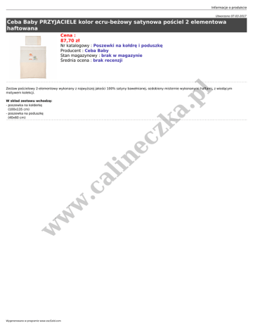 Informacje o produkcie Utworzono 07-03-2017 Ceba Baby PRZYJACIELE kolor ecru-beżowy satynowa pościel 2 elementowa haftowana Cena : 87,70 zł Nr katalogowy : Poszewki na kołdrę i poduszkę Producent : Ceba Baby Stan magazynowy : brak w magazynie Średnia ocena : brak recenzji pl Zestaw pościelowy 2-elementowy wykonany z najwyższej jakości 100% satyny bawełnianej, ozdobiony misternie wykonanymi haftami, z wiodącym motywem kolekcji. w w w .c al in ec zk a. W skład zestawu wchodzą: - poszewka na kołderkę (100x135 cm) - poszewka na poduszkę (40x60 cm) Wygenerowano w programie www.oscGold.com