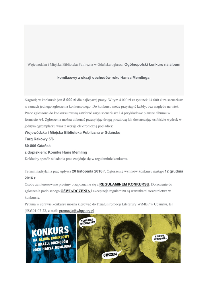 Wojewódzka i Miejska Biblioteka Publiczna w Gdańsku ogłasza Ogólnopolski konkurs na album komiksowy z okazji obchodów roku Hansa Memlinga. Nagrodą w konkursie jest 8 000 zł dla najlepszej pracy. W tym 4 000 zł za rysunek i 4 000 zł za scenariusz w ramach jednego zgłoszenia konkursowego. Do konkursu może przystąpić każdy, bez względu na wiek. Prace zgłoszone do konkursu muszą zawierać zarys scenariusza i 4 przykładowe plansze albumu w formacie A4. Zgłoszenia można dokonać przesyłając drogą pocztową lub dostarczając osobiście wydruk w jednym egzemplarzu wraz z wersją elektroniczną pod adres: Wojewódzka i Miejska Biblioteka Publiczna w Gdańsku Targ Rakowy 5/6 80-806 Gdańsk z dopiskiem: Komiks Hans Memling Dokładny sposób składania prac znajduje się w regulaminie konkursu. Termin nadsyłania prac upływa 20 listopada 2016 r. Ogłoszenie wyników konkursu nastąpi 12 grudnia 2016 r. Osoby zainteresowane prosimy o zapoznanie się z REGULAMINEM KONKURSU. Dołączenie do zgłoszenia podpisanego OŚWIADCZENIA i akceptacja regulaminu są warunkami uczestnictwa w konkursie. Pytania w sprawie konkursu można kierować do Działu Promocji Literatury WiMBP w Gdańsku, tel. (58)301-07-22, e-mail: [email protected]