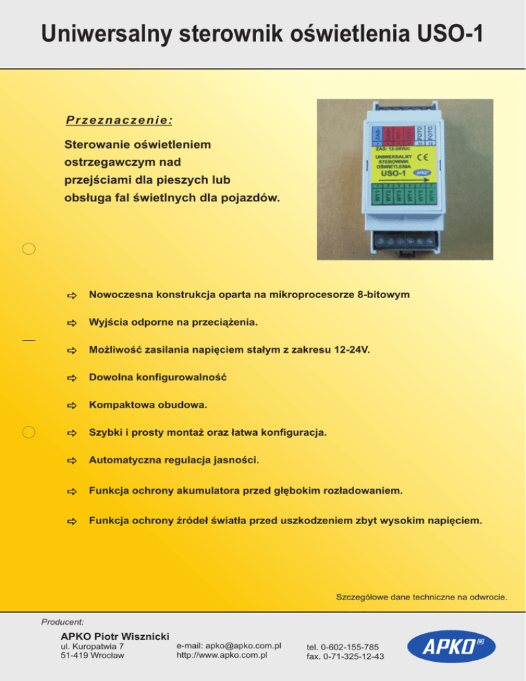 Uniwersalny sterownik oœwietlenia USO-1 Przeznaczenie: Sterowanie oœwietleniem ostrzegawczym nad przejœciami dla pieszych lub obs³uga fal œwietlnych dla pojazdów. Nowoczesna konstrukcja oparta na mikroprocesorze 8-bitowym Wyjœcia odporne na przeci¹¿enia. Mo¿liwoœæ zasilania napiêciem sta³ym z zakresu 12-24V. Dowolna konfigurowalnoœæ Kompaktowa obudowa. Szybki i prosty monta¿ oraz ³atwa konfiguracja. Automatyczna regulacja jasnoœci. Funkcja ochrony akumulatora przed g³êbokim roz³adowaniem. Funkcja ochrony Ÿróde³ œwiat³a przed uszkodzeniem zbyt wysokim napiêciem. Szczegó³owe dane techniczne na odwrocie. Producent: APKO Piotr Wisznicki ul. Kuropatwia 7 51-419 Wroc³aw e-mail: [email protected] http://www.apko.com.pl tel. 0-602-155-785 fax. 0-71-325-12-43 Dane techniczne sterownika USO-1 Schemat pod³¹czenia: Dane techniczne: - Iloœæ wyjœæ: 6 Iloœæ trybów pracy: 8 Napiêcie zasilania: 12 / 24V DC Pr¹d pojedynczego wyjœcia: Iw< 8A Sumaryczny pr¹d zasilania: Iz < 10A Czêstotliwoœæ modulacji PWM: 130Hz IP 20 - wymagana obudowa zewnêtrzna Spe³niane normy: PN-EN: 50293, 55022, 61000-4-2, + ZASILANIE 12/24V DC opc. zwora FOTO 61000-4-3, 61000-4-4, 61000-4-6, 61000-4-20 7 8 9 10 11 12 USO-1 Wyprowadzenia: 1 - wyjœcie 1 - minus 2 - wyjœcie 2 - minus 3 - wyjœcie 3 - minus 4 - wyjœcie 4 - minus 5 - wyjœcie 5 - minus 6 - wyjœcie 6 - minus 1 2 3 4 5 6 7 - zasilanie minus 8 - zasilanie plus 9 - wyjœcia 1,2,3 plus 10 - wyjœcia 4,5,6 plus - - - - - - diody LED lub ¿arówki + 12V/24V + + + + + 11,12 - fotorezystor œciemniania lub zwora kierunek zapalania KONFIGURACJA STEROWNIKA USO-1 on off on 1 2 3 4 5 6 7 8 0 1 2 3 4 5 6 7 A B C D Z L TRYBY PRACY: 0 - pulsator 1 - dwa pulsatory przeciwsobne 2 - dwie fale œwietlne trzy punktowe 3 - fala œwietlna cztero-punktowa + dwa pulsatory przeciwsobne 4 - fala œwietlna piêcio-punktowa + pulsator 5 - fala œwietlna szeœcio-punktowa 6 - fala œwietlna piêcio-punktowa poszerzona + pulsator 7 - fala œwietlna szeœcio-punktowa poszerzona Dystrybucja i sprzeda¿: S N Y X SZYBKOŒÆ PULSOWANIA: A - wysoka JASNOŒÆ NOC¥: S - œrednia B - œrednio wysoka C - œrednio niska D - niska N - niska RODZAJ OBCI¥¯ENIA WYJŒÆ: Z - ¿arówkowe OCHRONA AKUMULATORA I ¯ARÓWEK: X - w³¹czona L - LEDowe Y- wy³¹czona