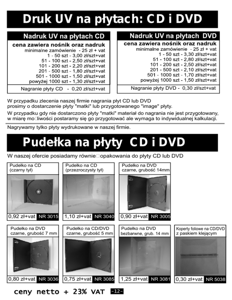Druk UV na płytach: CD i DVD Nagranie płyty DVD - 0,30 zł/szt+vat Nagranie płyty CD - 0,20 zł/szt+vat W przypadku zlecenia naszej firmie nagrania płyt CD lub DVD prosimy o dostarczenie płyty "matki" lub przygotowanego "image" płyty. W przypadku gdy nie dostarczono płyty "matki" materiał do nagrania nie jest przygotowany, w miarę możliwości postaramy się go przygotować ale wymaga to indywidualnej kalkulacji. Nagrywamy tylko płyty wydrukowane w naszej firmie. Pudełka na płyty CD i DVD W naszej ofercie posiadamy również opakowania do płyty CD lub DVD Pudełko na CD (czarny tył) Pudełko na CD (przezroczysty tył) Pudełko na DVD czarne, grubość 14mm 0,92 zł+vat NR 3015 1,10 zł+vat NR 3040 0,90 zł+vat NR 3005 Pudełko na DVD czarne, grubość 7 mm Pudełko na CD/DVD czarne, grubość 5 mm Pudełko na DVD bezbarwne, grub. 14 mm 0,80 zł+vat NR 3036 0,75 zł+vat NR 3085 ceny netto + 23% VAT Koperty foliowe na CD/DVD z paskiem klejącym 1,25 zł+vat NR 3081 0,30 zł+vat NR 5038 -12-