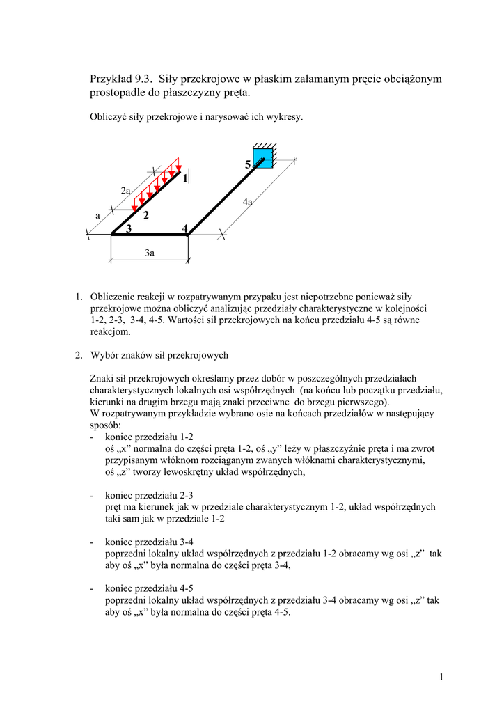 Przykład 9.3. Siły przekrojowe w płaskim załamanym pręcie