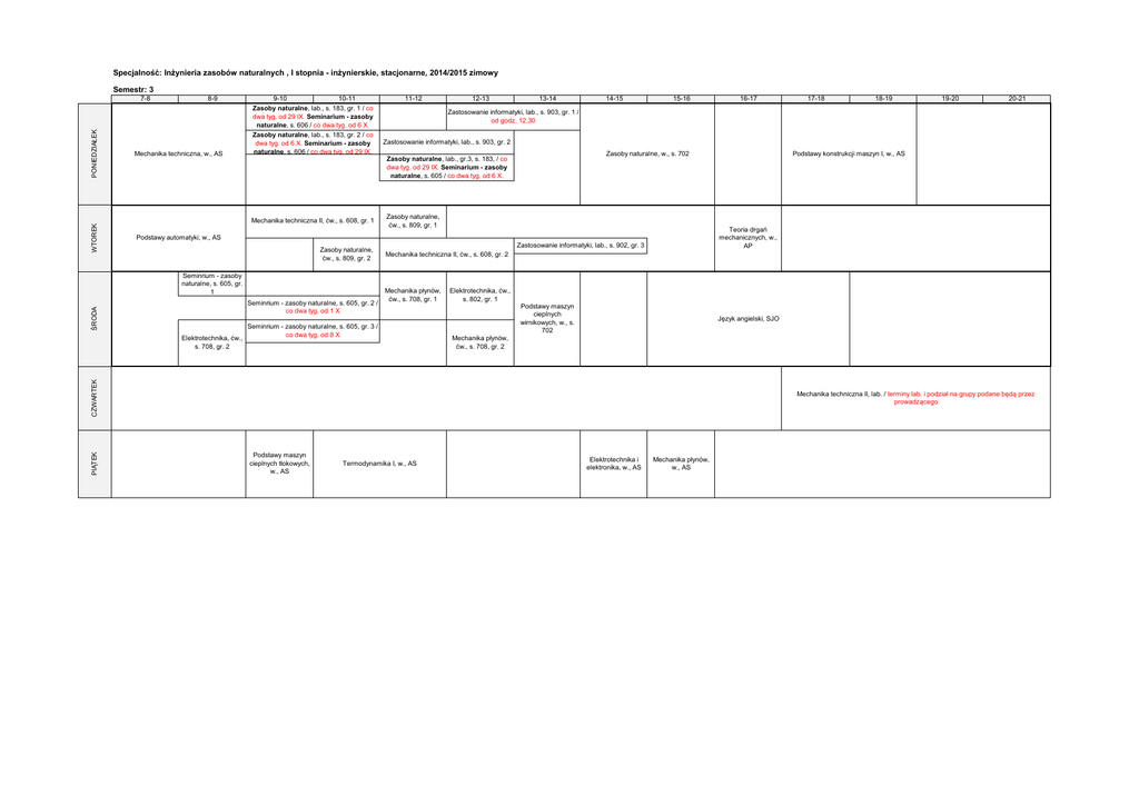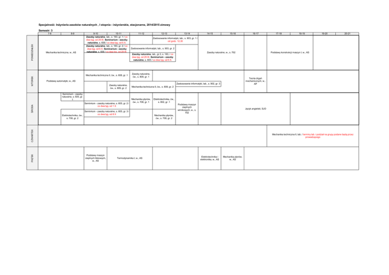 Specjalność: Inżynieria zasobów naturalnych , I stopnia - inżynierskie, stacjonarne, 2014/2015 zimowy Semestr: 3 WTOREK PONIEDZIAŁEK 7-8 8-9 Mechanika techniczna, w., AS 9-10 10-11 Zasoby naturalne, lab., s. 183, gr. 1 / co dwa tyg. od 29 IX. Seminarium - zasoby naturalne, s. 606 / co dwa tyg. od 6 X. Zasoby naturalne, lab., s. 183, gr. 2 / co dwa tyg. od 6 X. Seminarium - zasoby naturalne, s. 606 / co dwa tyg. od 29 IX. Mechanika techniczna II, ćw., s. 608, gr. 1 11-12 12-13 13-14 14-15 15-16 Seminrium - zasoby naturalne, s. 605, gr. 1 ŚRODA Seminrium - zasoby naturalne, s. 605, gr. 2 / co dwa tyg. od 1 X Zasoby naturalne, w., s. 702 Zasoby naturalne, lab., gr.3, s. 183, / co dwa tyg. od 29 IX. Seminarium - zasoby naturalne, s. 605 / co dwa tyg. od 6 X. Zasoby naturalne, ćw., s. 809, gr. 1 PIĄTEK 18-19 19-20 20-21 Podstawy konstrukcji maszyn I, w., AS Teoria drgań mechanicznych, w., AP Zastosowanie informatyki, lab., s. 902, gr. 3 Mechanika techniczna II, ćw., s. 608, gr. 2 Mechanika płynów, ćw., s. 708, gr. 1 Seminrium - zasoby naturalne, s. 605, gr. 3 / co dwa tyg. od 8 X Elektrotechnika, ćw., s. 802, gr. 1 Podstawy maszyn cieplnych wirnikowych, w., s. 702 Język angielski, SJO Mechanika płynów, ćw., s. 708, gr. 2 CZWARTEK Elektrotechnika, ćw., s. 708, gr. 2 17-18 Zastosowanie informatyki, lab., s. 903, gr. 2 Podstawy automatyki, w., AS Zasoby naturalne, ćw., s. 809, gr. 2 16-17 Zastosowanie informatyki, lab., s. 903, gr. 1 / od godz. 12,30 Mechanika techniczna II, lab. / terminy lab. i podział na grupy podane będą przez prowadzącego Podstawy maszyn cieplnych tłokowych, w., AS Termodynamika I, w., AS Elektrotechnika i elektronika, w., AS Mechanika płynów, w., AS