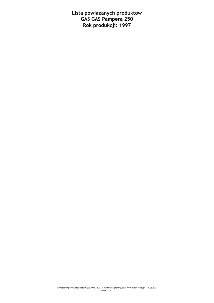 Lista powiazanych produktow GAS GAS Pampera 250 Rok produkcji: 1997 :: Wszelkie prawa zastrzeżone (c) 2002 - 2017 :: [email protected] :: www.italyracing.pl :: 7.03.2017 strona 1 / 1