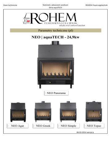 Dane techniczne Kominek z płaszczem wodnym Seria aquaTECH ROHEM-Feuerungstechnik Parametry techniczne (pl) NEO | aquaTECH - 24,9kw NEO Panorama NEO Agat NEO Greek NEO Simple NEO Topaz 06-03-2014 wersja p Dane techniczne Kominek z płaszczem wodnym Seria aquaTECH ROHEM-Feuerungstechnik Dane techniczne Moc całkowita Moc płaszcza wodnego Moc powietrzna Ciężar Pojemność wody Sprawność Maksymalna długość polan Średnica rury dymnej standardowo Płaszcz wewnętrzny Wyłożenie podłogi Zewnętrzny dolot powietrza* Możliwość przyłączenia świeżego powietrza zewnętrznego Maksymalne ciśnienie pracy Kurtyna powietrzna Dopuszczalne paliwa Emisja CO przy 13% tlenu Zawartość pyłu z drewna Numer kontroli Numer DIN EN BimSchV Stufe 1 BimSchV Stufe 2 Numer CH - VKF Znak CE Norma AT §15a B-VG Odstępy od części palnych Palenie ciągłe Dane do obliczenia wielkości komina Przepływ masy gazów spalinowych Temperatura gazów Wymagany ciąg Wielokrotne wykorzystanie komina(typ A1) kW kW kW kg l % cm mm 24,9 20,5 4,4 290 85 ~81 50 180 Wermikulit Szamot Tak (120mm) DUO 3 stronnie- boki i tył bar 2,5 Tak Drewno, brykiety z węgla drzewnego, brykiet węgla brunatnego mg/m³ 1078 mg/m³ 34,22 35/10-LG/2011 EN 13229 Tak Tak Nie Tak Tak cm 8 + 10 izolacji cieplnej Tak g/s °C mPa 16,47 279 12 Opcjonalnie *Ten wkład kominkowy jest zbudowany niezależnie od powietrza otoczenia. Ale nie certyfikat DIBT. Akcesoria opcjonalne Drzwi samozamykające Szyba samoczyszcząca Średnica rury spalinowej(mm)** Wyposażenie dodatkowe Zsyp popiołu pod kominek lub do piwnicy **W zależności od przydatności komina ta opcja jest możliwa. Zastrzegamy sobie prawo do błędów w opisach i parametrach technicznych. Ja Ja 160/180/200 auf Anfrage auf Anfrage Dane techniczne Kominek z płaszczem wodnym Seria aquaTECH ROHEM-Feuerungstechnik