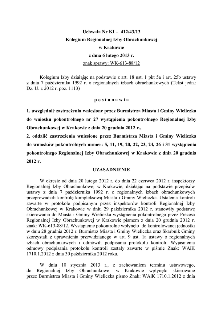 Uchwała Nr KI – 412/43/13 Kolegium Regionalnej Izby Obrachunkowej w Krakowie z dnia 6 lutego 2013 r. znak sprawy: WK-613-88/12 Kolegium Izby działając na podstawie z art. 18 ust. 1 pkt 5a i art. 25b ustawy z dnia 7 października 1992 r. o regionalnych izbach obrachunkowych (Tekst jedn.: Dz. U. z 2012 r. poz. 1113) postanawia 1. uwzględnić zastrzeżenia wniesione przez Burmistrza Miasta i Gminy Wieliczka do wniosku pokontrolnego nr 27 wystąpienia pokontrolnego Regionalnej Izby Obrachunkowej w Krakowie z dnia 20 grudnia 2012 r., 2. oddalić zastrzeżenia wniesione przez Burmistrza Miasta i Gminy Wieliczka do wniosków pokontrolnych numer: 5, 11, 19, 20, 22, 23, 24, 26 i 31 wystąpienia pokontrolnego Regionalnej Izby Obrachunkowej w Krakowie z dnia 20 grudnia 2012 r. UZASADNIENIE W okresie od dnia 20 lutego 2012 r. do dnia 22 czerwca 2012 r. inspektorzy Regionalnej Izby Obrachunkowej w Krakowie, działając na podstawie przepisów ustawy z dnia 7 października 1992 r. o regionalnych izbach obrachunkowych przeprowadzili kontrolę kompleksową Miasta i Gminy Wieliczka. Ustalenia kontroli zawarte w protokole podpisanym przez inspektorów kontroli Regionalnej Izby Obrachunkowej w Krakowie w dniu 29 października 2012 r. stanowiły podstawę skierowania do Miasta i Gminy Wieliczka wystąpienia pokontrolnego przez Prezesa Regionalnej Izby Obrachunkowej w Krakowie pismem z dnia 20 grudnia 2012 r. znak: WK-613-88/12. Wystąpienie pokontrolne wpłynęło do kontrolowanej jednostki w dniu 28 grudnia 2012 r. Burmistrz Miasta i Gminy Wieliczka oraz Skarbnik Gminy skorzystali z uprawnienia przewidzianego w art. 9 ust. 1a ustawy o regionalnych izbach obrachunkowych i odmówili podpisania protokołu kontroli. Wyjaśnienia odmowy podpisania protokołu kontroli zostały zawarte w piśmie Znak: WAiK 1710.1.2012 z dnia 30 października 2012 roku. W dniu 10 stycznia 2013 r., z zachowaniem terminu ustawowego, do Regionalnej Izby Obrachunkowej w Krakowie wpłynęło skierowane przez Burmistrza Miasta i Gminy Wieliczka pismo Znak: WAiK 1710.1.2012 z dnia 10 stycznia 2013 roku wraz z załącznikami, zawierające zastrzeżenia do wniosków pokontrolnych numer: 5, 11, 19, 20, 22, 23, 24, 26, 27 i 31. Kolegium Izby rozpatrując przedmiotowe zastrzeżenia, po przeanalizowaniu treści wystąpienia pokontrolnego Prezesa Regionalnej Izby Obrachunkowej w Krakowie do Burmistrza Miasta i Gminy Wieliczka z dnia 20 grudnia 2012 r. wraz z odpowiednimi ustaleniami kontroli udokumentowanymi w protokole kontroli kompleksowej oraz załącznikami, stwierdziło co następuje: 1. Wniosek pokontrolny nr 5 Wniosek pokontrolny nr 5 brzmiał: „Przestrzeganie zawartych porozumień, w szczególności poprzez ustalanie szczegółowych parametrów realizacji przekazywanej z budżetu Miasta i Gminy Wieliczka dotacji, w terminach wskazanych w porozumieniach”. Powyższy wniosek został sformułowany w związku ze stwierdzoną w wyniku kontroli nieprawidłowością przedstawioną w „opisie nieprawidłowości do wniosku pokontrolnego nr 5”, polegającą na zawarciu aneksów do porozumienia z dnia 20 grudnia 2007 r. zawartego pomiędzy Gminą Miejską Kraków, a Miastem i Gminą Wieliczka, na mocy którego Miasto i Gmina Wieliczka powierzyła Gminie Miejskiej Kraków realizację zadania publicznego w ramach lokalnego transportu zbiorowego po terminie określonym w § 1 pkt 4 (winno być: §1 ust. 4) wyżej wymienionego porozumienia w którym strony porozumienia postanowiły, że ustalenie szczegółowych parametrów usług przewozowych („stawki za 1 wozokm”), dla każdego następnego roku kalendarzowego obowiązywania Porozumienia dokonywane będzie corocznie w terminie do 30 września roku poprzedzającego. Inspektorzy Regionalnej Izby Obrachunkowej w Krakowie stwierdzili, iż aneksy do porozumienia z dnia 20 grudnia 2007 roku, ustalające szczegółowe parametry usług przewozowych na lata: 2009, 2010 i 2011 zostały zawarte odpowiednio: a) na rok 2009 w dniu 7 kwietnia 2009 r. (Aneks Nr 3), b) na rok 2010 w dniu 21 kwietnia 2010 r. (Aneks Nr 5), c) na rok 2011 w dniu 26 kwietnia 2011 r. (Aneks Nr 7). Wnoszący zastrzeżenie do wniosku pokontrolnego nr 5 nie zakwestionował ustaleń faktycznych, ale zarzucił kontrolującemu, że zarówno wniosek pokontrolny, jak również opis nieprawidłowości do wniosku pokontrolnego nie zawiera wskazania przepisu powszechnie obowiązującego prawa, który miał zostać naruszony. W ocenie Burmistrza Miasta i Gminy Wieliczka wniosek pokontrolny ograniczono do nakazu przestrzegania zawartych porozumień w sytuacji, gdy stan faktyczny zawarty zarówno w opisie nieprawidłowości, jak i w § 1 ust. 4 porozumienia międzygminnego z dnia 20 grudnia 2007 r. nie dotyczy ustalania szczegółowych parametrów realizacji przekazywanej z budżetu dotacji, lecz ustalania szczegółowych parametrów usług przewozowych, co wprost wynika z treści § 1 ust. 4 porozumienia, a zatem kwestionowany wniosek pokontrolny nie wynika wprost z ustalonego stanu faktycznego, ani z treści powyższego zapisu porozumienia. Z tych 2 przyczyn zastrzeżenie Burmistrza Miasta i Gminy Wieliczka dotyczy również niewłaściwego zastosowania art. 9 ust. 2 ustawy z dnia 7 października 1992 r. o regionalnych izbach obrachunkowych w związku z zapisami porozumienia międzygminnego zawartego pomiędzy Gminą Miejską Kraków, a Miastem i Gminą Wieliczka. Zgodnie z art. 5 ust. 1 ustawy o regionalnych izbach obrachunkowych, izby kontrolują gospodarkę finansową, w tym realizację zobowiązań podatkowych oraz zamówienia publiczne na podstawie kryterium zgodności z prawem i zgodności dokumentacji ze stanem faktycznym. Analiza art. 5 ust. 1 w związku z art. 9 ust. 2 wyżej wymienionej ustawy pozwala stwierdzić, iż regionalna izba obrachunkowa, która w toku przeprowadzonej kontroli ustaliła nieprawidłowość stosując kryterium zgodności z prawem, powinna we wniosku pokontrolnym lub w opisie nieprawidłowości do wni