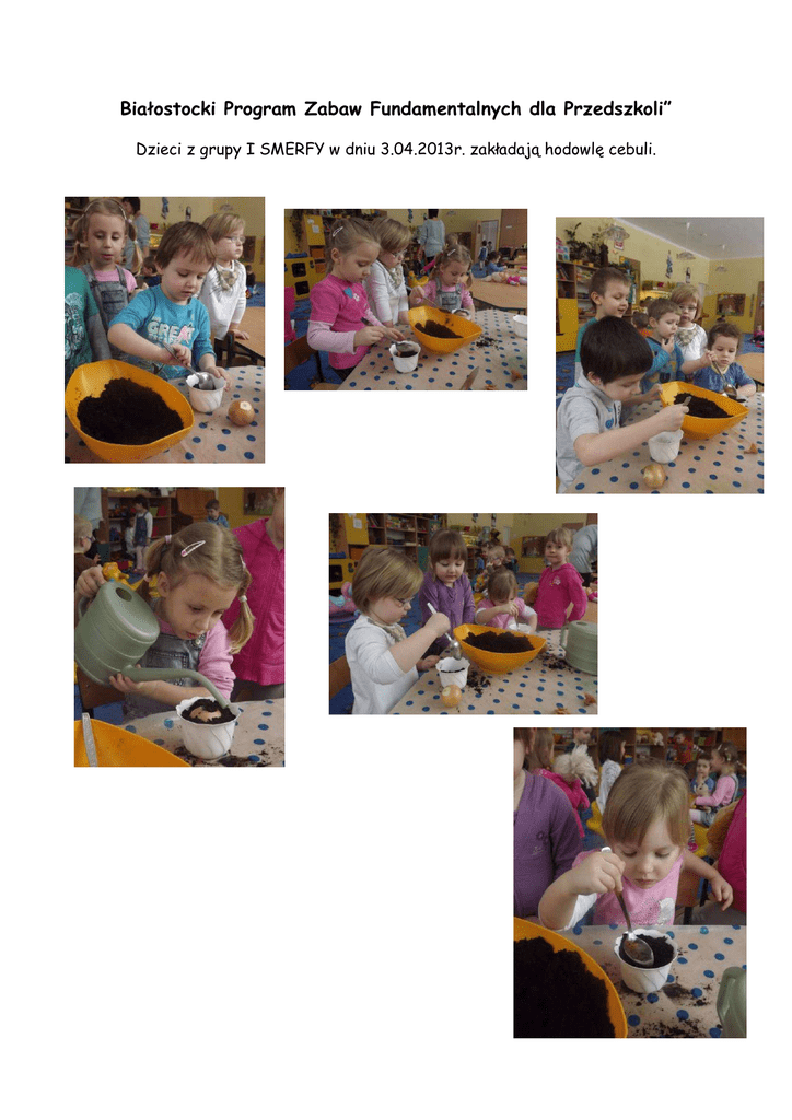 Białostocki Program Zabaw Fundamentalnych dla Przedszkoli” Dzieci z grupy I SMERFY w dniu 3.04.2013r. zakładają hodowlę cebuli.