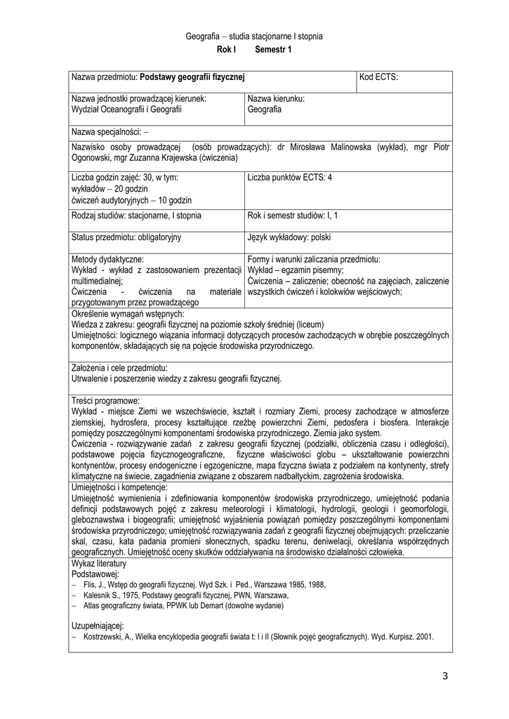 Geografia studia stacjonarne I stopnia Rok I Semestr 1 Nazwa przedmiotu: Podstawy geografii fizycznej Nazwa jednostki prowadzącej kierunek: Wydział Oceanografii i Geografii Kod ECTS: Nazwa kierunku: Geografia Nazwa specjalności: Nazwisko osoby prowadzącej (osób prowadzących): dr Mirosława Malinowska (wykład), mgr Piotr Ogonowski, mgr Zuzanna Krajewska (ćwiczenia) Liczba godzin zajęć: 30, w tym: wykładów 20 godzin ćwiczeń audytoryjnych 10 godzin Liczba punktów ECTS: 4 Rodzaj studiów: stacjonarne, I stopnia Rok i semestr studiów: I, 1 Status przedmiotu: obligatoryjny Język wykładowy: polski Metody dydaktyczne: Formy i warunki zaliczania przedmiotu: Wykład - wykład z zastosowaniem prezentacji Wykład – egzamin pisemny; multimedialnej; Ćwiczenia – zaliczenie; obecność na zajęciach, zaliczenie Ćwiczenia ćwiczenia na materiale wszystkich ćwiczeń i kolokwiów wejściowych; przygotowanym przez prowadzącego Określenie wymagań wstępnych: Wiedza z zakresu: geografii fizycznej na poziomie szkoły średniej (liceum) Umiejętności: logicznego wiązania informacji dotyczących procesów zachodzących w obrębie poszczególnych komponentów, składających się na pojęcie środowiska przyrodniczego. Założenia i cele przedmiotu: Utrwalenie i poszerzenie wiedzy z zakresu geografii fizycznej. Treści programowe: Wykład - miejsce Ziemi we wszechświecie, kształt i rozmiary Ziemi, procesy zachodzące w atmosferze ziemskiej, hydrosfera, procesy kształtujące rzeźbę powierzchni Ziemi, pedosfera i biosfera. Interakcje pomiędzy poszczególnymi komponentami środowiska przyrodniczego. Ziemia jako system. Ćwiczenia - rozwiązywanie zadań z zakresu geografii fizycznej (podziałki, obliczenia czasu i odległości), podstawowe pojęcia fizycznogeograficzne, fizyczne właściwości globu – ukształtowanie powierzchni kontynentów, procesy endogeniczne i egzogeniczne, mapa fizyczna świata z podziałem na kontynenty, strefy klimatyczne na świecie, zagadnienia związane z obszarem nadbałtyckim, zagrożenia środowiska. Umiejętności i kompetencje: Umiejętność wymienienia i zdefiniowania komponentów środowiska przyrodniczego, umiejętność podania definicji podstawowych pojęć z zakresu meteorologii i klimatologii, hydrologii, geologii i geomorfologii, gleboznawstwa i biogeografii; umiejętność wyjaśnienia powiązań pomiędzy poszczególnymi komponentami środowiska przyrodniczego; umiejętność rozwiązywania zadań z geografii fizycznej obejmujących: przeliczanie skal, czasu, kata padania promieni słonecznych, spadku terenu, deniwelacji, określania współrzędnych geograficznych. Umiejętność oceny skutków oddziaływania na środowisko działalności człowieka. Wykaz literatury Podstawowej: Flis, J., Wstęp do geografii fizycznej. Wyd Szk. i Ped., Warszawa 1985, 1988, Kalesnik S., 1975, Podstawy geografii fizycznej, PWN, Warszawa, Atlas geograficzny świata, PPWK lub Demart (dowolne wydanie) Uzupełniającej: Kostrzewski, A., Wielka encyklopedia geografii świata t: I i II (Słownik pojęć geograficznych). Wyd. Kurpisz. 2001. 3