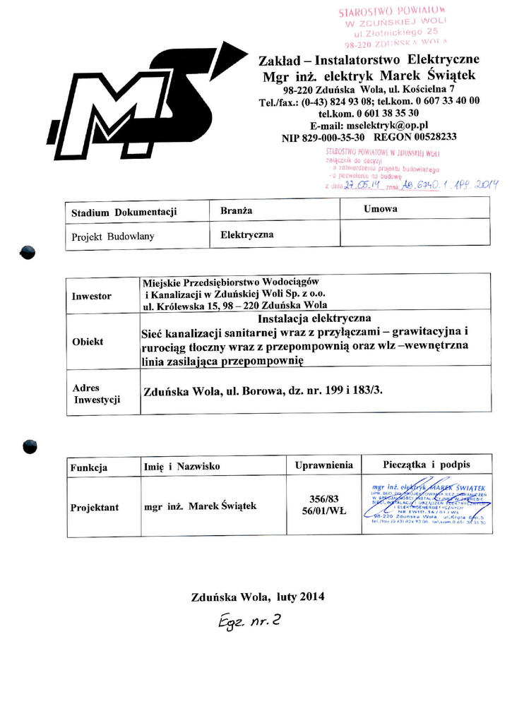 SIAROSiWO VOWIAIOW W ZI;UNSKiEJ VVOLI Ul•ZJotrficl - 'ego 25 A-220 ZDT I Nqk + % V( 1101 A +1 Zaklad — Instalatorstvvo Elektryczne Mgr lid. elektryk Marek wigtek 98-220 Zdutiska Wola, ul. Koicielna 7 Tel./fax.: (0-43) 824 93 08; tel.kom. 0 607 33 40 00 tel.kom. 0 601 38 35 30 E-mail: [email protected] NIP 829-000-35-30 REGON 00528233 STAROSIWO POWIMONit W 21)UN9100 Wuu zalqcznik do decyzji o zatwierdzelou prajektu budowianevu -0 pezwoleolu na budowo Z • • Stadium Dokumentacji Brania Projekt Budowlany Elektryczna dnia-7,C6_ 1t1 ? ,, k A@ _644,0. I ifpf) „.2.100( . Umowa Inwestor Miejskie Przedsigbiorstwo Wodocinow i Kanalizacji w Zdutiskiej Woli Sp. z 0.0. ul. Krolewska 15, 98 — 220 Zdutiska Wola Obiekt Instalacja elektryczna Siee kanalizacji sanitarnej wraz z przylqczami — grawitacyjna i rurociqg tioczny wraz z przepompowniq oraz wlz —wewnctrzna linia zasilajqca przepompownie Adres Inwestycji Zdunska Wola, ul. Borowa, dz. nr. 199 i 183/3. Funkcja In* i Nazwisko Uprawnienia Pieczqtka i podpis 7 mgr int el Projektant mgr ini. Marek wiqtek 356/83 56/01/WL Zdutiska Wola, luty 2014 ,r.2 k A ' gWIATEK UPR. BUD • ...,-,•JE UWA BEI • • • A ZEN W SP' ..., •SC1 STAL• , ,,,,,,,,,, ' • ESIE SI I • LACJ URZA,DZEN t py 1 ELSR ENERGE , ••31+4YD.4 IA4 NE B113. 36 / 01 / vPt • 8 - 220 Zdunska Weal& ui.Kr9la • n.5 toi /toxin 4311124 91 OS 1•41.krun.0 491 3 33 ll, iIAROSIWu POWiAIONVE SPIS TRECI W ZDUNSKIEJ WOLI ul.Z.lotnicklego 25 7...cm:4RKA WOLA Warunki techniczne P.G.E. Dystrybucja S.A. Oddzial Lodi — Teren Nr 1238 /RE03 / 2014 • • - str. 1, 2, - Uzgodnienie ZUDP - str. 3, - Opis techniczny - str. 4 .÷- 5, - 0§wiadczenie projektanta - str. 6 - Schemat elektryczny - str. 7 ÷ 13, - Projekt zagospodarowania terenu - str. 14, - Wykaz wspolrzcdnych - str. 15, - Informacja do planu BIOZ - str. 16, - Uprawnienia budowlane - str. 17, - Za§wiadczenie z LOIIB - str. 18. WP-1 11092013 STAROSTWo row 1A101V. W ZDUNSKIEJ WOLI ul.Ziotnicklego 25 98-226 7nmy 71PCNT A POE Dystrybucia S.A. OddzIal LÔdI - Toren Rejon Energetyczny Sieradz 98-200 Slaradz ul, WoJska Polskiego 98 Tel.. (i-48 43) 828 75 00 Faks: (+48 43) 828 72 02 Email. sieradz.oltgpgedyslnybucja.pl PGE Sieradz, 14/02/2014 r. 03-RP-000445-2014 Zakicznik nr 1 do Umowy Nr 1238/03/2014 o przykezenlo do sled! dystrybucyjnof Miejskie Przedsiqblorstwo Wodociagow Kanalizacji w Zdunskiej Wolf Sp. zo.o. ul. Kn5lewska 15 98-220 Zdufiska Wola Warunki przytqczenia nr 12381RE0312014 dla podmiotu V grupy przytqczeniowej do sieci dystrybucyjnej o napieclu znamionowym 0,4 kV Nazwa obiektu przy4czane90 do sieci: przepompownia tciekow Lokalizacja: ul. Borowa (nr ewid. 18313) Zduriska Wola, gm. ZDUNSKA WOLA Na podstawie rozporzadzenia Ministra Gospodarki z dnia 04 maja 2007r. w sprawie szczegOlowych warunkow funkcjonowania systemu elektroenergetycznego (Dz.U. Ni 93 z 2007r. poz. 623 z pain. zm .), w odpowiedzi na wniosek z dnia 11/02/2014, okretla sic nastcpujace warunki przyiaczenia: 1. Miejsce przytqczenia: stup linii napowietrznej niskiego napiecia. 2. Miejsce dostarczania energii elektrycznej stanowiqce jednoczeSnie miejsce rozgraniczenia wtasnoSci sieci dystrybucyjnej PGE Dystrybucja S.A. i instalacji Podmiotu Przytqczanego: zaciski na listwie zaciskowej za uktadem pomiarowo rozliczeniowym w kierunku instalacji odbiorcy, w ztaczu kablowym zintegrowanym z • uktadem pomiarowo - rozliczeniowym. 3. Moc przylaczeniowa: 7 kW — zasilanie podstawowe 4. Rodzaj przylacza: przytapze kablowe typu YAKXS 4 x 35 mm2. 5. Zakres niezbqdnych zmian w sieci zwiqzanych z przytqczeniem — przytaczenie nie wymaga zmian w sled. 6. Wymagania w zakresie budowy instalacji odbiorcy: instalacja 3 fazowa (My, silowa), rozdziat przewodu ochronno — neutralnego PEN na PE i N naleZy lokalizowad poza ztqczem — w instaIacji odbiorcy (nie dotyczy sled w uktadzie TT). Uziemienie robocze instalacji o rezystancji s300. 7. Miejsce zainstalowania uktadu pomiarowo-rozliczeniowego: szafka ztaczowo pomiarowa w granicy dziatki183/3 z dziatkq 184/1, otwierana od strony ulicy. ..,;• (A ... ivey yk rngr ini. eire 41/11TEK NANICZEN voft. A BE OJE 0 vPR.o ZANNE BIB ACI I 7AL 7.INE ECJA CZNYCN EL . IECI, IN ALAcx I ELEBINOENENCIE JCZN — Ng Ewon.seiot /wk. 913-220 Zdunaku Wale. ..A.Kryta 5m.5 tel ./M n 43197A .)3 115 vol.icnnl,n An I 34 35 30 Gerbarska 21A, wpisana do rejealru przeduztiorctrm POE Dye trybucja Spolk* Altoyjna z Wit:A w Lu8iN1), 20-340 Lublin, ul. Reionowy Luplin-WochOd w Lublinie z 3iodzpbq w Swidniku. VI Wydzire GoSpodarc_ry pod rx NRS 0000343124, ProwAdzonego przez NIP 946-25-93-855, REGON: 0E0552840, Kapaal zaldadowy 9 730 742 890 03w pelni oplocOny www.pcischistrybucjo.pl STAROSTWO VOWIAi W ZDUNSKIEJ WOLI ul.Ziotnickiego 25 98-226 711 r 0;Tc" 8. Wymagania dotyczqce uktadu pomiarowo-rozliczeniowego i systemu pomiaroworozliczeniowego: -licznik indukcyjny do pomiaru bezpotredniego energii czynnej, 3fazowy, jednostrefowy . 9. Rodzaj i usytuowanie zabezpieczenia samoczynny gtOwnego: wytqcznik nadmiarowo - prqdowy 16 A umieszczony w przedziale pomiarowym ztqcza. 10. Jako system dodatkowej ochrony od poraten przyjqo samoczynne wytqczanie zasilania w czasie okreSlonym w obowiqzujqcych normach. Uktad pracy sledi zasilajqcej 0,4 kV: TN-C. 11. Wymagany stosunek poboru energii biernej do czynnej w miejscu dostarczania nie mote by6 wickszy nit tg (4) = 0,4. 12. Poziom zmlenno§ci parametrOw technicznych energii elektrycznej w sled mieci sic w granicach przywotanego wytej Rozporzqdzenia Ministra Gospodarki. • 13. Instalacje i urzqdzenia elektryczne naletace do Odbiorcy powinny zapewnia6 bezpieczenstwo uZytkowania, a przede wszystkim ochronc przed porateniem prqdem elektrycznym oraz ochronc przed przepicciami laczeniowymi i atmosferycznymi wystcpuja.cymi w sieci energetyc,znej, powstaniem potaru, wybuchem i innymi szkodarni. Wszelkie prace winna wykona6 firma posiadajqca uprawnienia budowlane do prowadzenia robot elektrycznych. 14. Informacje dodatko