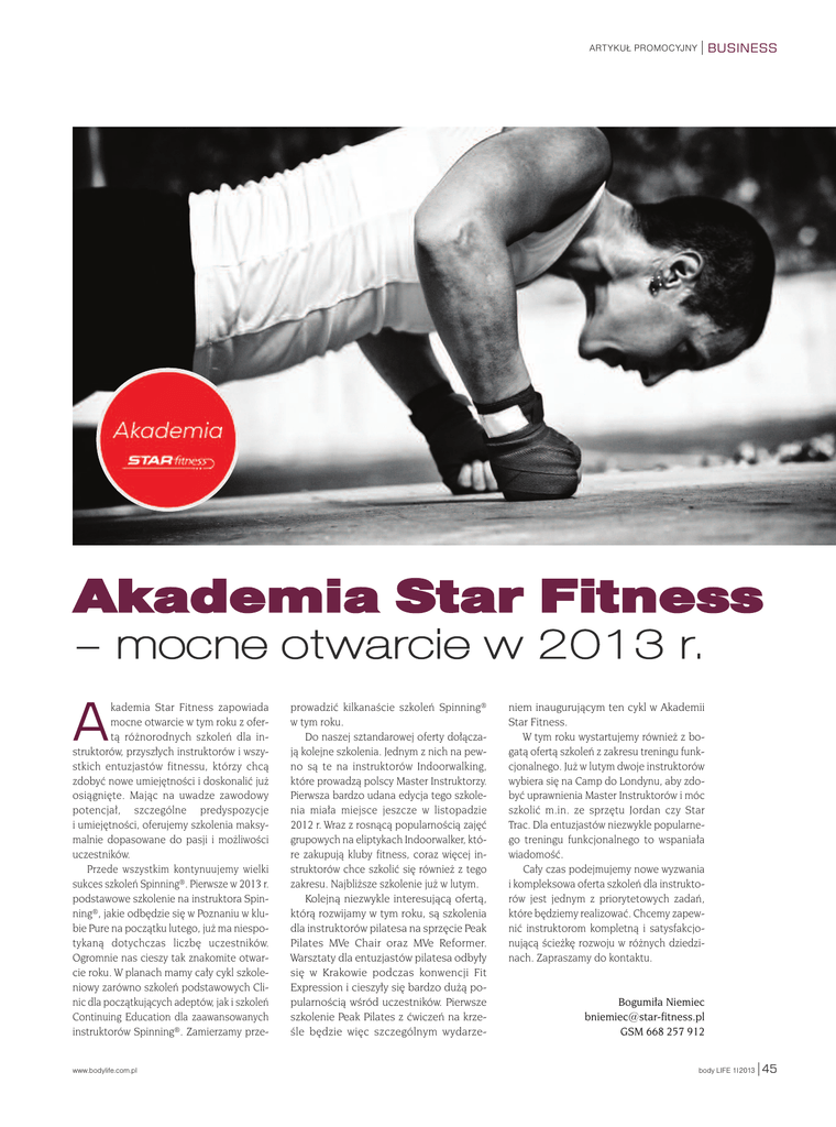 BUSINESS ARTYKUŁ PROMOCYJNY Akademia Star Fitness – mocne otwarcie w 2013 r. A kademia Star Fitness zapowiada mocne otwarcie w tym roku z ofertà ró˝norodnych szkoleƒ dla instruktorów, przysz∏ych instruktorów i wszystkich entuzjastów fitnessu, którzy chcà zdobyç nowe umiej´tnoÊci i doskonaliç ju˝ osiàgni´te. Majàc na uwadze zawodowy potencja∏, szczególne predyspozycje i umiej´tnoÊci, oferujemy szkolenia maksymalnie dopasowane do pasji i mo˝liwoÊci uczestników. Przede wszystkim kontynuujemy wielki sukces szkoleƒ Spinning®. Pierwsze w 2013 r. podstawowe szkolenie na instruktora Spinning®, jakie odb´dzie si´ w Poznaniu w klubie Pure na poczàtku lutego, ju˝ ma niespotykanà dotychczas liczb´ uczestników. Ogromnie nas cieszy tak znakomite otwarcie roku. W planach mamy ca∏y cykl szkoleniowy zarówno szkoleƒ podstawowych Clinic dla poczàtkujàcych adeptów, jak i szkoleƒ Continuing Education dla zaawansowanych instruktorów Spinning®. Zamierzamy prze- www.bodylife.com.pl prowadziç kilkanaÊcie szkoleƒ Spinning® w tym roku. Do naszej sztandarowej oferty do∏àczajà kolejne szkolenia. Jednym z nich na pewno sà te na instruktorów Indoorwalking, które prowadzà polscy Master Instruktorzy. Pierwsza bardzo udana edycja tego szkolenia mia∏a miejsce jeszcze w listopadzie 2012 r. Wraz z rosnàcà popularnoÊcià zaj´ç grupowych na eliptykach Indoorwalker, które zakupujà kluby fitness, coraz wi´cej instruktorów chce szkoliç si´ równie˝ z tego zakresu. Najbli˝sze szkolenie ju˝ w lutym. Kolejnà niezwykle interesujàcà ofertà, którà rozwijamy w tym roku, sà szkolenia dla instruktorów pilatesa na sprz´cie Peak Pilates MVe Chair oraz MVe Reformer. Warsztaty dla entuzjastów pilatesa odby∏y si´ w Krakowie podczas konwencji Fit Expression i cieszy∏y si´ bardzo du˝à popularnoÊcià wÊród uczestników. Pierwsze szkolenie Peak Pilates z çwiczeƒ na krzeÊle b´dzie wi´c szczególnym wydarze- niem inaugurujàcym ten cykl w Akademii Star Fitness. W tym roku wystartujemy równie˝ z bogatà ofertà szkoleƒ z zakresu treningu funkcjonalnego. Ju˝ w lutym dwoje instruktorów wybiera si´ na Camp do Londynu, aby zdobyç uprawnienia Master Instruktorów i móc szkoliç m.in. ze sprz´tu Jordan czy Star Trac. Dla entuzjastów niezwykle popularnego treningu funkcjonalnego to wspania∏a wiadomoÊç. Ca∏y czas podejmujemy nowe wyzwania i kompleksowa oferta szkoleƒ dla instruktorów jest jednym z priorytetowych zadaƒ, które b´dziemy realizowaç. Chcemy zapewniç instruktorom kompletnà i satysfakcjonujàcà Êcie˝k´ rozwoju w ró˝nych dziedzinach. Zapraszamy do kontaktu. Bogumi∏a Niemiec [email protected] GSM 668 257 912 body LIFE 1I 2013 45