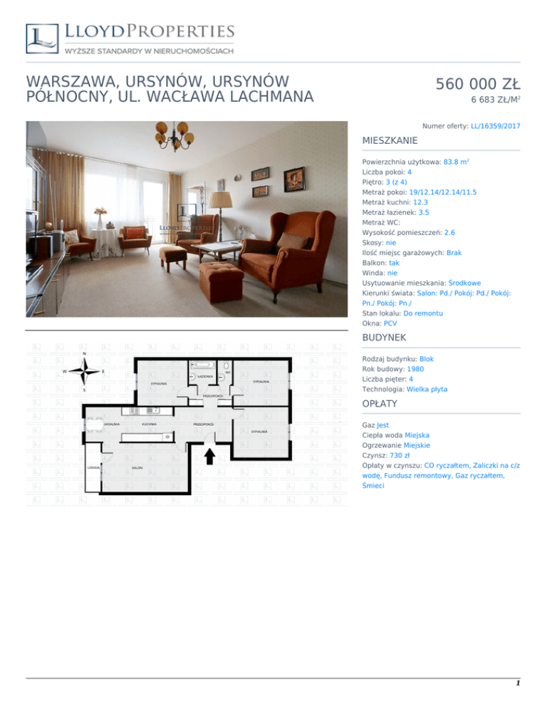 WARSZAWA, URSYNÓW, URSYNÓW PÓŁNOCNY, UL. WACŁAWA LACHMANA 560 000 ZŁ 6 683 ZŁ/M2 Numer oferty: LL/16359/2017 MIESZKANIE Powierzchnia użytkowa: 83.8 m2 Liczba pokoi: 4 Piętro: 3 (z 4) Metraż pokoi: 19/12.14/12.14/11.5 Metraż kuchni: 12.3 Metraż łazienek: 3.5 Metraż WC: Wysokość pomieszczeń: 2.6 Skosy: nie Ilość miejsc garażowych: Brak Balkon: tak Winda: nie Usytuowanie mieszkania: Środkowe Kierunki świata: Salon: Pd./ Pokój: Pd./ Pokój: Pn./ Pokój: Pn./ Stan lokalu: Do remontu Okna: PCV BUDYNEK Rodzaj budynku: Blok Rok budowy: 1980 Liczba pięter: 4 Technologia: Wielka płyta OPŁATY Gaz Jest Ciepła woda Miejska Ogrzewanie Miejskie Czynsz: 730 zł Opłaty w czynszu: CO ryczałtem, Zaliczki na c/z wodę, Fundusz remontowy, Gaz ryczałtem, Śmieci 1 Krzysztof Szymczak Property Expert + 48 533 340 322 [email protected] OPIS Mieszkanie o powierzchni 83,8 m2 składa się z Salonu (19 m2), trzech sypialni (12,14/12,14/11,5 m2), oddzielnej kuchni z jadalnią (12,3 m2), łazienki (3,5 m2), oddzielnego WC (1,2 m2) oraz przedpokoju (13 m2). Bezpośrednio z salonu mamy wyjście na LOGGIĘ (5 m2) z której roztacza się widok na ciche, zielone podwórko. Okna salonu, kuchni oraz jednej z sypialni skierowane są na południe, natomiast pozostałe dwie sypialnie mają ekspozycję północną. Podłogi: w pokojach oraz w przedpokoju leży wykłądzina dywanowa, natomiast w kuchni, łazience i WC terakota. Łazienka wykończona glazurą wyposażona w wannę. Kuchnia zabudowany meblami oraz wyposażona w sprzet AGD: kuchenka gazowa z piekarnikiem, lodówka oraz okap. Czynsz w prezentowanym mieszkaniu wynosi 730 pln przy 1 osobie. Okna zostały wymienione na nowe PCV. Do mieszkania przynależy także PIWNICA (3 m 2). Mieszkanie znajduje się w doskonałym punkcie komunikacyjnym, około 450 metrów od stacji metra Stokłosy, w pobliżu kilka linii autobusowych. W pobliżu znajdują się liczne punkty usługowo-handlowe, apteki, przedszkola, szkoły, banki. W okolicy zlokalizowane są również miejsca rozrywkowe, np.: kawiarnie, kluby fitness, korty tenisowe, basen, centra handlowe. Do Marketu Leclerc mamy jedynie 300 m. Dla miłośników wycieczek rowerowych liczne ściezki z dogodnym dojazdem do Lasu Kabackiego. Osiedle zostało wybudowane w 1982 r. Niedawno wymieniono wszystkie instalacje oraz ocieplono budynek. Pomiędzy blokami znajdują się zielone skwerki oraz mini place parkingowe. Część budynku w której znajduje się mieszkanie jest niska, kameralna 4 pietrowa. Klatki schodowe czyste i zadbane. 2