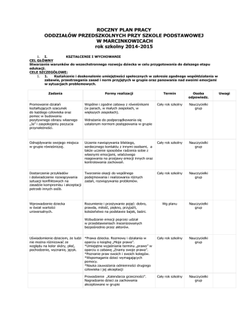 ROCZNY PLAN PRACY ODDZIAŁÓW PRZEDSZKOLNYCH PRZY SZKOLE PODSTAWOWEJ W MARCINKOWICACH rok szkolny 2014-2015 1. I. KSZTAŁCENIE I WYCHOWANIE CEL GŁÓWNY Stwarzanie warunków do wszechstronnego rozwoju dziecka w celu przygotowania do dalszego etapu edukacji. CELE SZCZEGÓŁOWE: 1. 1. Kształcenie i doskonalenie umiejętności społecznych w zakresie zgodnego współdziałania w zabawie, przestrzegania zasad i norm przyjętych w grupie oraz panowania nad swoimi emocjami w sytuacjach problemowych. Zadania Formy realizacji Termin Osoba odpowiedz. Cały rok szkolny Nauczycielki grup Cały rok szkolny Nauczycielki grup Cały rok szkolny Nauczycielki grup Wg planu Nauczycielki grup *Prawa dziecka. Rozmowy i działania w oparciu o książkę „Moje prawa”. *Umiejętne wyjaśnianie terminu „prawo” w oparciu o zabawę „Znamy swoje prawa”. *Poznanie praw swoich i swoich kolegów. *Wspomaganie dzieci wymagających pomocy. *Nauka zauważania odmienności drugiego człowieka i jej akceptacji Cały rok szkolny Nauczycielki grup Prowadzenie „Kalendarza grzeczności”. Nagradzanie dzieci za zachowania akceptowane w grupie Cały rok szkolny Nauczycielki grup Promowanie działań kształtujących szacunek do każdego człowieka oraz pomoc w budowaniu pozytywnego obrazu własnego „Ja” i zaspokojeniu poczucia przynależności. Wspólne i zgodne zabawy z rówieśnikami (w parach, w małych zespołach, w większych zespołach). Odnajdywanie swojego miejsca w grupie rówieśniczej. Uczenie nawiązywania bliskiego, serdecznego kontaktu z innymi osobami, a także uczenie sposobów radzenia sobie z własnymi emocjami, właściwego reagowania na przejawy emocji innych oraz kontrolowania zachowań. Wdrażanie do podporządkowania się ustalonym normom postępowania w grupie Dostarczenie przykładów Tworzenie okazji do wspólnego i doświadczenie rozwiązywania podejmowania i realizowania różnych sytuacji konfliktowych na zadań, rozwiązywania problemów. zasadzie kompromisu i akceptacji potrzeb innych osób. Wprowadzenie dziecka w świat wartości uniwersalnych. Rozumienie i przeżywanie pojęć: dobro, prawda, miłość, piękno, przyjaźń, koleżeństwo na podstawie bajek, baśni. Wzbudzanie emocji poprzez udział w przedstawieniach inscenizowanych bezpośrednio przez aktorów. Uświadomienie dzieciom, że ludzi nie można różnicować ze względu na kolor skóry, płeć, pochodzenie, wyznanie, język. Uwagi 1. 2. Wspieranie dzieci w rozwijaniu czynności intelektualnych, tj. doskonaleniu słuchu fonematycznego, koordynacji wzrokowo – ruchowej, budzeniu zainteresowań czytelniczych, kształtowaniu pojęć matematycznych oraz sprawności manualnej. Zadania Formy realizacji Organizowanie procesu edukacyjnego, wspomagającego osiągnięcie dojrzałości szkolnej przez dzieci 1. Osoba odpowiedz. Opracowanie przedszkolnego zestawu programów na rok szkolny 2014/2015. VI Dyrektor nauczyciele Indywidualizacja pracy z dziećmi o specjalnych potrzebach edukacyjnych i dziećmi zdolnymi nauczyciele cały rok Aranżowanie sytuacji sprzyjających rozwijaniu twórczej aktywności poprzez: formy sceniczne (prezentacje na terenie szkoły ), poszerzenie doświadczeń plastyczno - konstrukcyjnych ( wystawy prac), ekspresję muzyczną (i inne formy. nauczyciele, cały rok Przygotowanie materiałów dydaktycznych do realizacji planowanych działań. Nauczyciele cały rok Dostarczanie różnych źródeł inspiracji do rozwijania aktywności. Nauczyciele cały rok Prowadzenie zajęć rytmika, zabaw logopedycznych Instruktor, logopeda cały rok Umożliwienie uczniom udziału w konkursach międzygrupowych Nauczyciele cały rok Organizacja międzygrupowego quizu „Przedszkolny Omnibus”. Prowadzenie działalności diagnostycznej dotyczącej rozwoju dzieci Termin nauczyciele Uwagi Wg harmonogramu V Opracowanie indywidualnych programów wsparcia i korygowania rozwoju w oparciu o wyniki diagnozy przedszkolnej nauczyciele cały rok Obserwacja pedagogiczna wstępna IX nauczyciele Diagnoza gotowości szkolnej XI, IV nauczyciele 3. Budowanie pozytywnych relacji pomiędzy dziećmi oraz czuwanie nad kształtowaniem samodzielności w bezpiecznym poruszaniu się po budynku i terenie wokół szkoły. Zadania Poznawanie zasad warunkujących bezpieczeństwo na terenie szkoły i placu zabaw. Formy realizacji Zaznajamianie dzieci z rozkładem pomieszczeń szkolnych, omówienie zasad bezpiecznego poruszania się po budynku. Przyzwyczajanie dzieci do przestrzegania ustalonych zakazów i nakazów. Zapoznanie dzieci z właściwym użytkowaniem zabawek oraz różnych materiałów, przyborów i narzędzi. Przyzwyczajanie dzieci do przestrzegania ustalonych zasad w czasie pobytu na placu zabaw. Termin Osoba odpowiedz. Cały rok szkolny Nauczycielki grup Uwagi Przyzwyczajanie dzieci do zgłaszania nauczycielce uszkodzeń różnych przedmiotów, które mogą zagrażać bezpieczeństwu. Przyzwyczajanie dzieci do zgłaszania nauczycielce swoich dolegliwości, złego samopoczucia. Zapoznanie dzieci z podstawowymi zasadami poruszania się po drogach podczas codziennych spacerów oraz w oparciu o literaturę. Zapoznanie dzieci z podstawowymi znakami drogowymi, przybliżenie dzieciom zawodu policjanta. Spotkanie z przedstawicielami policji, wzbudzenie zaufania do policjanta, jako osoby mogącej pomóc dziecku. Poznanie alarmowych numerów telefonów przez dzieci : 997 – policja, 998 – straż pożarna, 999 – pogotowie ratunkowe; próbna ewakuacja. Poznawanie zasad warunkujących bezpieczeństwo dziecka poza terenem przedszkola. Zaznajamianie dzieci z zasadami Przeciwpożarowymi; uświadomienie niebezpieczeństw wynikających z zabaw niebezpiecznymi przedmiotami . Wg planu Nauczycielki grup Rozmowy z dziećmi na temat zachowania się w sytuacjach trudnych, np. zagubienie się w tłumie, unikanie kontaktów z obcym. 4.Kształcenie zachowań prozdrowotnych Zadania Formy realizacji Termin Odpowiedz. Uwagi Wspomaganie rozwoju ruchowego Kszta
