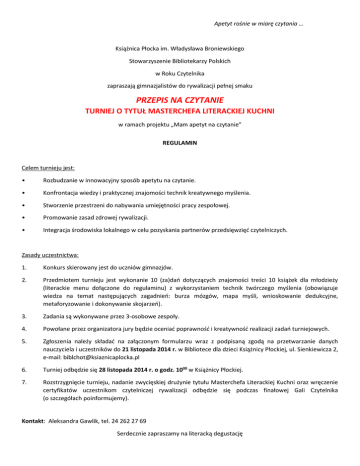 Apetyt rośnie w miarę czytania … Książnica Płocka im. Władysława Broniewskiego Stowarzyszenie Bibliotekarzy Polskich w Roku Czytelnika zapraszają gimnazjalistów do rywalizacji pełnej smaku PRZEPIS NA CZYTANIE TURNIEJ O TYTUŁ MASTERCHEFA LITERACKIEJ KUCHNI w ramach projektu „Mam apetyt na czytanie” REGULAMIN Celem turnieju jest: • Rozbudzanie w innowacyjny sposób apetytu na czytanie. • Konfrontacja wiedzy i praktycznej znajomości technik kreatywnego myślenia. • Stworzenie przestrzeni do nabywania umiejętności pracy zespołowej. • Promowanie zasad zdrowej rywalizacji. • Integracja środowiska lokalnego w celu pozyskania partnerów przedsięwzięć czytelniczych. Zasady uczestnictwa: 1. Konkurs skierowany jest do uczniów gimnazjów. 2. Przedmiotem turnieju jest wykonanie 10 (za)dań dotyczących znajomości treści 10 książek dla młodzieży (literackie menu dołączone do regulaminu) z wykorzystaniem technik twórczego myślenia (obowiązuje wiedza na temat następujących zagadnień: burza mózgów, mapa myśli, wnioskowanie dedukcyjne, metaforyzowanie i dokonywanie skojarzeń). 3. Zadania są wykonywane przez 3-osobowe zespoły. 4. Powołane przez organizatora jury będzie oceniać poprawność i kreatywność realizacji zadań turniejowych. 5. Zgłoszenia należy składać na załączonym formularzu wraz z podpisaną zgodą na przetwarzanie danych nauczyciela i uczestników do 21 listopada 2014 r. w Bibliotece dla dzieci Książnicy Płockiej, ul. Sienkiewicza 2, e-mail: [email protected] 6. Turniej odbędzie się 28 listopada 2014 r. o godz. 1000 w Książnicy Płockiej. 7. Rozstrzygnięcie turnieju, nadanie zwycięskiej drużynie tytułu Masterchefa Literackiej Kuchni oraz wręczenie certyfikatów uczestnikom czytelniczej rywalizacji odbędzie się podczas finałowej Gali Czytelnika (o szczegółach poinformujemy). Kontakt: Aleksandra Gawlik, tel. 24 262 27 69 Serdecznie zapraszamy na literacką degustację LITERACKIE MENU 1. Bąkiewicz Grażyna, Syn złodziejki 2. Ciwoniuk Barbara, Rokko 3. Fox Marta, Cafe Plotka 4. Gutowska- Adamczyk Małgorzata, 13. Poprzeczna 5. Karwan-Jastrzębska Ewa, Misja Feniks 6. Kosmowska Barbara, Pozłacana rybka 7. Łacina Anna, Czynnik miłości 8. Nowak Ewa, Ogon Kici 9. Onichimowska Anna, Dziesięć stron świata 10. Ruiz Zafon Carlos, Marina Formularz zgłoszeniowy na konkurs Przepis na czytanie – turniej o tytuł Masterchefa Literackiej Kuchni I. Imiona i nazwiska uczniów, biorących udział w turnieju oraz klasa, do której uczęszczają: 1. …………………………………………………………………………………………………. 2. …………………………………………………………………………………………………. 3. …………………………………………………………………………………………………. II. Imię i nazwisko nauczyciela przygotowującego uczniów do turnieju ………………………………………………………………………………………………….. III. Nazwa i adres szkoły …………………………………………………………………………………………….......... Zgoda na przetwarzanie danych osobowych nauczyciela uczniów biorących udział w turnieju ……………………………………………………………………………………………………………………………………………………………………….. imię i nazwisko nauczyciela oraz nazwa i adres placówki Wyrażam zgodę na przetwarzanie moich danych osobowych przez Książnicę Płocką im. Władysława Broniewskiego w Płocku na potrzeby organizacji turnieju PRZEPIS NA CZYTANIE zgodnie z art. 23 ust. 1 pkt.1 ustawy z 29 sierpnia 1997 o ochronie danych osobowych (tekst jednolity: Dz. U. z 2002 r. nr 101, poz. 926 ze zm.). Podanie danych jest dobrowolne. Podającym dane przysługuje prawo do wglądu i poprawiania swoich danych. Administratorem danych osobowych jest Książnica Płocka im. Władysława Broniewskiego w Płocku. Administrator danych zapewnia ochronę podanych danych osobowych. Dane osobowe będą przekazywane wyłącznie podmiotom uprawnionym do ich otrzymania na podstawie przepisów prawa lub na podstawie umowy powierzenia przetwarzania danych osobowych w oparciu o wyrażone zgody. Ponadto wyrażam zgodę na nieodpłatne wykorzystanie mojego wizerunku, zgodnie z art. 81 ust. 1 ustawy z dnia 4 lutego 1994 r. o prawie autorskim i prawach pokrewnych. (tekst jednolity Dz. U. z 2000 r. nr 80 poz. 904) Niniejsza zgoda dotyczy w szczególności wykorzystania wizerunku poprzez zamieszczenie fotografii, danych osobowych w zakresie imienia i nazwiska i miejsca pracy uczestnika konkursu w publikacji na stronie internetowej Książnicy Płockiej im Władysława Broniewskiego w Płocku. Niniejsza zgoda nie jest ograniczona czasowo ani terytorialnie. ……………………………………………………………. Data i podpis nauczyciela Zgoda na przetwarzanie danych osobowych uczestnika turnieju Wyrażam zgodę na przetwarzanie danych osobowych mojego dziecka ……………………………………………………………………………………………………………………… imię i nazwisko uczestnika przez Książnicę Płocką im. Władysława Broniewskiego w Płocku na potrzeby organizacji turnieju PRZEPIS NA CZYTANIE zgodnie z art. 23 ust. 1 pkt.1 ustawy z 29 sierpnia 1997 r. o ochronie danych osobowych (tekst jednolity: Dz. U. z 2002 r. nr 101, poz. 926 ze zm.). Podanie danych jest dobrowolne. Podającym dane przysługuje prawo do wglądu i poprawiania swoich danych. Administratorem danych osobowych jest Książnica Płocka im. Władysława Broniewskiego w Płocku. Administrator danych zapewnia ochronę podanych danych osobowych. Dane osobowe będą przekazywane wyłącznie podmiotom uprawnionym do ich otrzymania na podstawie przepisów prawa lub 