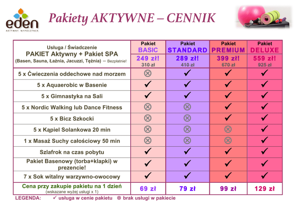 Pakiety AKTYWNE – CENNIK Usługa / Świadczenie PAKIET Aktywny + Pakiet SPA (Basen, Sauna, Łaźnia, Jacuzzi, Tężnia) – Bezpłatnie! 5 x Ćwieczenia oddechowe nad morzem 5 x Aquaerobic w Basenie 5 x Gimnastyka na Sali 5 x Nordic Walking lub Dance Fitness 5 x Bicz Szkocki 5 x Kąpiel Solankowa 20 min 1 x Masaż Suchy całościowy 50 min Szlafrok na czas pobytu Pakiet Basenowy (torba+klapki) w prezencie! 7 x Sok witalny warzywno-owocowy Cena przy zakupie pakietu na 1 dzień (wskazane wyżej usługi x 1) LEGENDA: Pakiet BASIC 249 zł! Pakiet Pakiet Pakiet STANDARD PREMIUM DELUXE 289 zł! 399 zł! 559 zł! 310 zł 410 zł 670 zł 925 zł V ü ü V V V V ü ü ü ü ü ü V V V V ü ü ü ü ü ü ü ü V V ü ü ü ü ü ü ü ü ü ü ü ü ü 69 zł 79 zł 99 zł 129 zł ü usługa w cenie pakietu V brak usługi w pakiecie